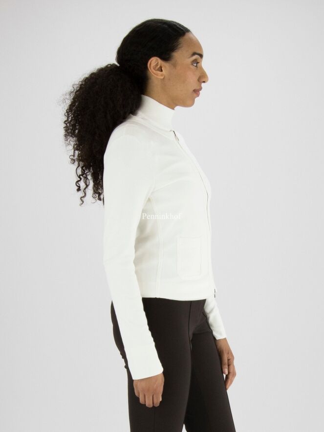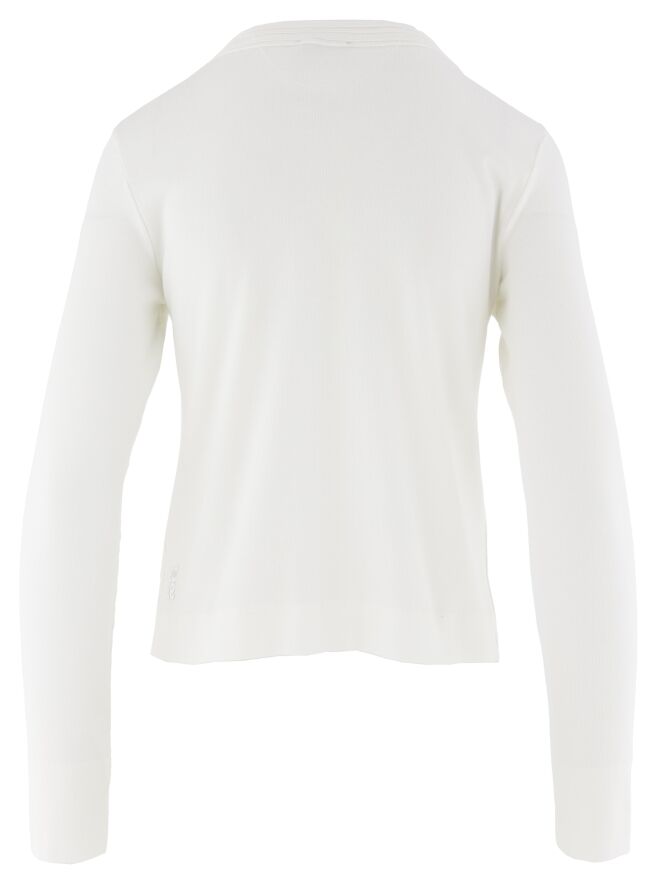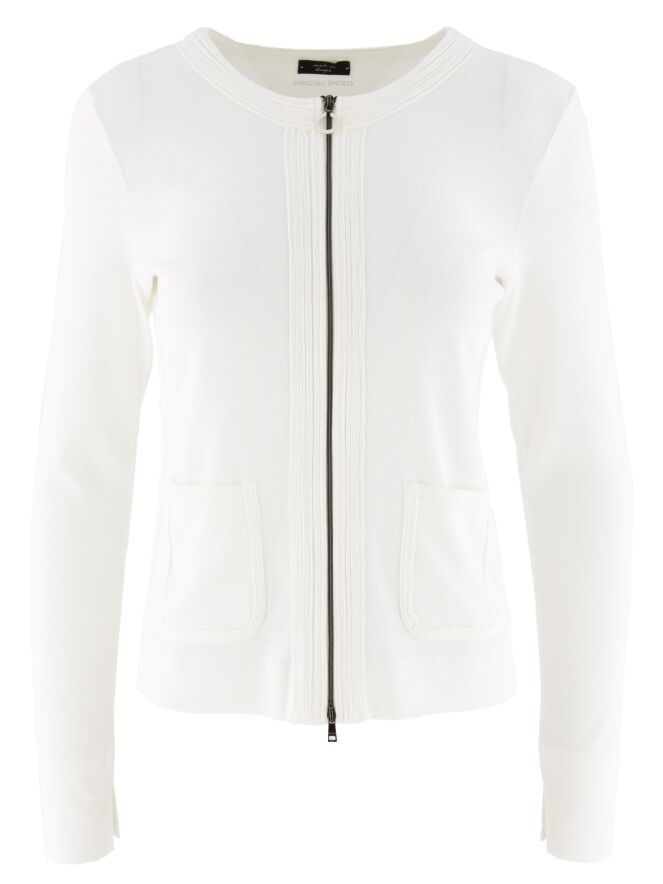 A cardigan from the brand Marc Cain in the color cream white. The cardigan has long sleeves and a round neckline. A ribbed band runs along the neck and the zipper. At the end of the sleeves is a short split. This vest can be washed at 30 degrees.