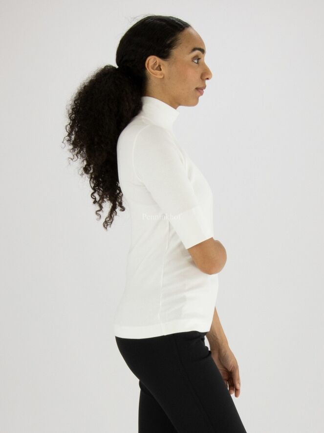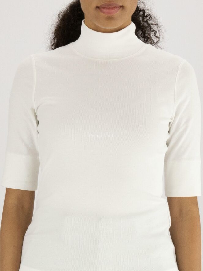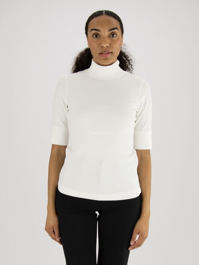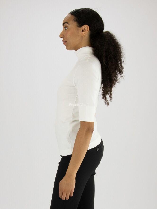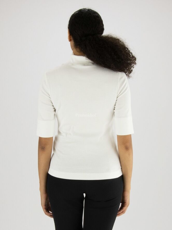 A shirt from the brand Marc Cain in the color cream white. The shirt has short sleeves and a turtleneck. This shirt can be washed at 30 degrees.