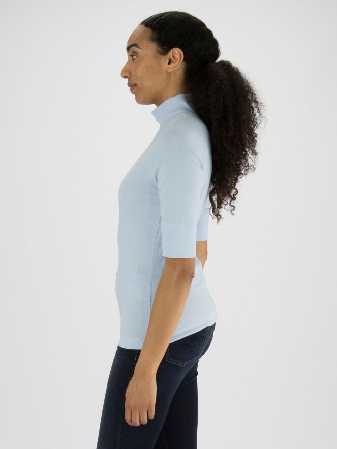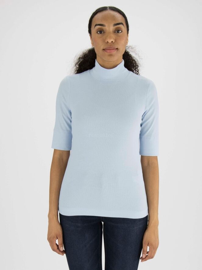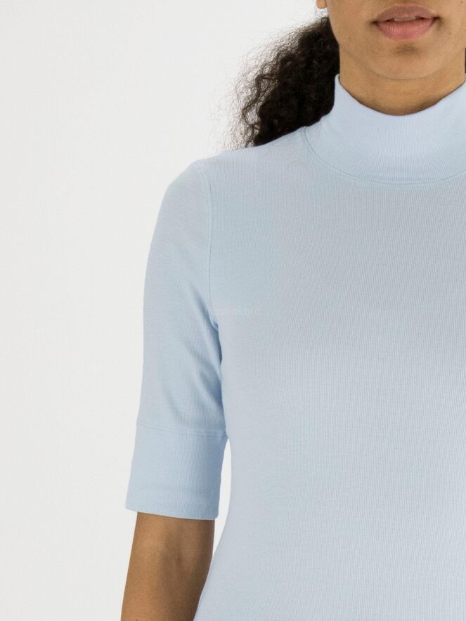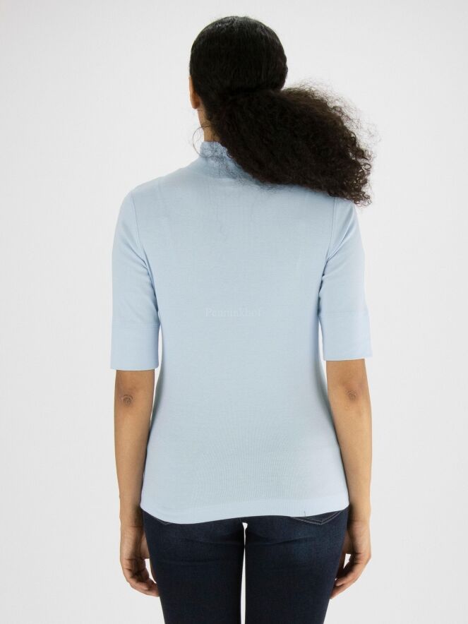 A shirt from the brand Marc Cain in the color pastel blue. The shirt has short sleeves and a turtleneck. This shirt can be washed at 30 degrees.