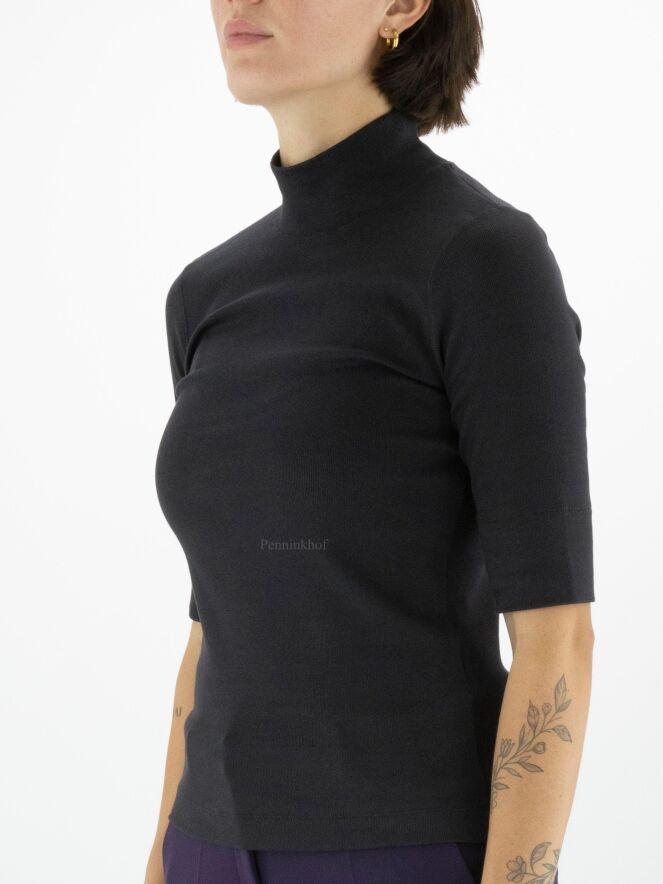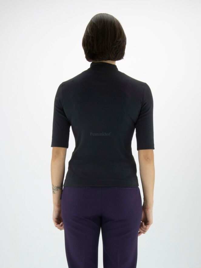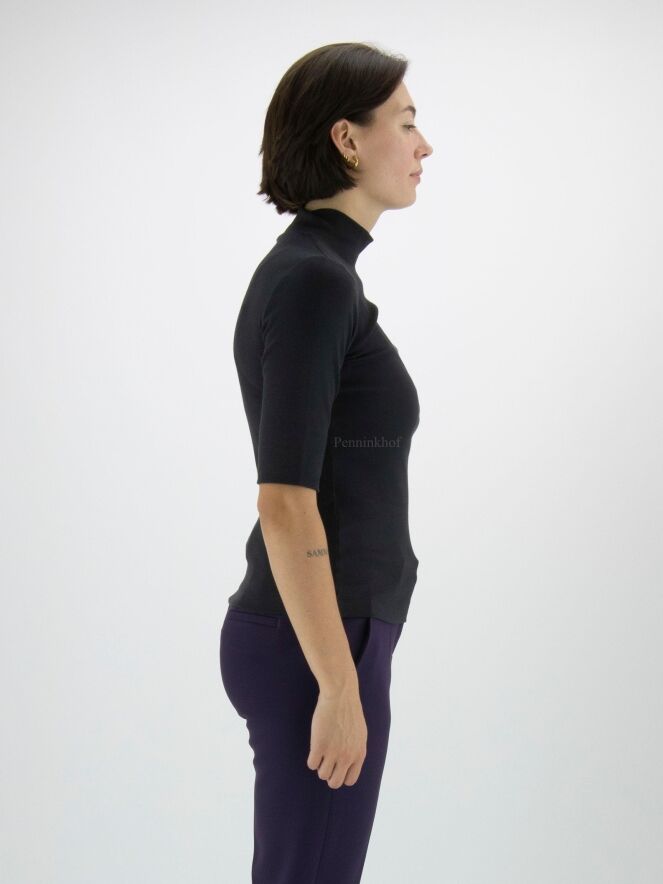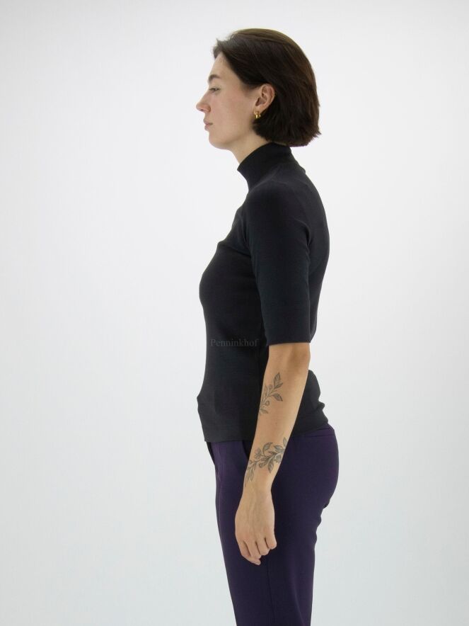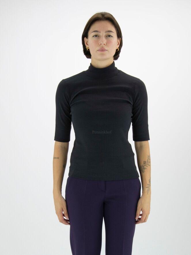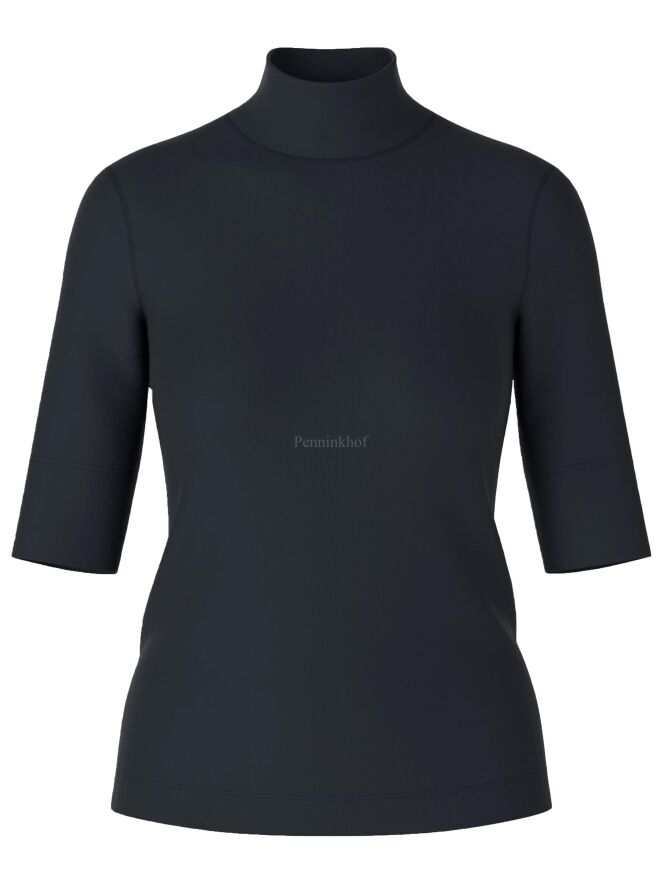 A shirt from Marc Cain in the colour navy blue. The shirt has short sleeves and a turtle neck. This shirt may be washed at 30 degrees.