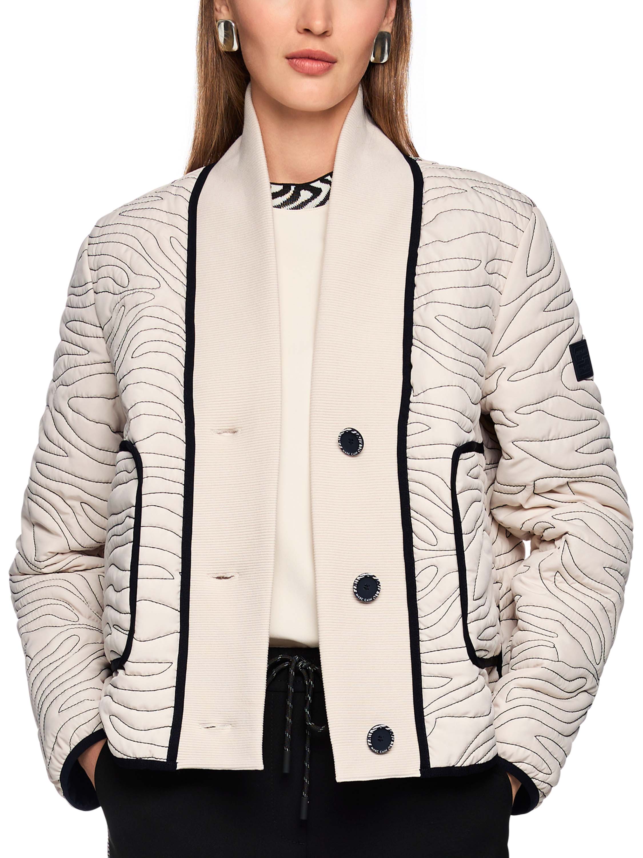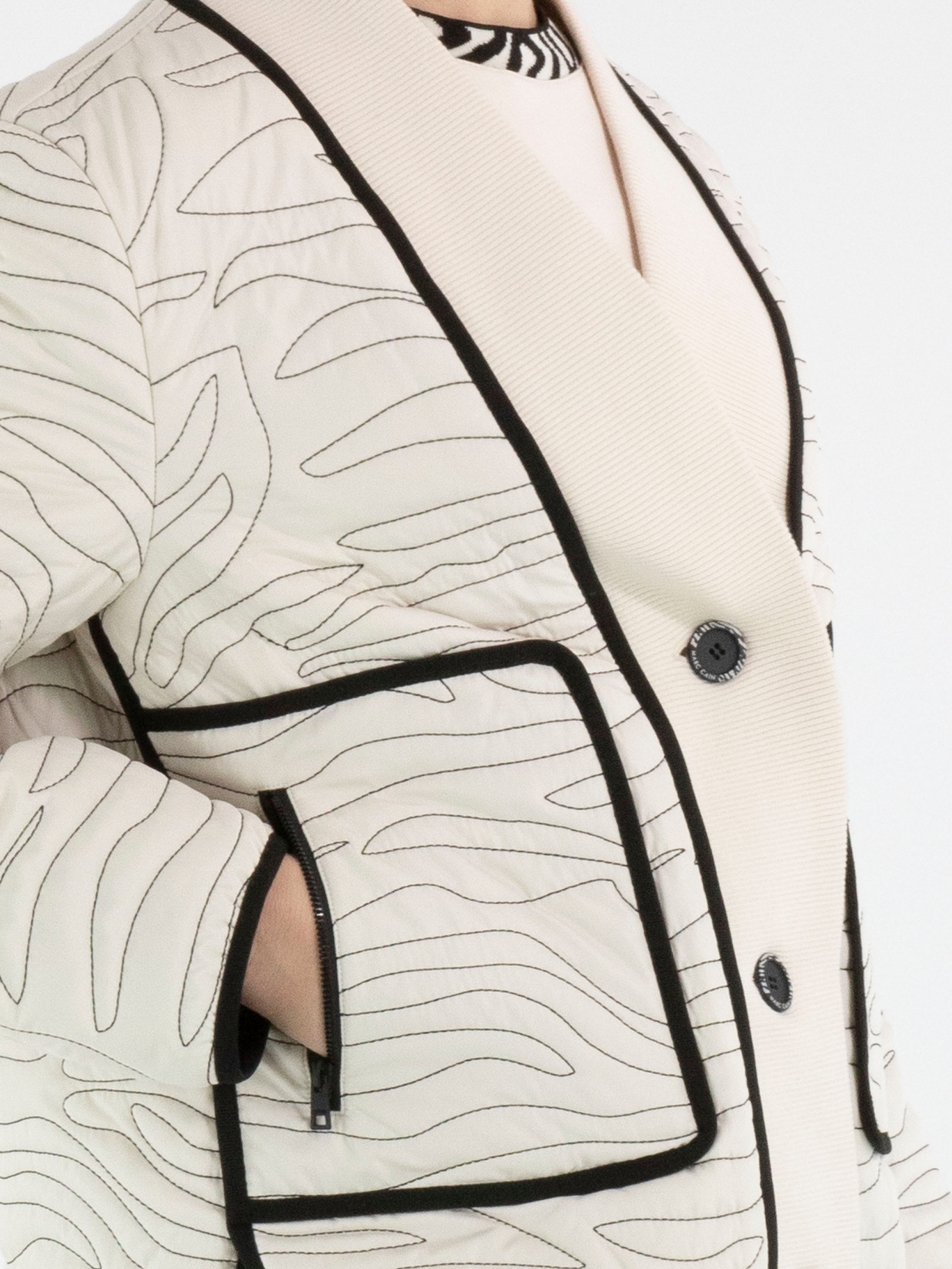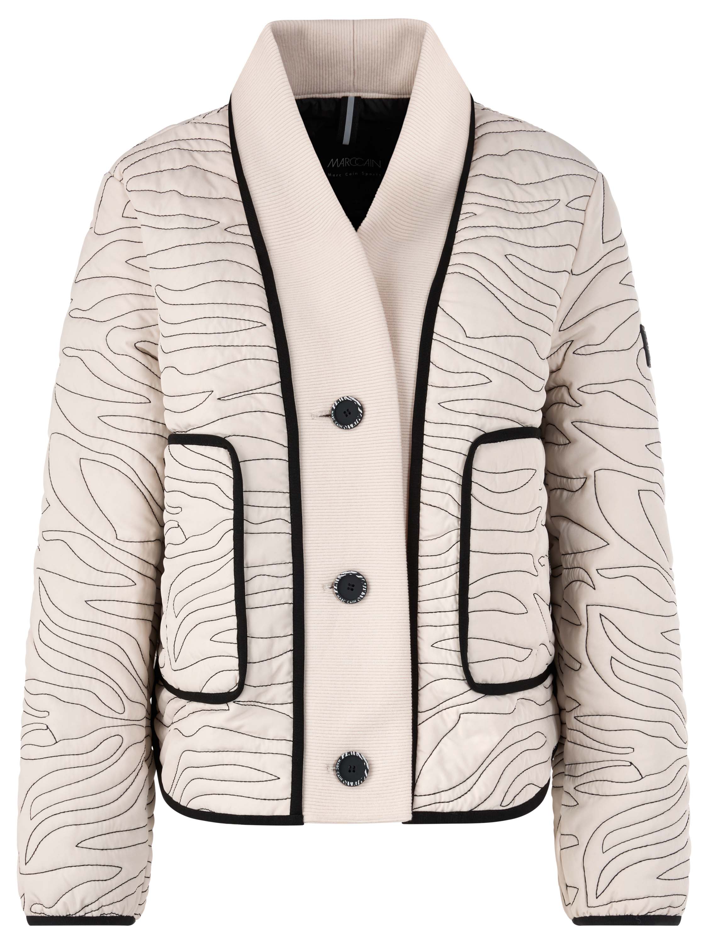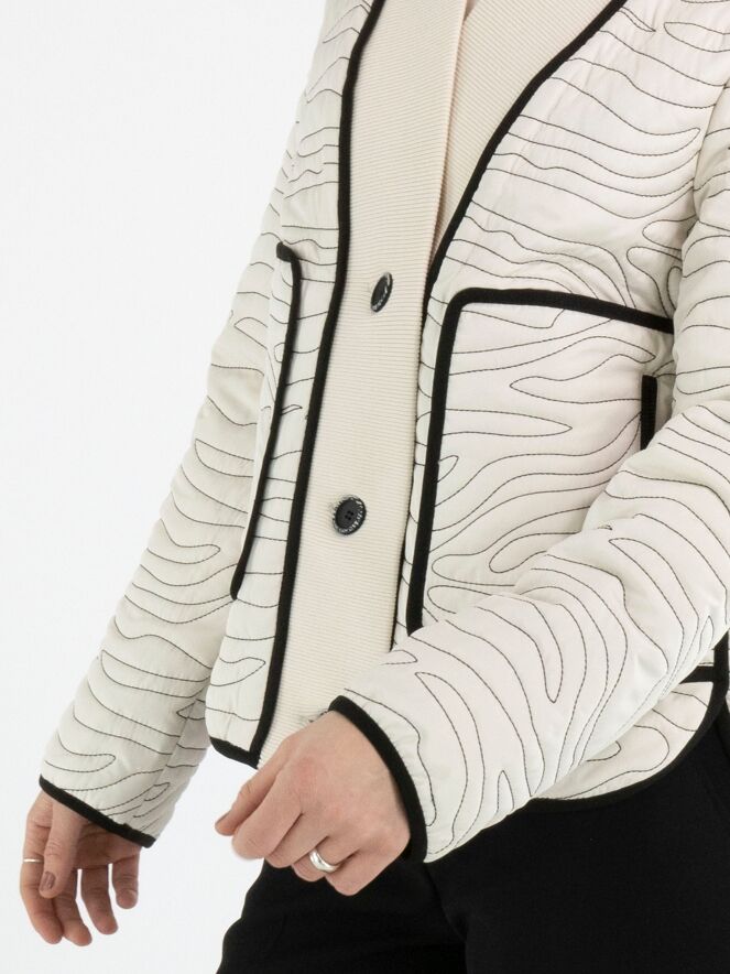 A coat from Marc Cain in beige with decorative wavy stitching. Black vertical trims are placed at the front and back, and the same detail appears along the edges of the pockets. The collar, extending down to the hem, is made from finely ribbed knit trim. The coat closes with 3 buttons. This coat can be washed at 30 degrees.