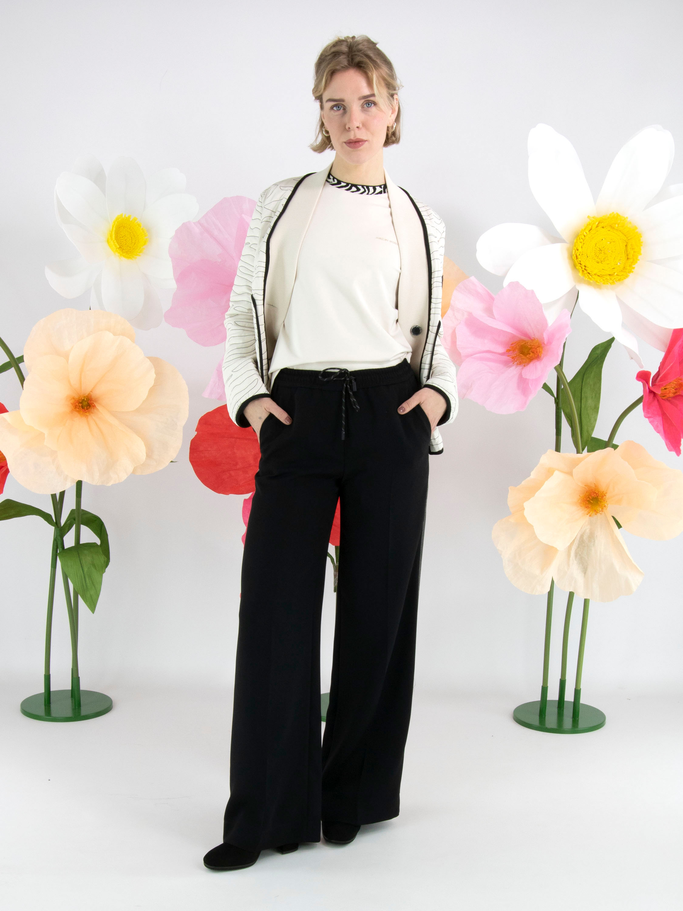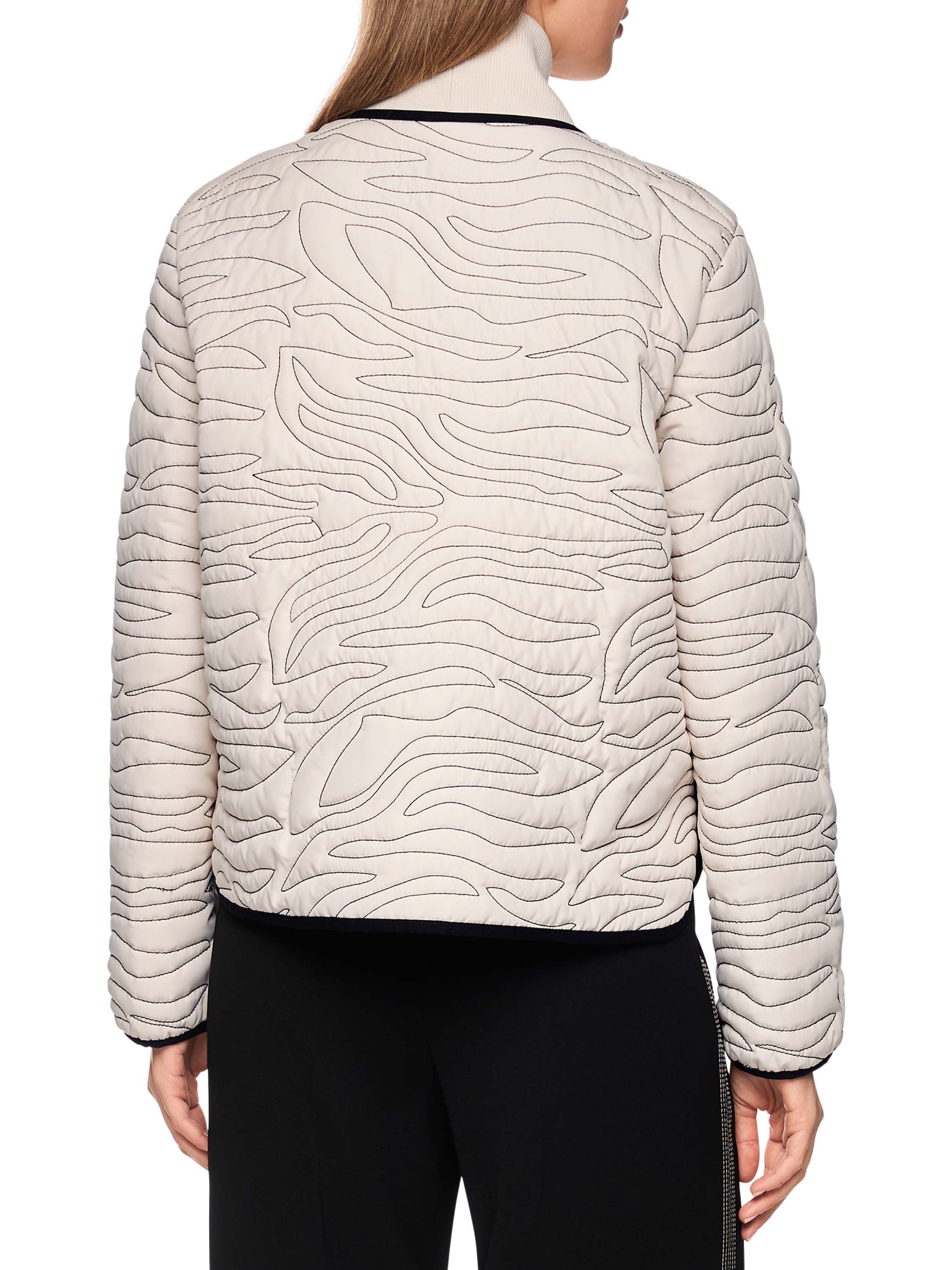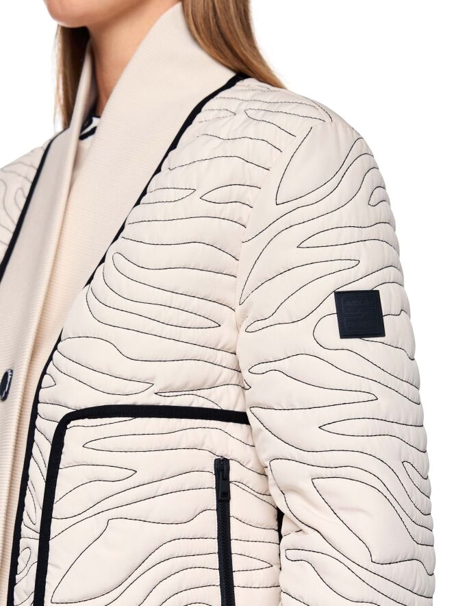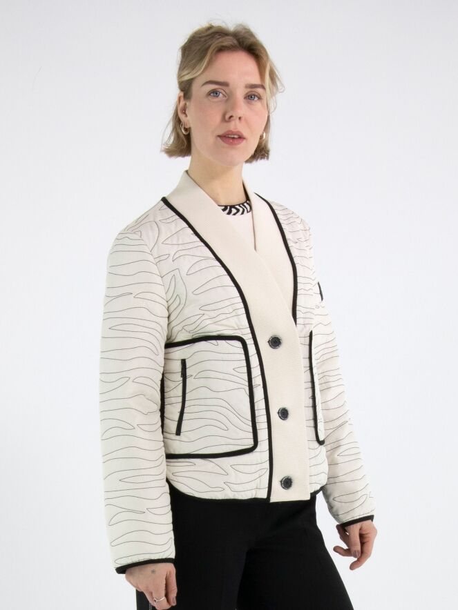 A coat from Marc Cain in beige with decorative wavy stitching. Black vertical trims are placed at the front and back, and the same detail appears along the edges of the pockets. The collar, extending down to the hem, is made from finely ribbed knit trim. The coat closes with 3 buttons. This coat can be washed at 30 degrees.