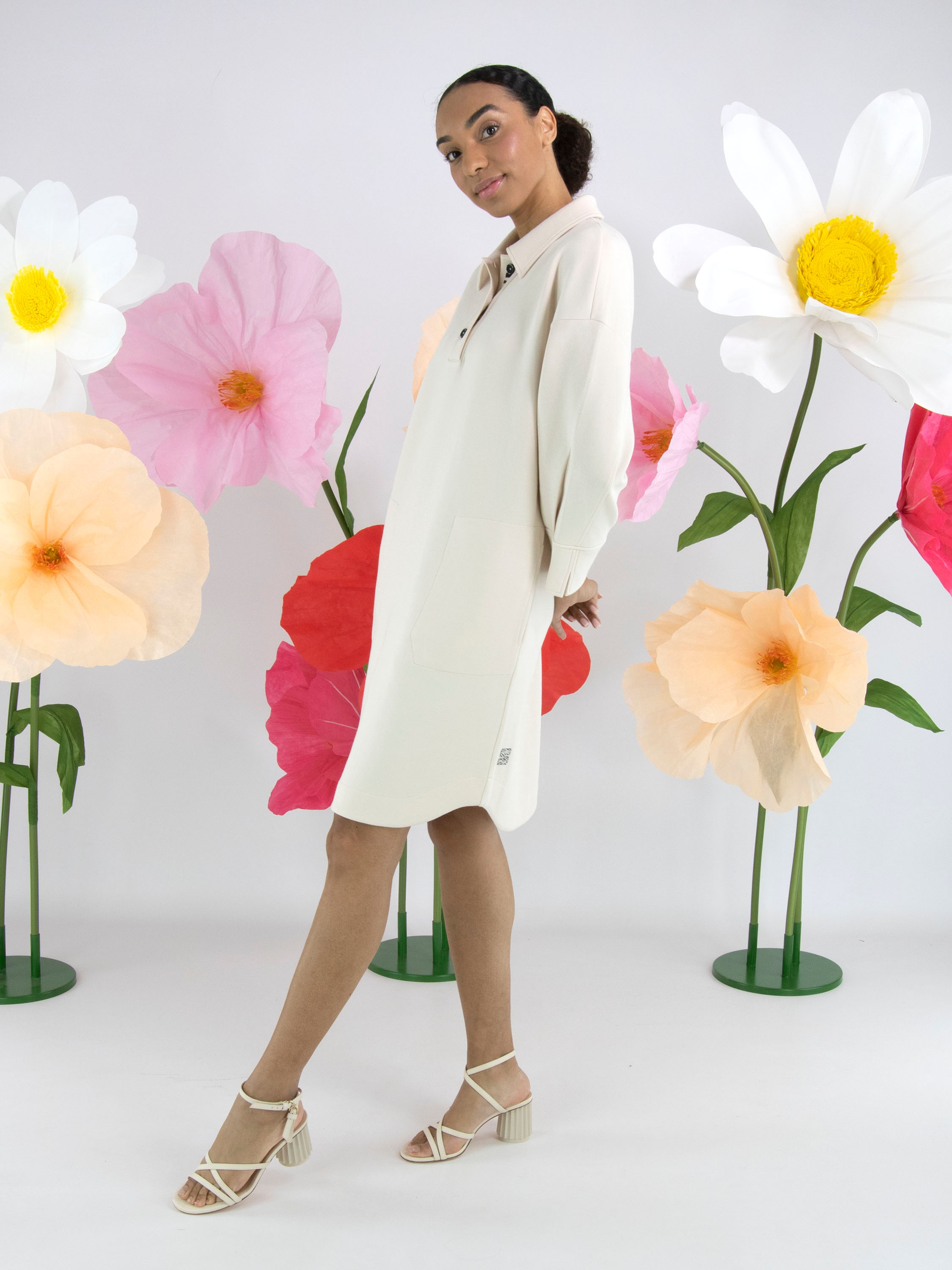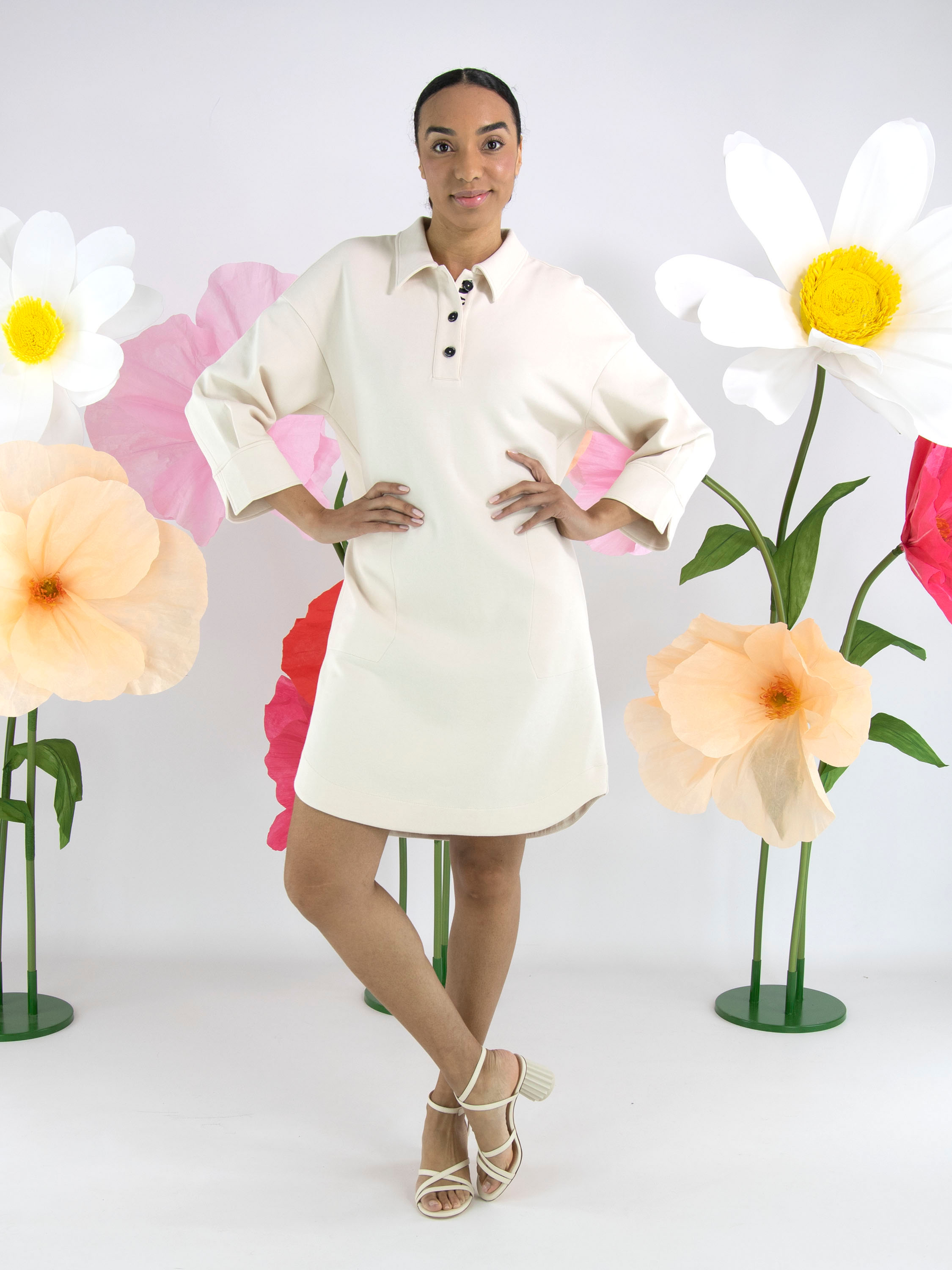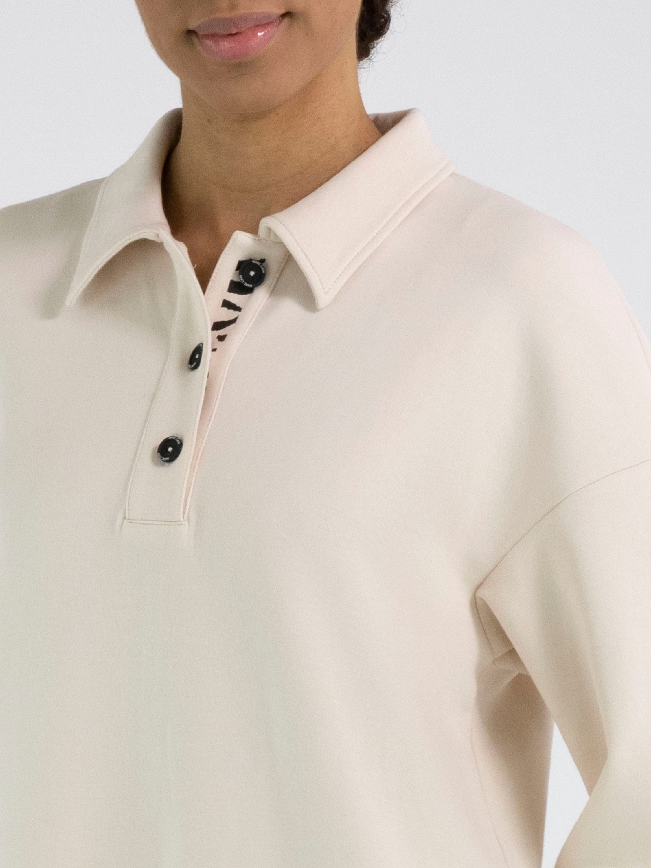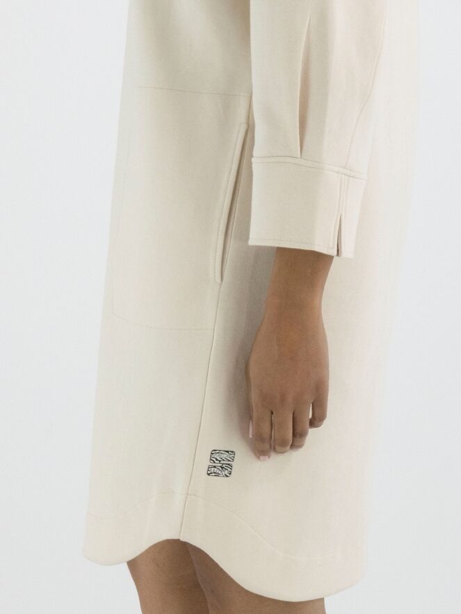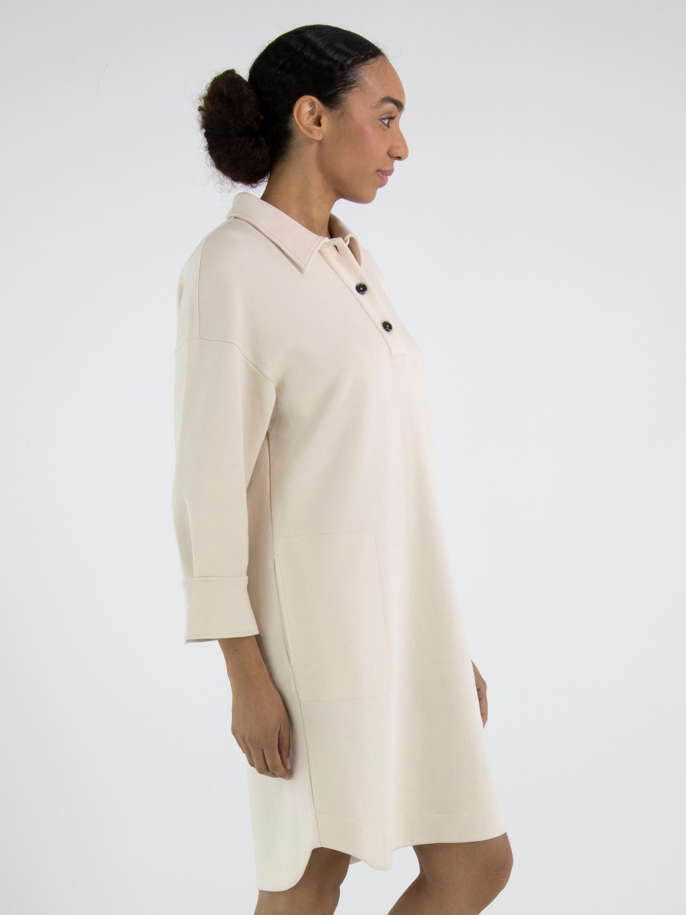 A dress from Marc Cain in beige. The neckline has a polo style with 3 buttons up to above the bust. There are slit pockets at the waist. The dress has a straight cut and can be washed at 30 degrees.