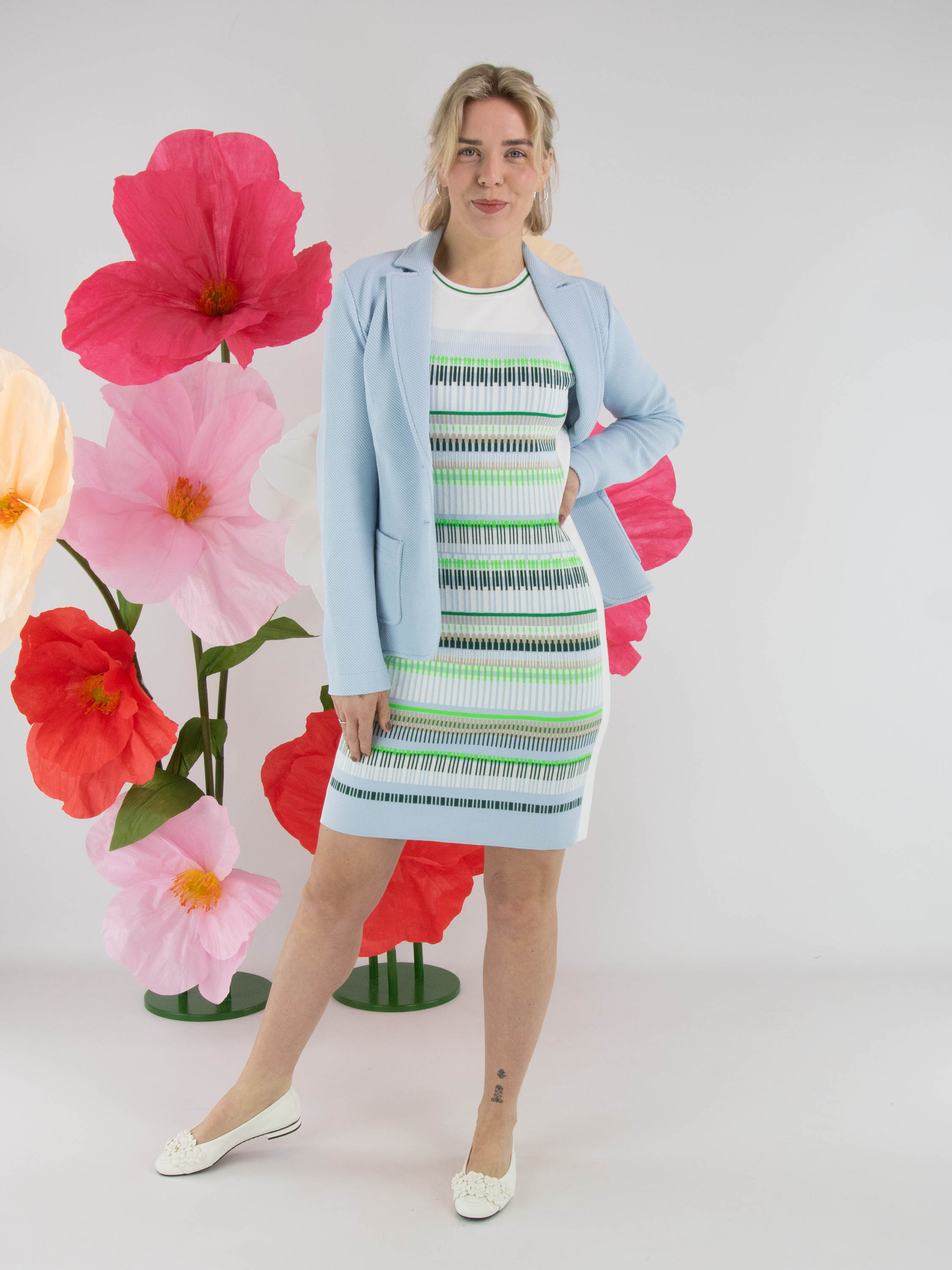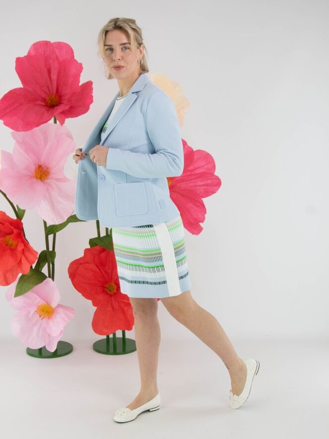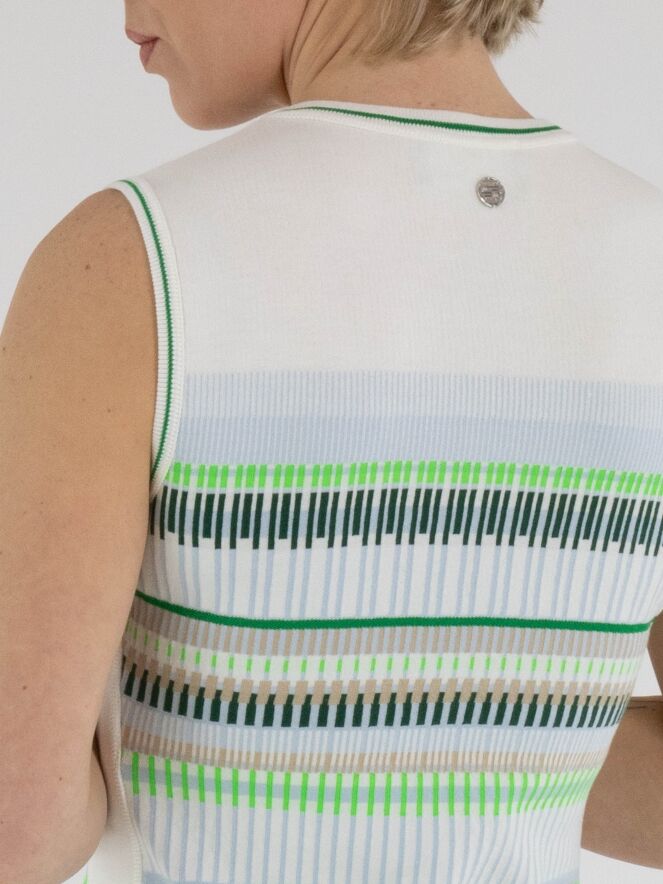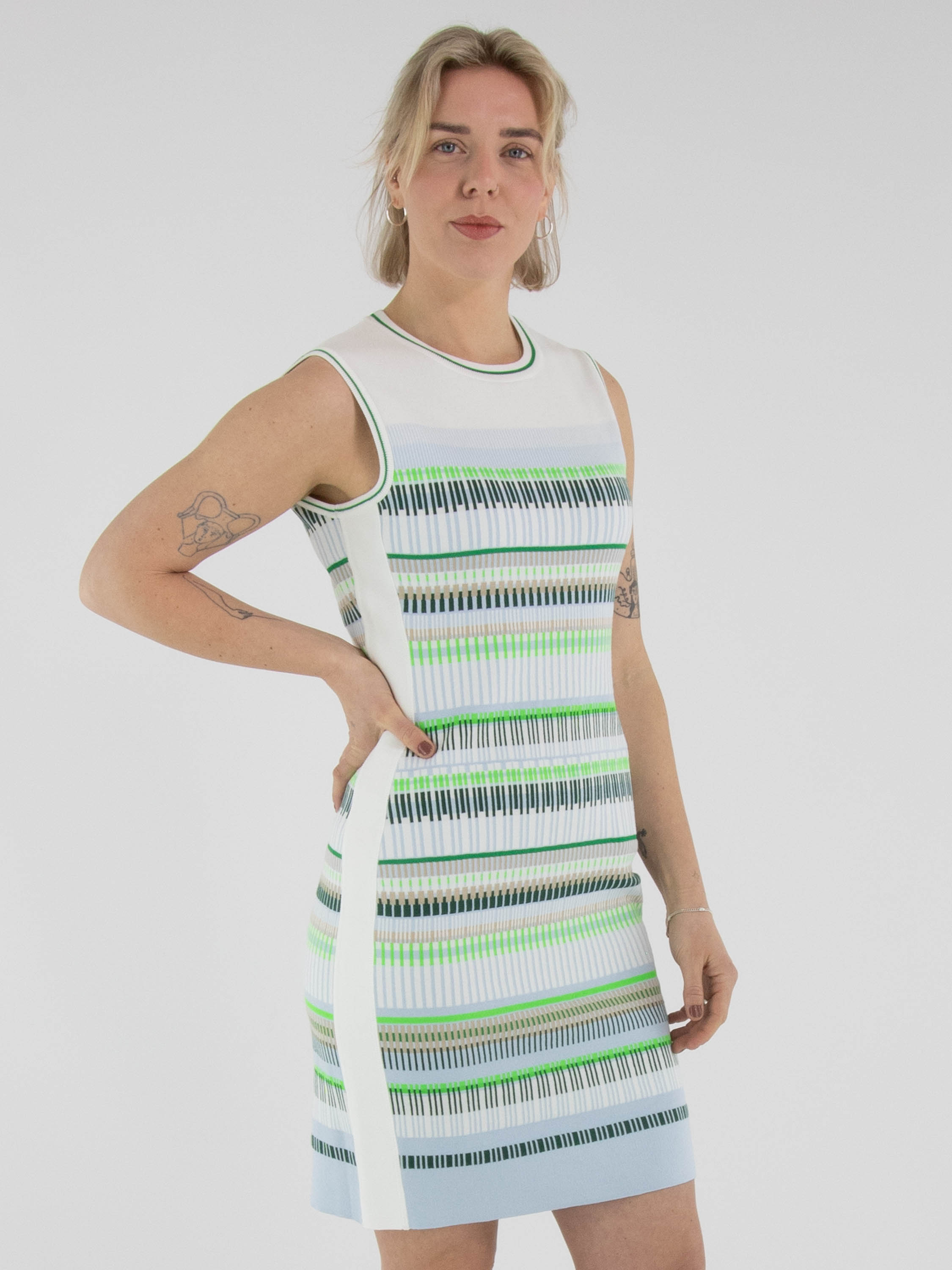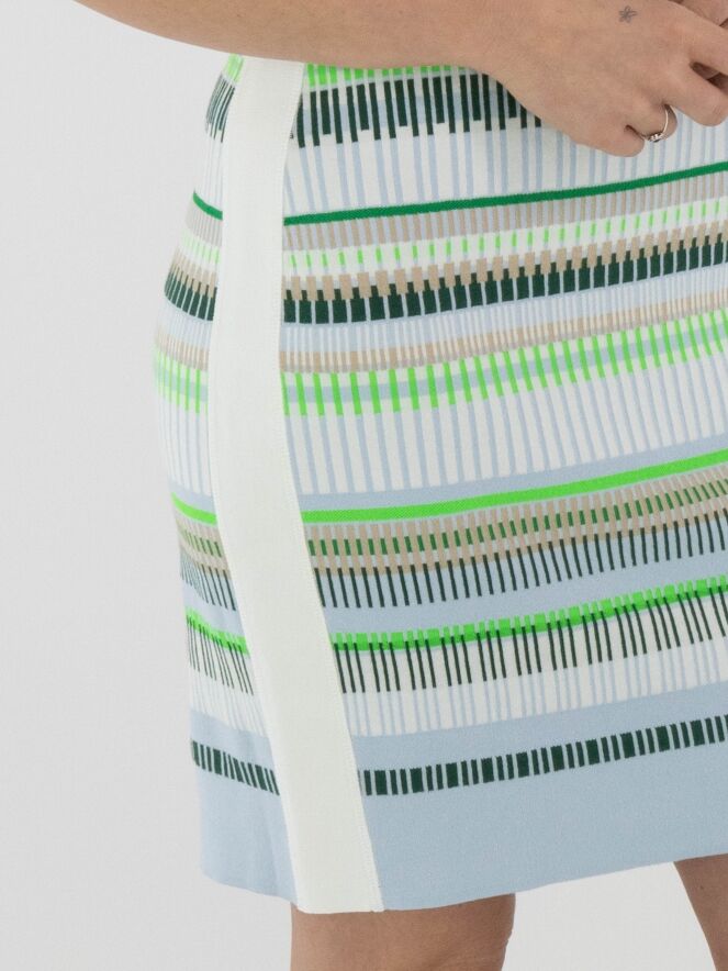 A dress by Marc Cain featuring a striped pattern in shades of blue, sand, light and dark green, and white. Along the edge of the round neckline and the armholes, a finely ribbed knit trim is applied with a striped pattern in cream white and green. Wide cream-white trims run along the sides. This dress can be washed at 30 degrees.
