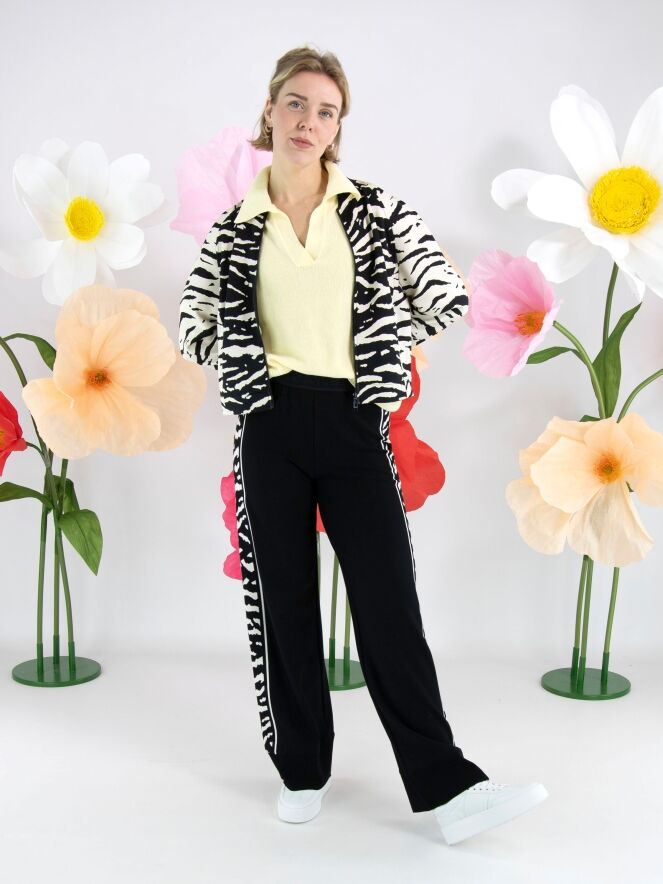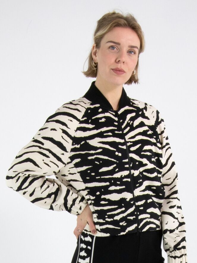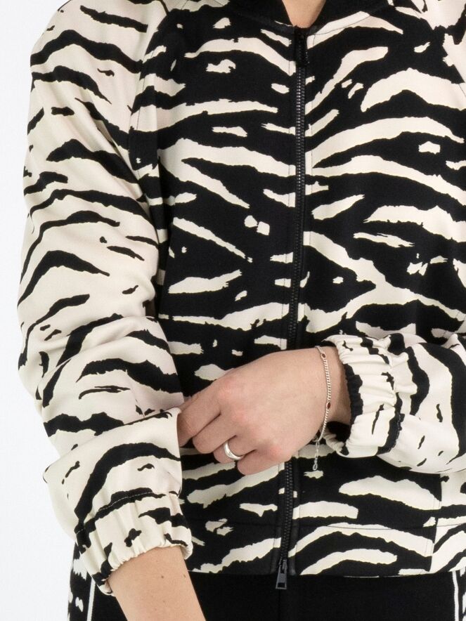 A cardigan from Marc Cain in a zebra print in black and beige. Along the neckline is a black, finely ribbed knit trim. At the ends of the long sleeves is a wide elastic cuff with delicately gathered edges. The cardigan has a zip fastening and can be washed at 30 degrees.