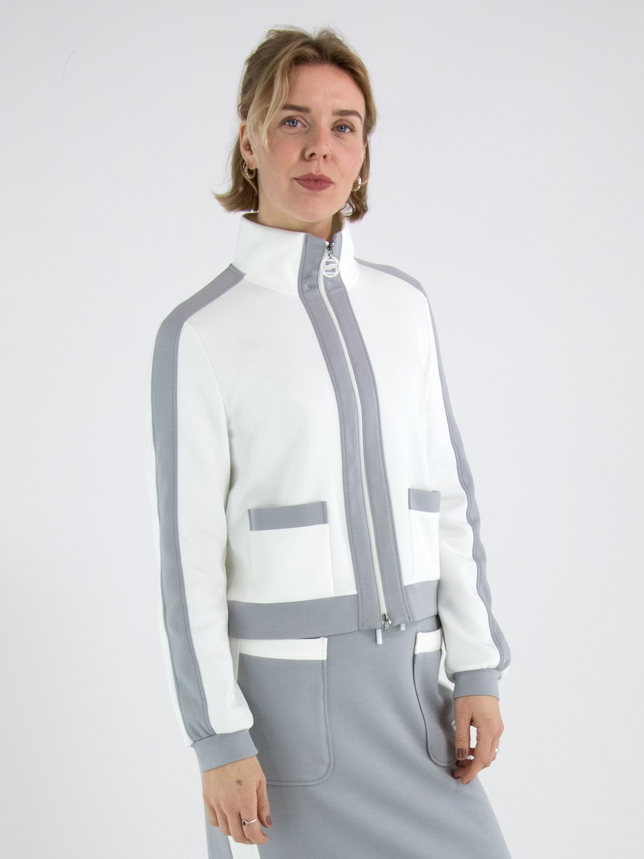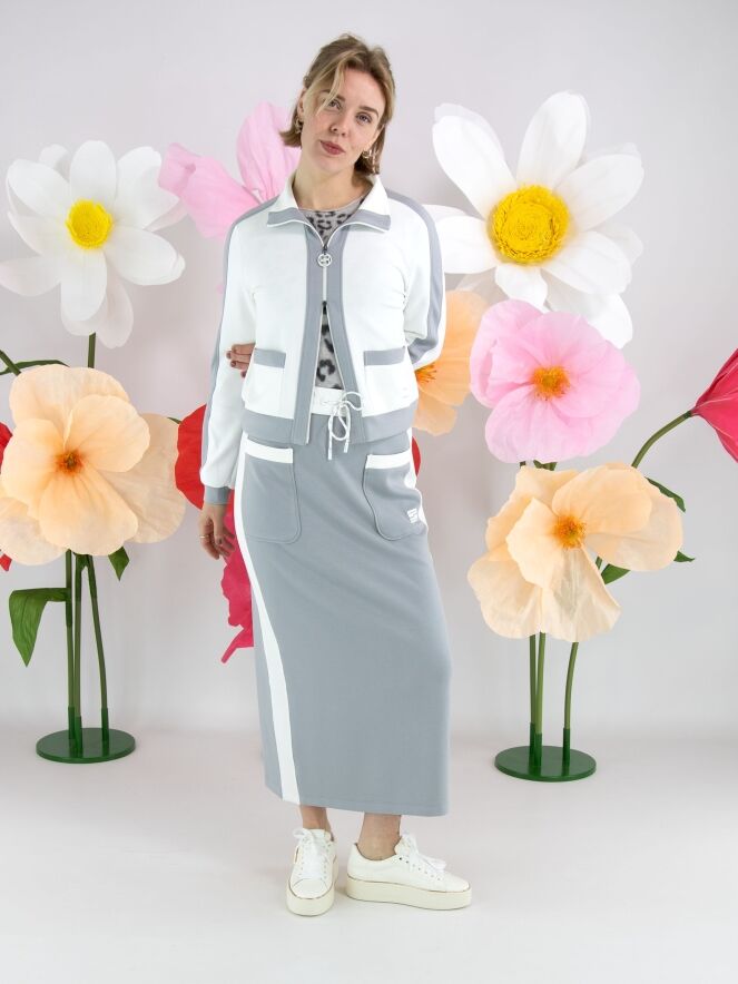 A jogging jacket from Marc Cain in off-white. Along the zipper, on the top of the long sleeves, and along the hem are wide trims in light grey. This jacket can be washed at 30 degrees.