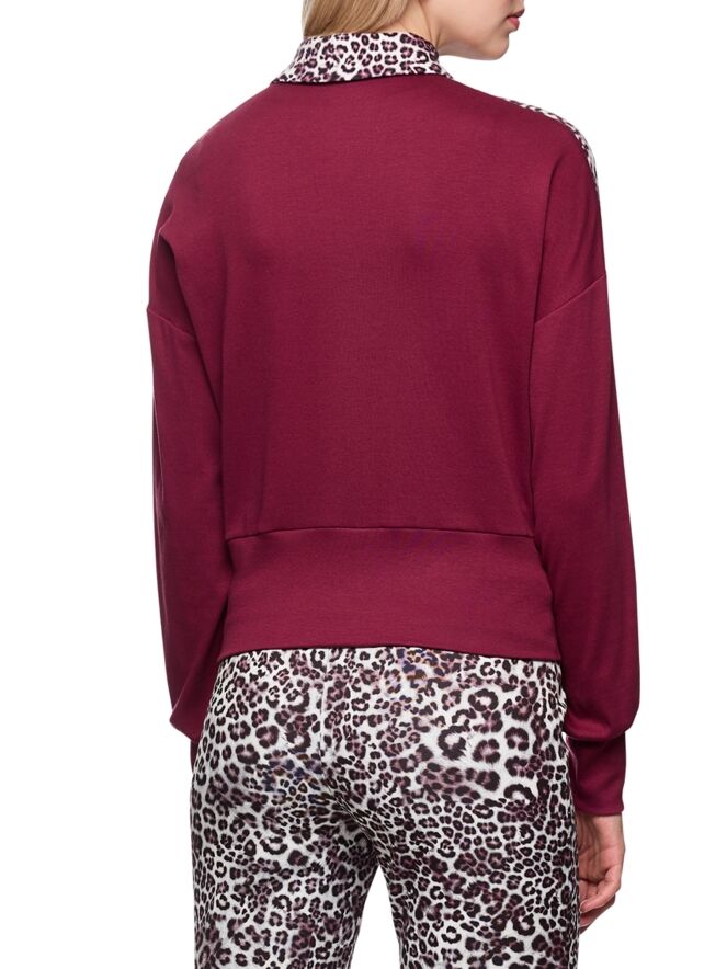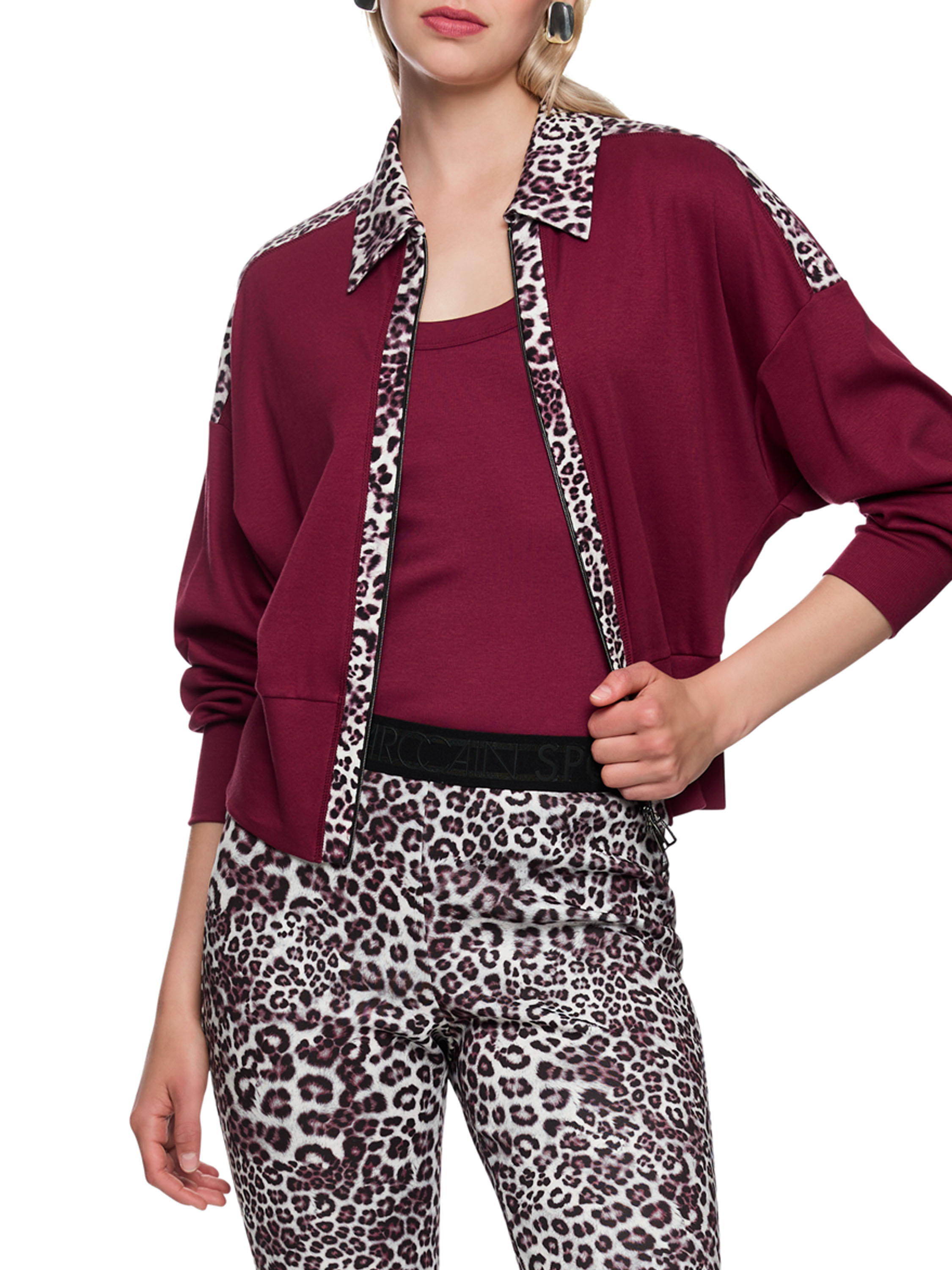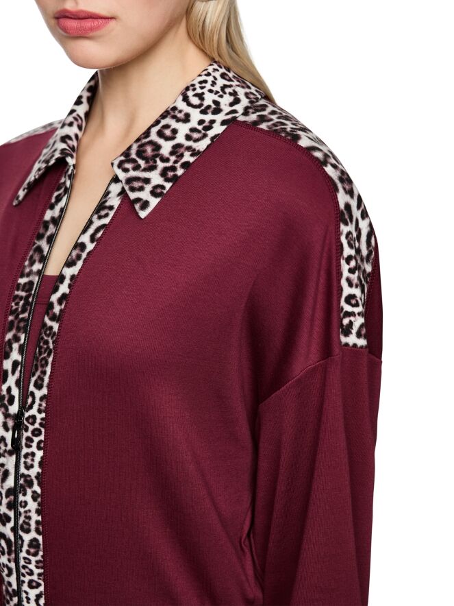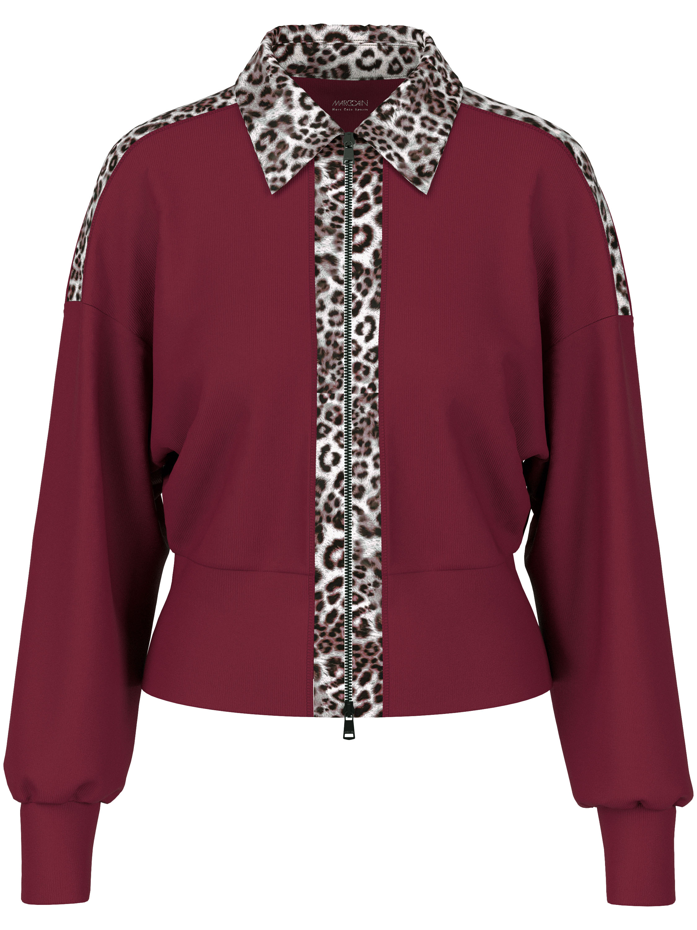 A short cardigan from Marc Cain in a finely ribbed fabric in a burgundy colour. On both sides of the zip fastening, there is a trim in a leopard print with various shades of grey, burgundy and off-white. This print is also featured in the collar and on the shoulders. At the bottom, a wide band with a seam creates a blouson effect. The cardigan has batwing sleeves and can be washed at 30 degrees.