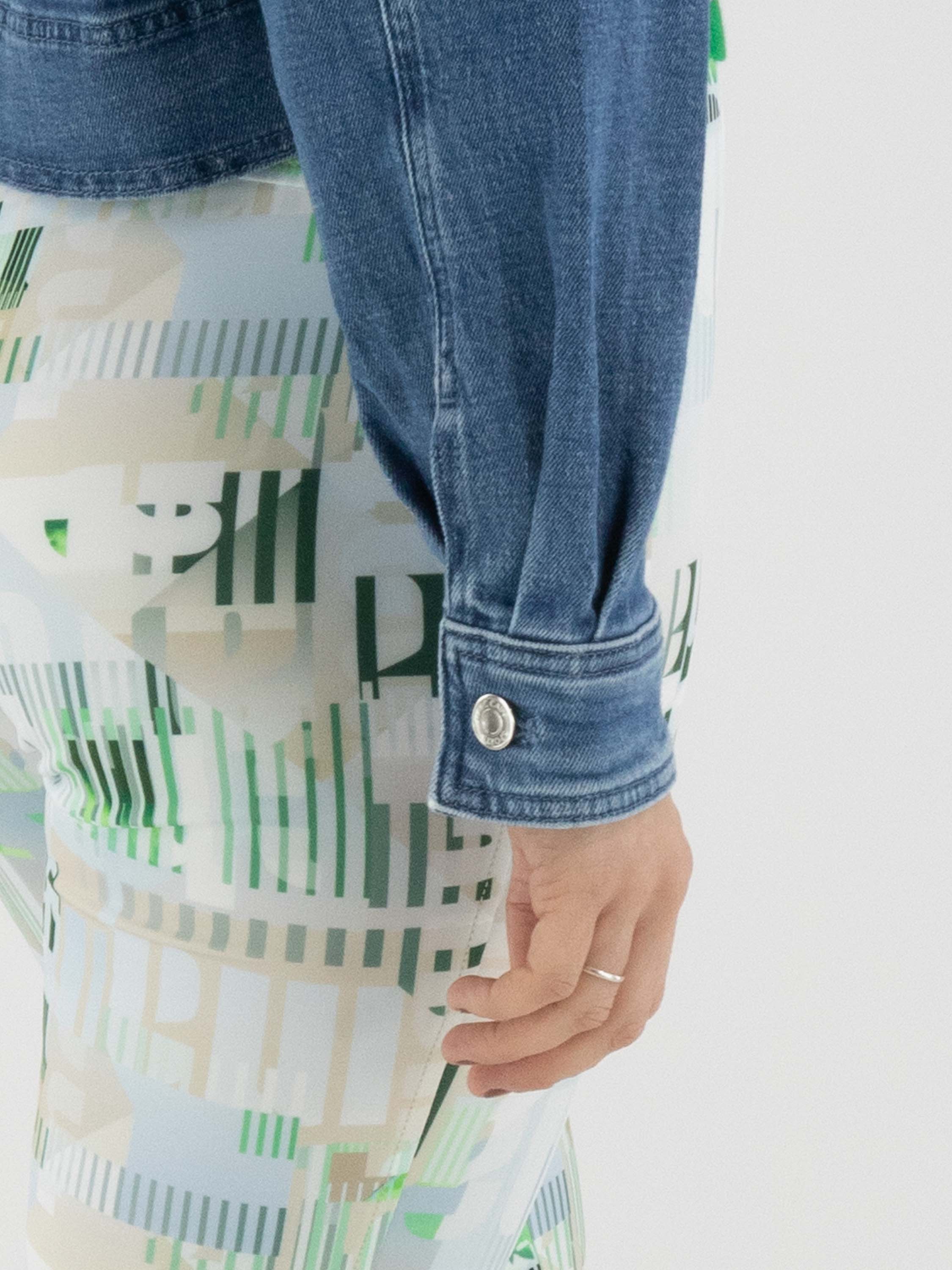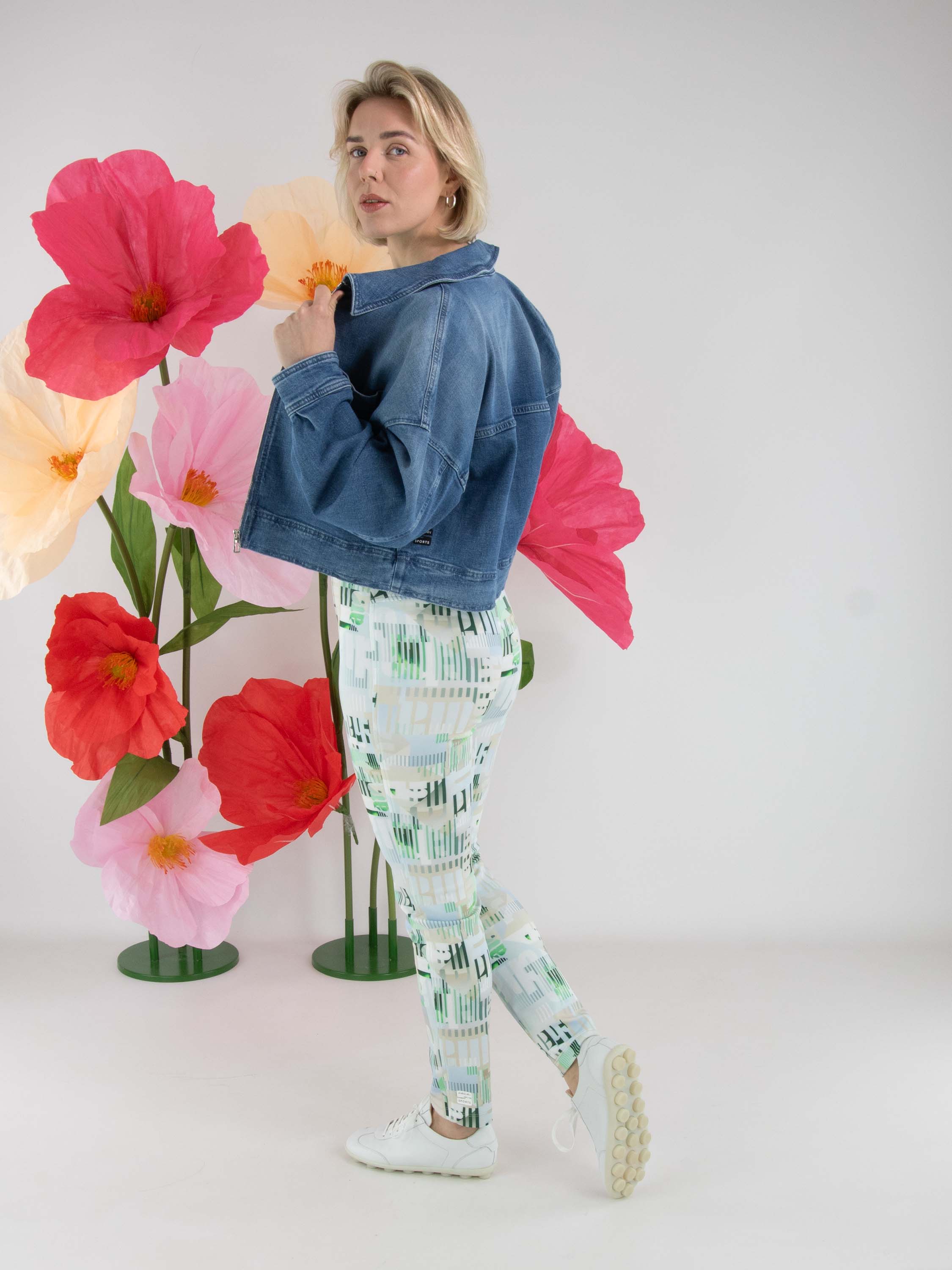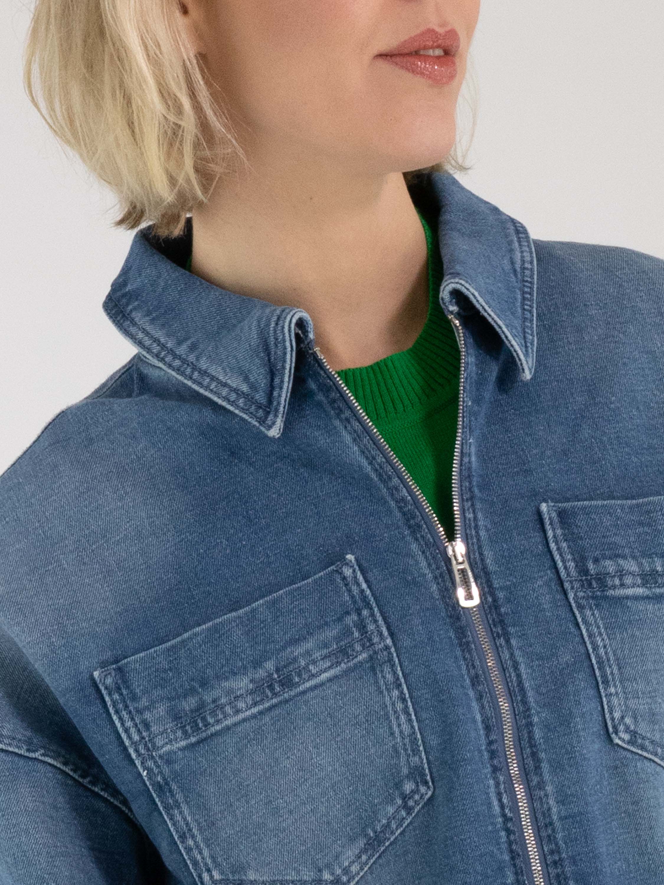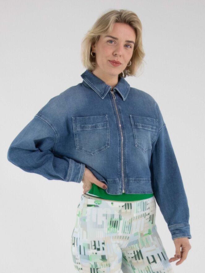 A short denim blazer by Marc Cain in a classic denim blue shade. The blazer features a zip fastening and two large chest pockets. This denim blazer can be washed at 30 degrees.