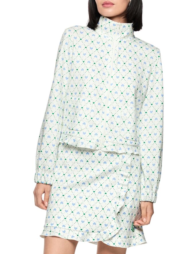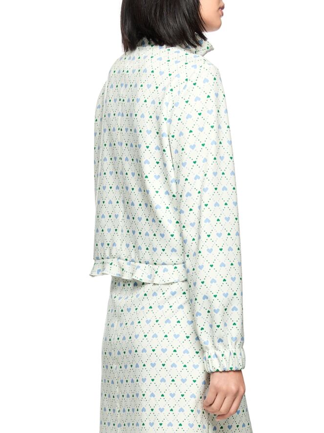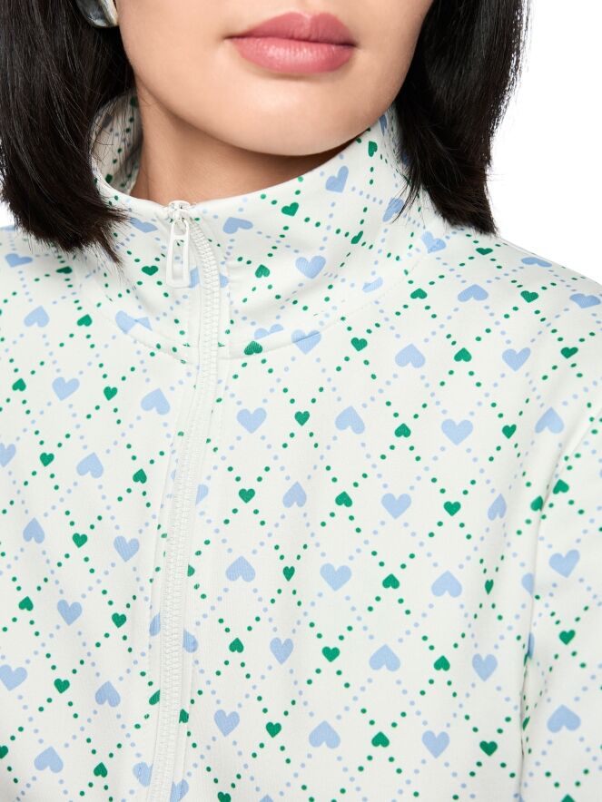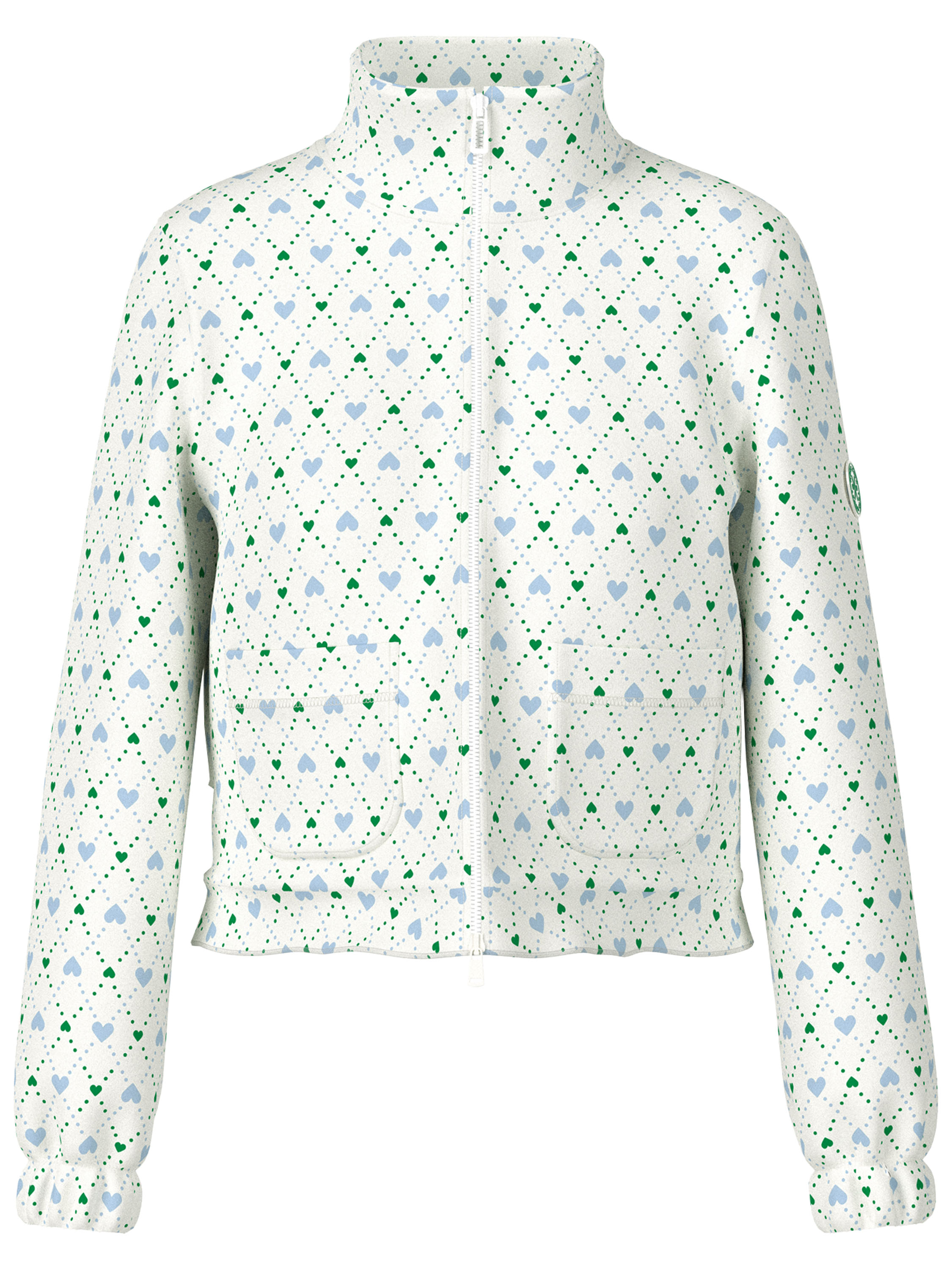 A short cardigan by Marc Cain in a scuba-quality fabric, featuring a checked print with dots and heart motifs in blue and dark green on a cream-white background. The cardigan has a zip fastening. The ends of the long sleeves are finished with elasticated pleated cuffs. The back of the cardigan is lined. This cardigan can be hand-washed.