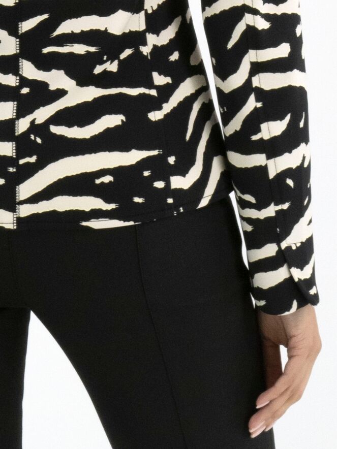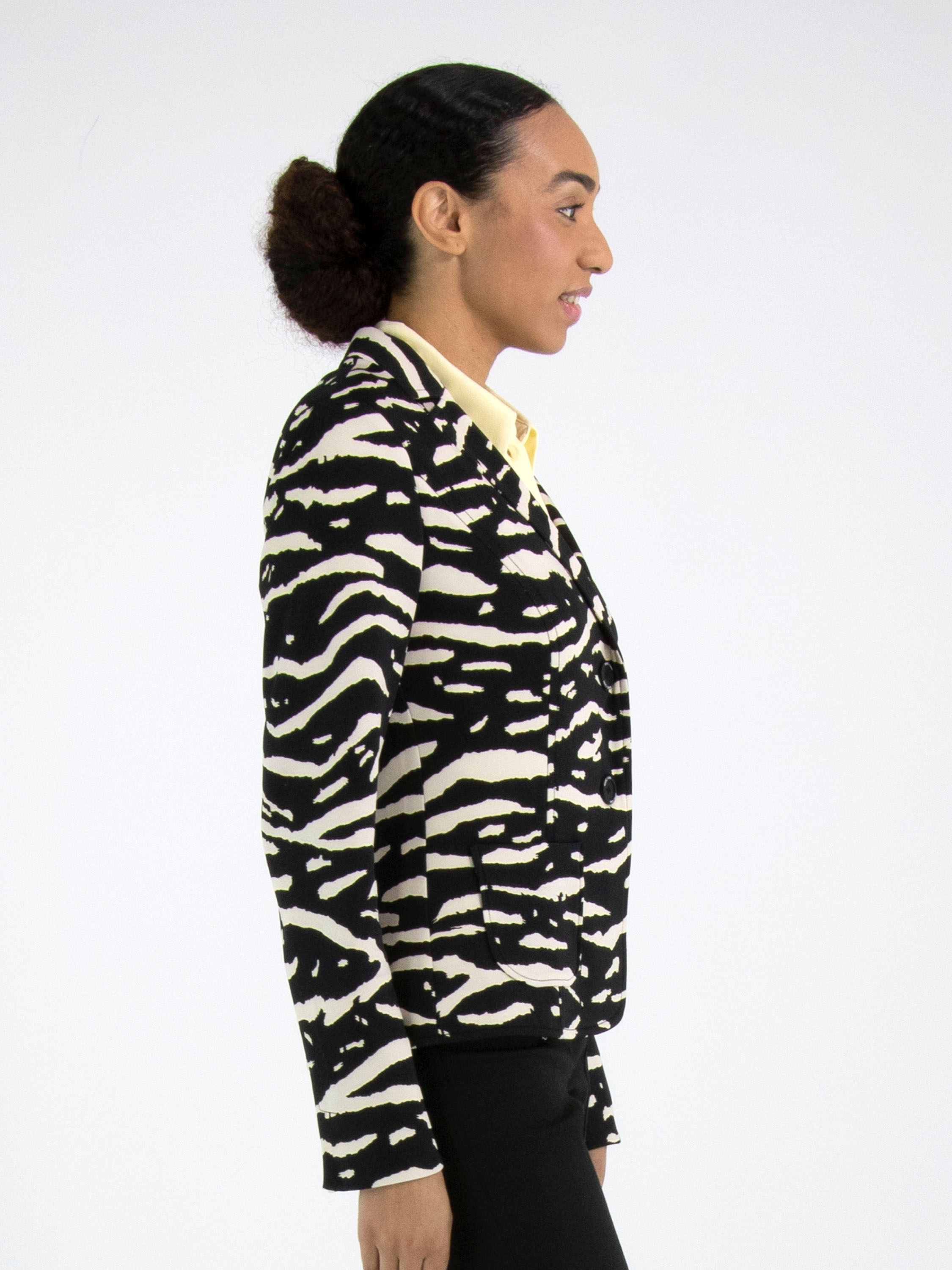 A blazer from Marc Cain in a zebra print in black and beige. The blazer is made from scuba fabric and has a 2-button closure. This blazer can be washed at 30 degrees.