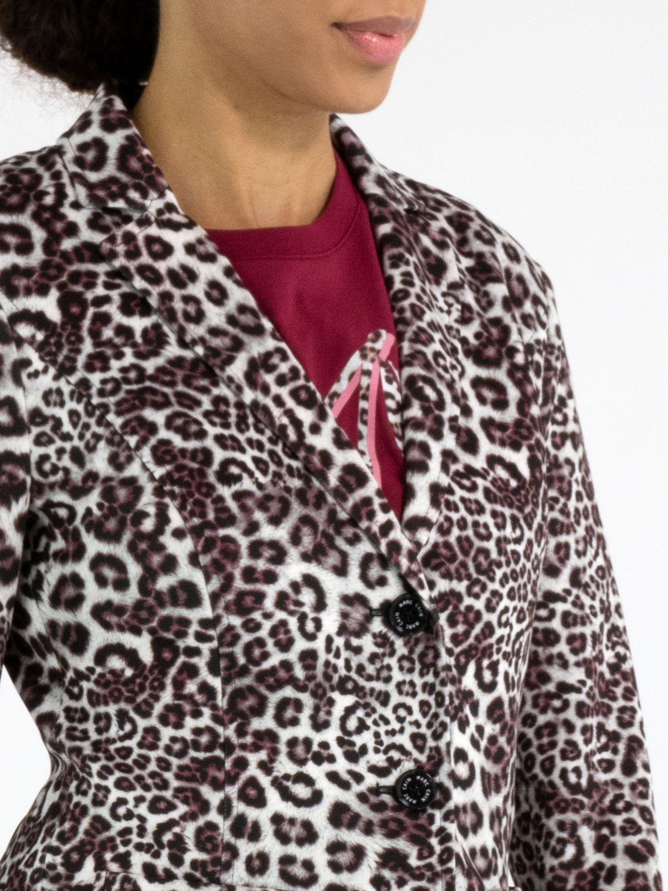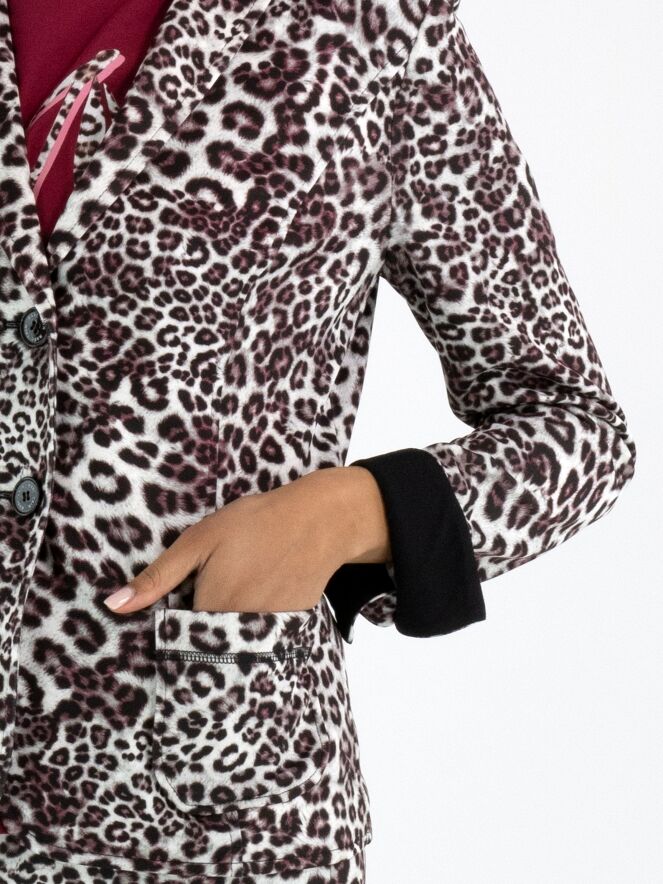 A blazer from Marc Cain in a leopard print with various shades of grey, burgundy and off-white. The blazer has a two-button closure. At the waist on the front are two small pockets. The ends of the long sleeves have a small slit, revealing a solid black fabric when turned up. This blazer can be washed at 30 degrees.