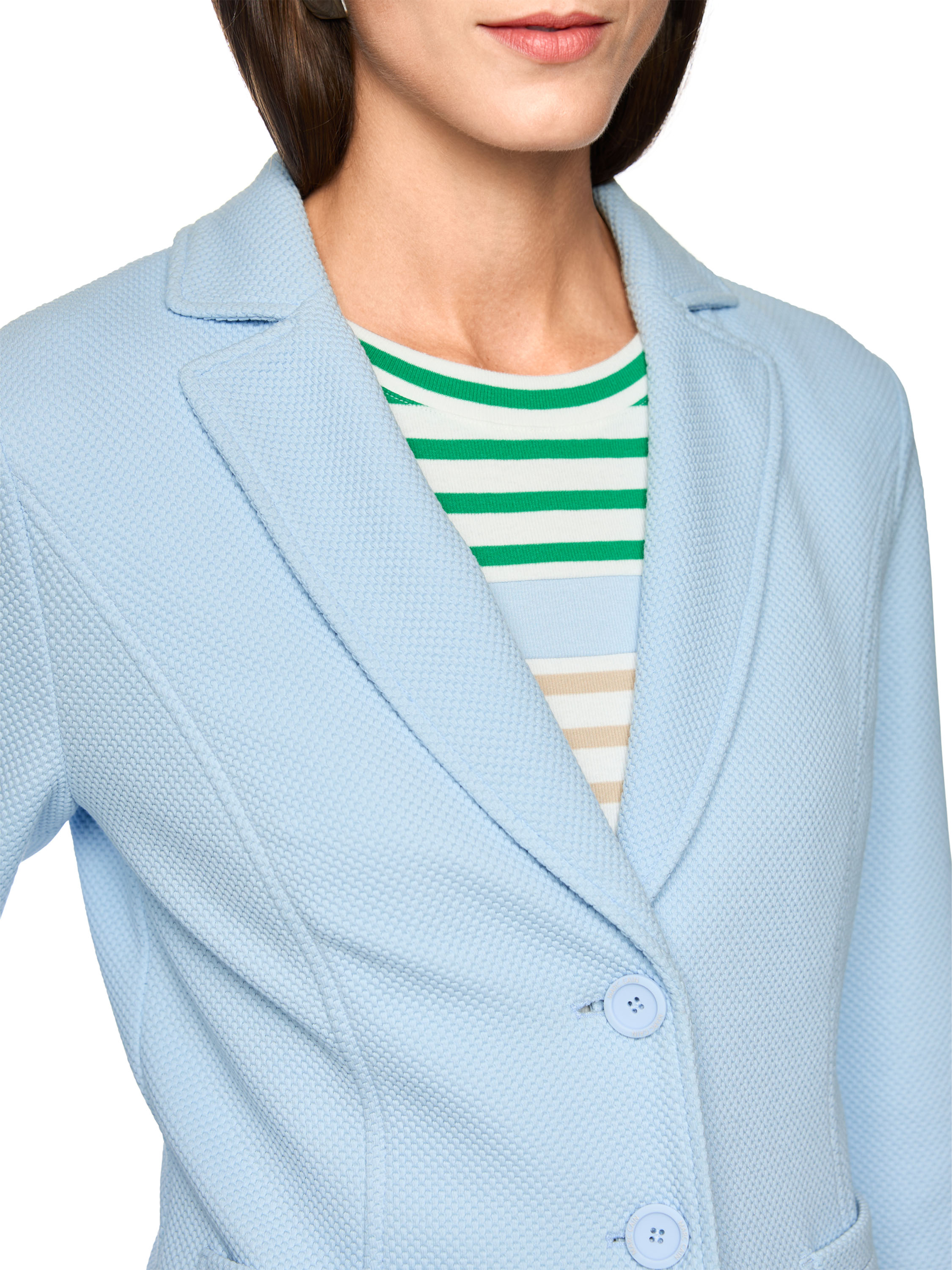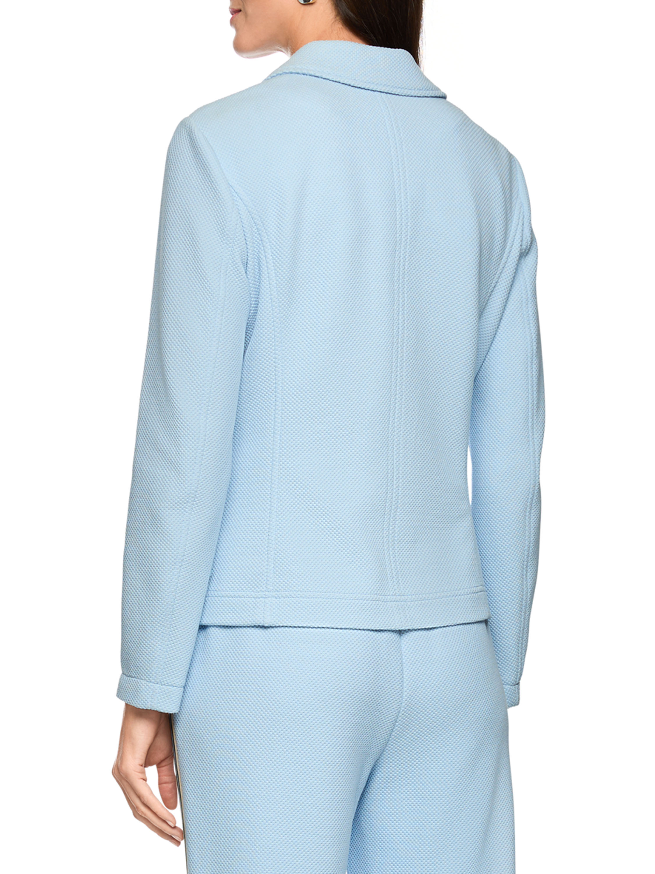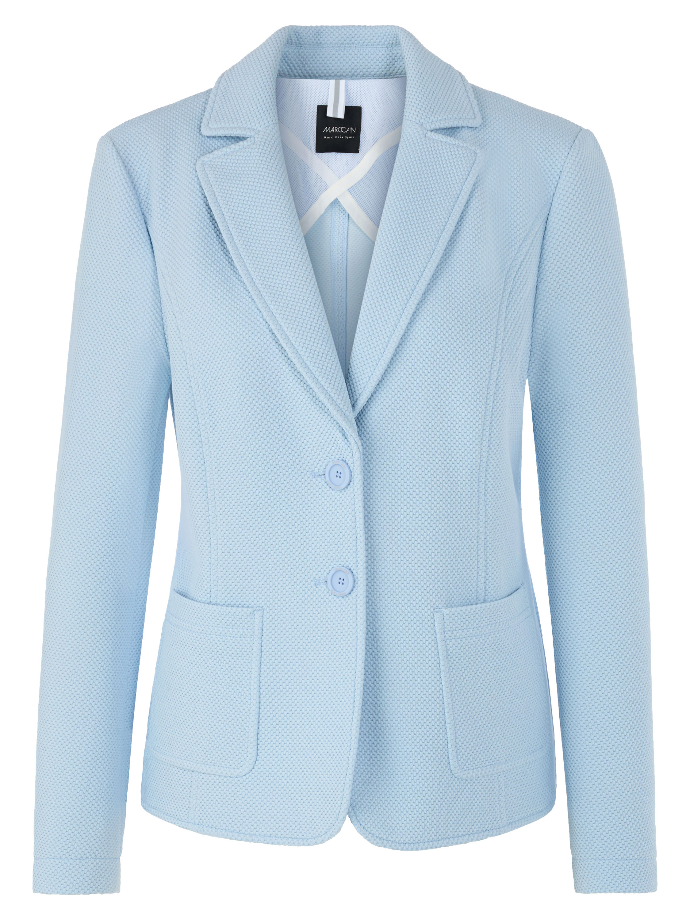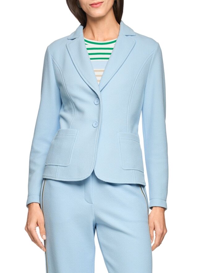 A blazer by Marc Cain featuring a textured grain fabric in blue. The blazer is lightly tailored and fastens with two buttons. This blazer can be washed at 30 degrees.