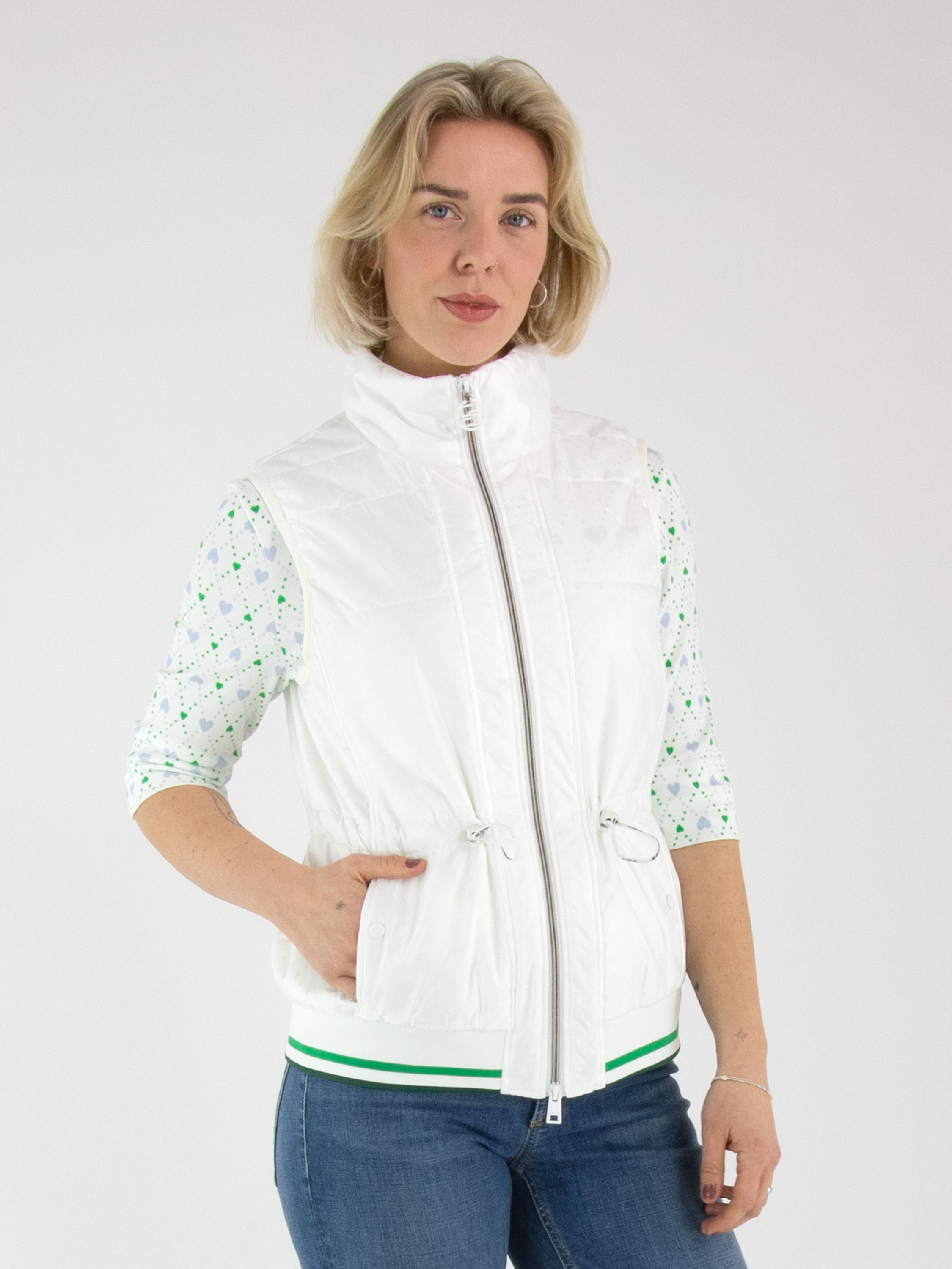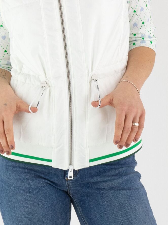 A bodywarmer by Marc Cain in cream white. Ton-sur-ton heart motifs are laser-cut into the fabric. At waist level, a drawstring in a tunnel construction allows a pleated effect to be created. The side pockets are finished with press-stud closures. The hem features a finely ribbed knit trim with a striped pattern in bright green, white and dark green. The bodywarmer has a zip fastening and can be washed at 30 degrees.