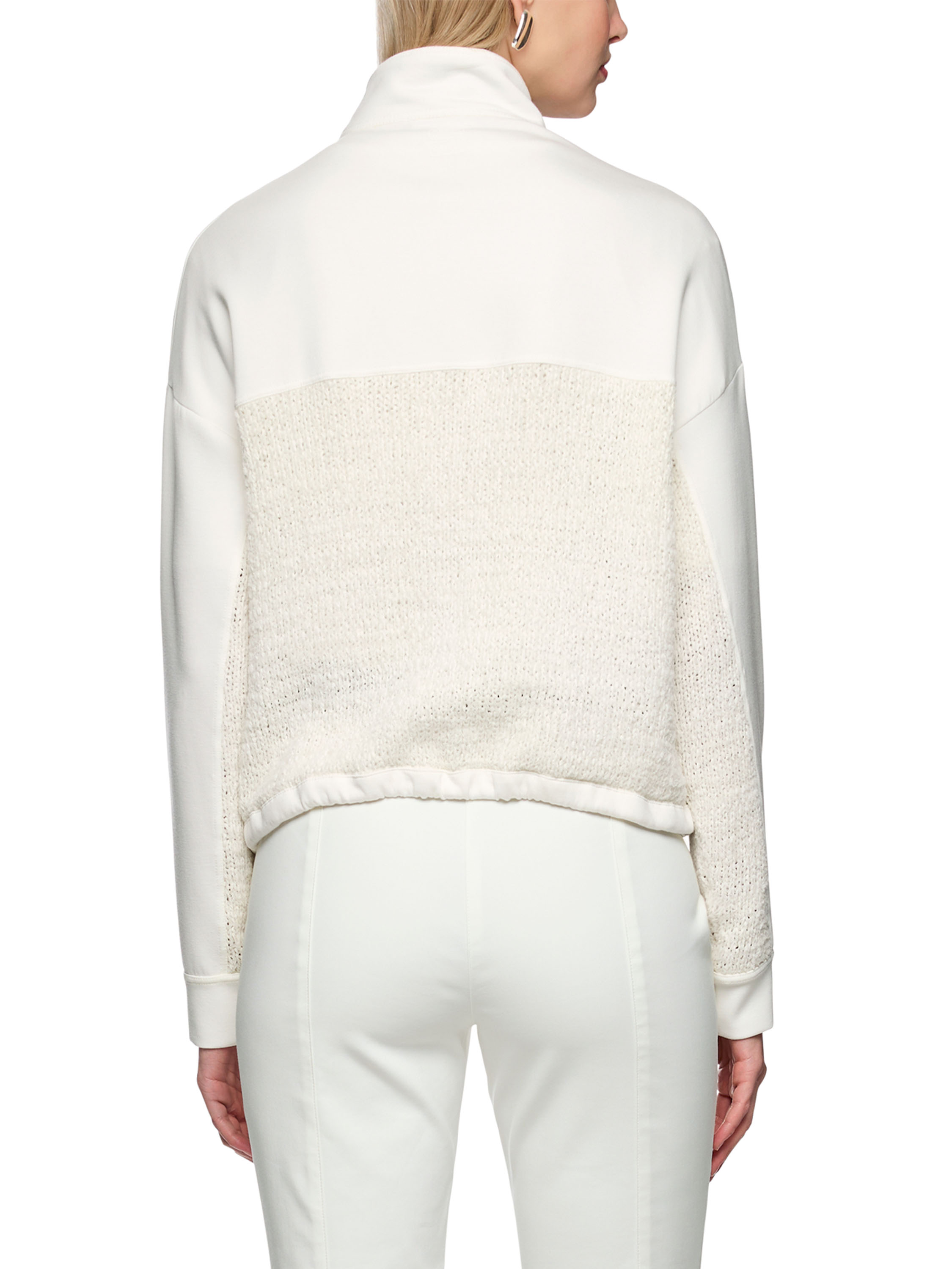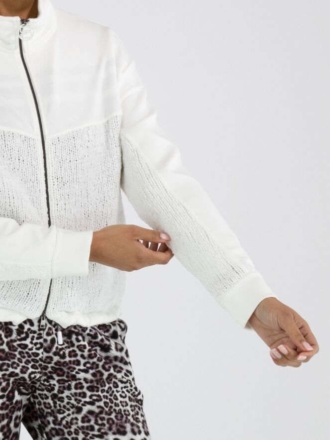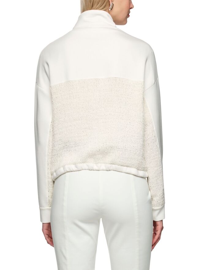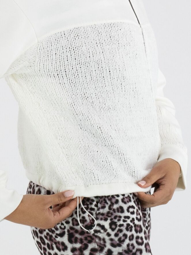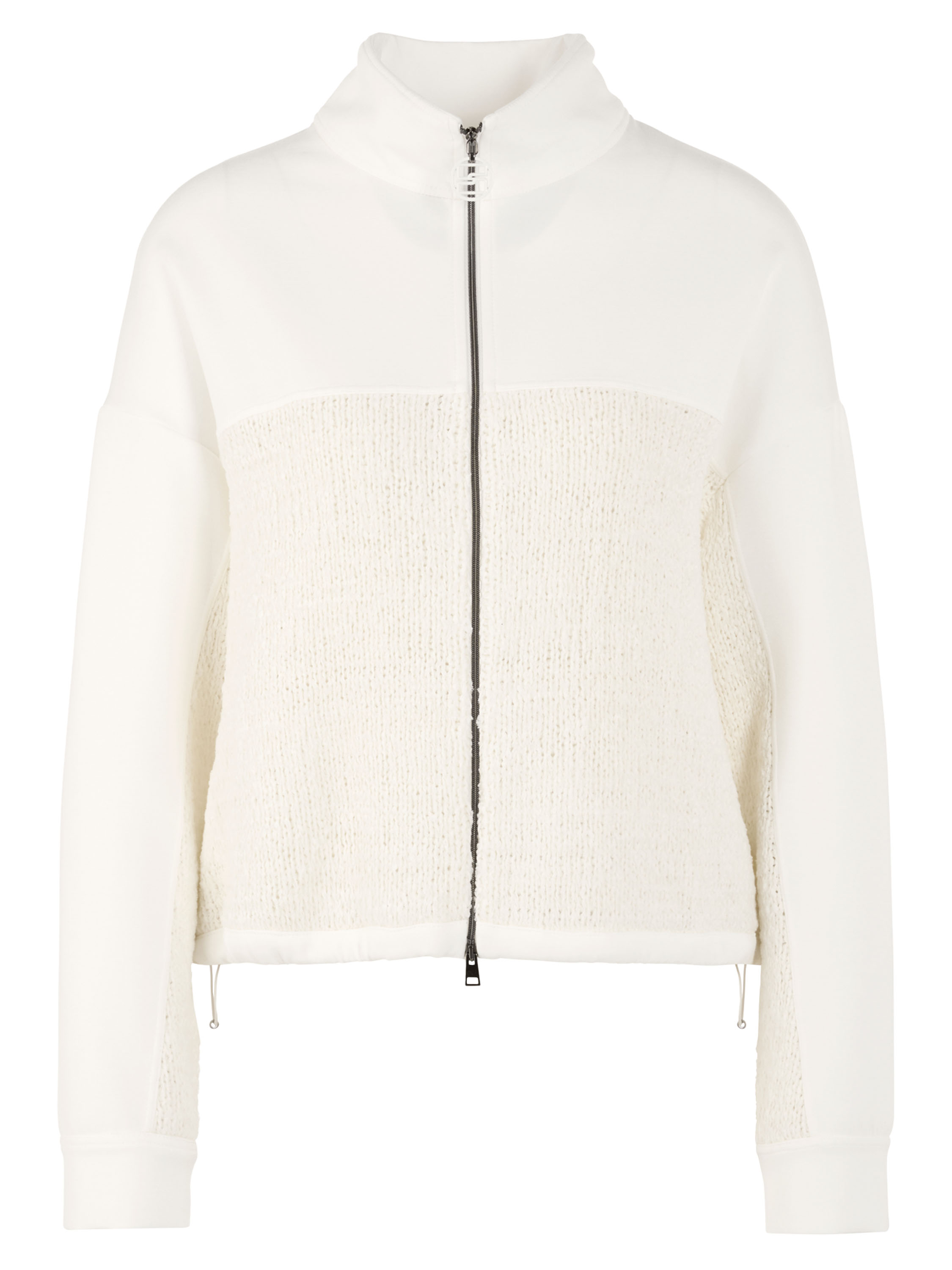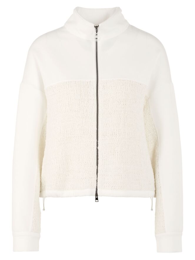 A cardigan from Marc Cain in off-white. The upper part up to the bust and the long sleeves are made from a scuba quality. From the bust downward, the cardigan is knitted. At the hem there is a trim with an adjustable drawstring in a tunnel design, allowing a pleated effect to be created. The cardigan has a zipper and can be washed at 30 degrees.