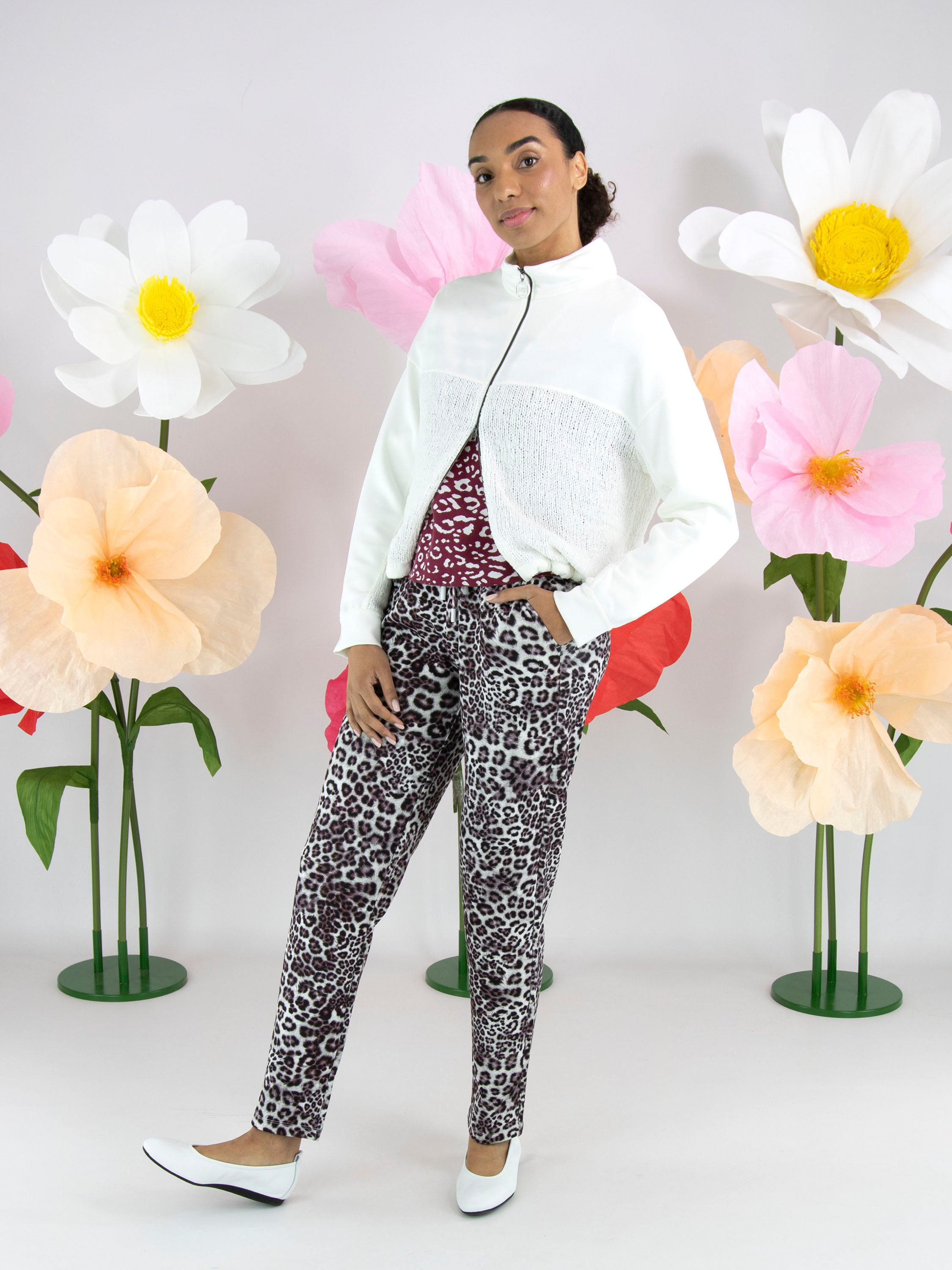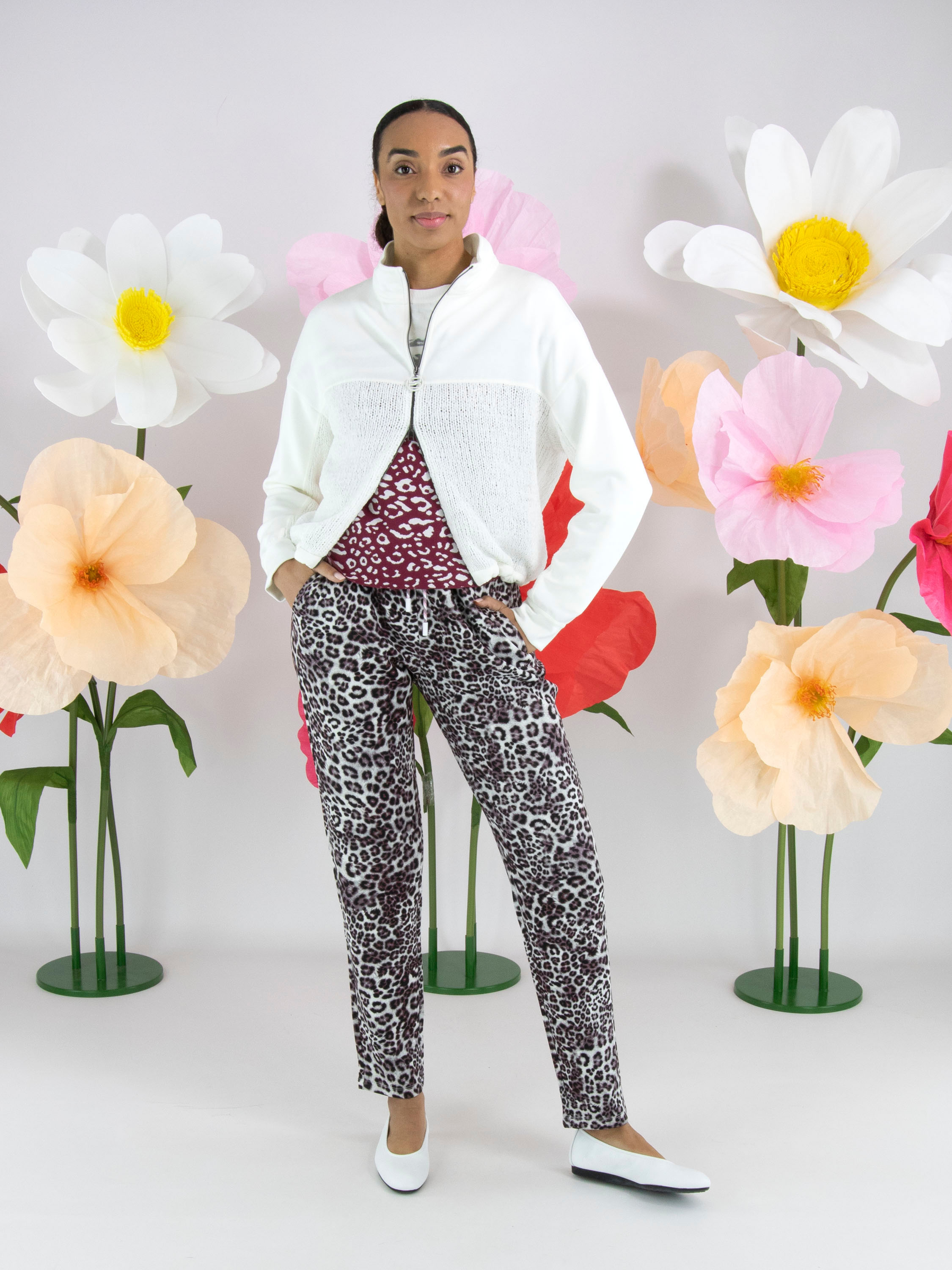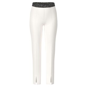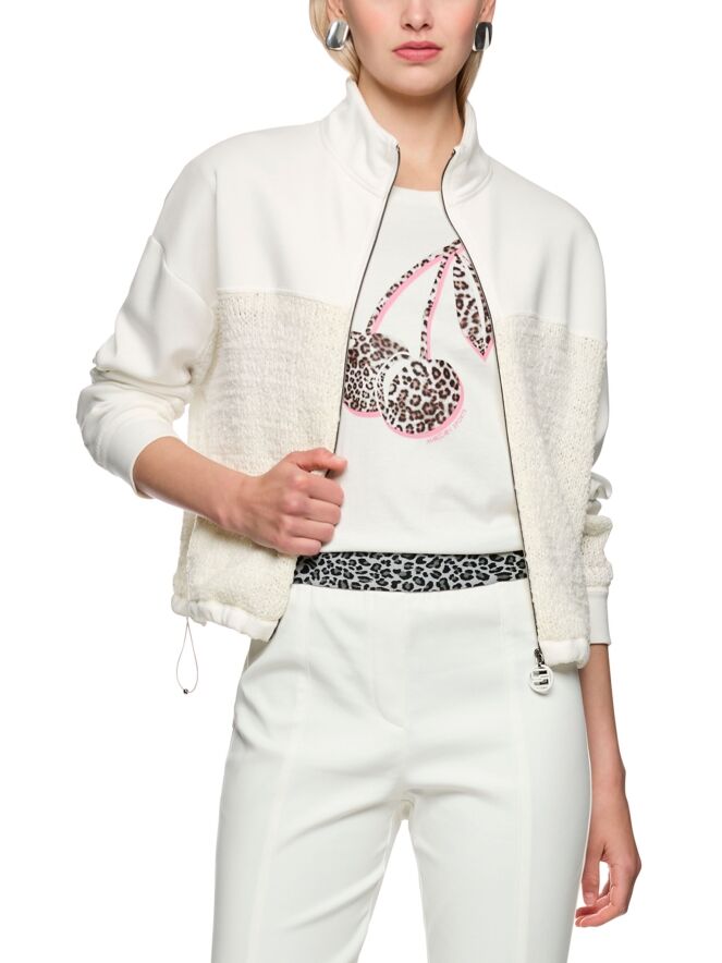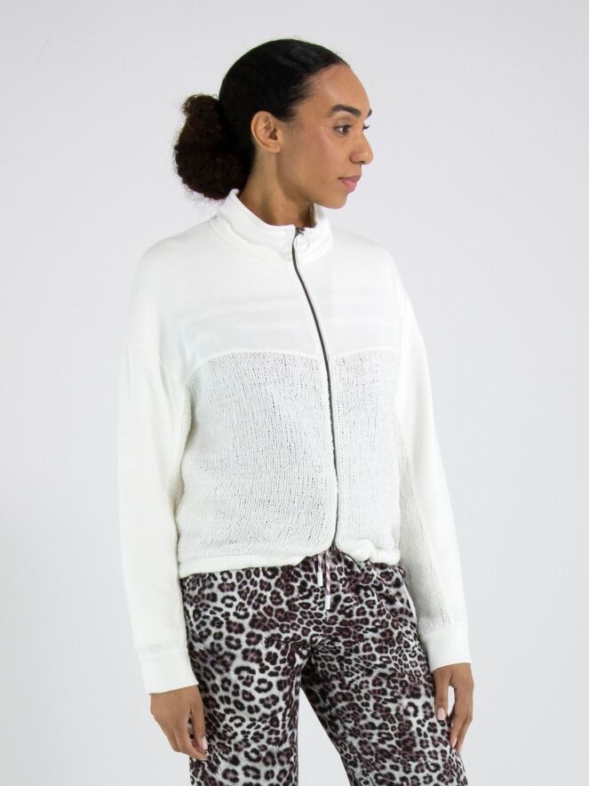 A cardigan from Marc Cain in off-white. The upper part up to the bust and the long sleeves are made from a scuba quality. From the bust downward, the cardigan is knitted. At the hem there is a trim with an adjustable drawstring in a tunnel design, allowing a pleated effect to be created. The cardigan has a zipper and can be washed at 30 degrees.