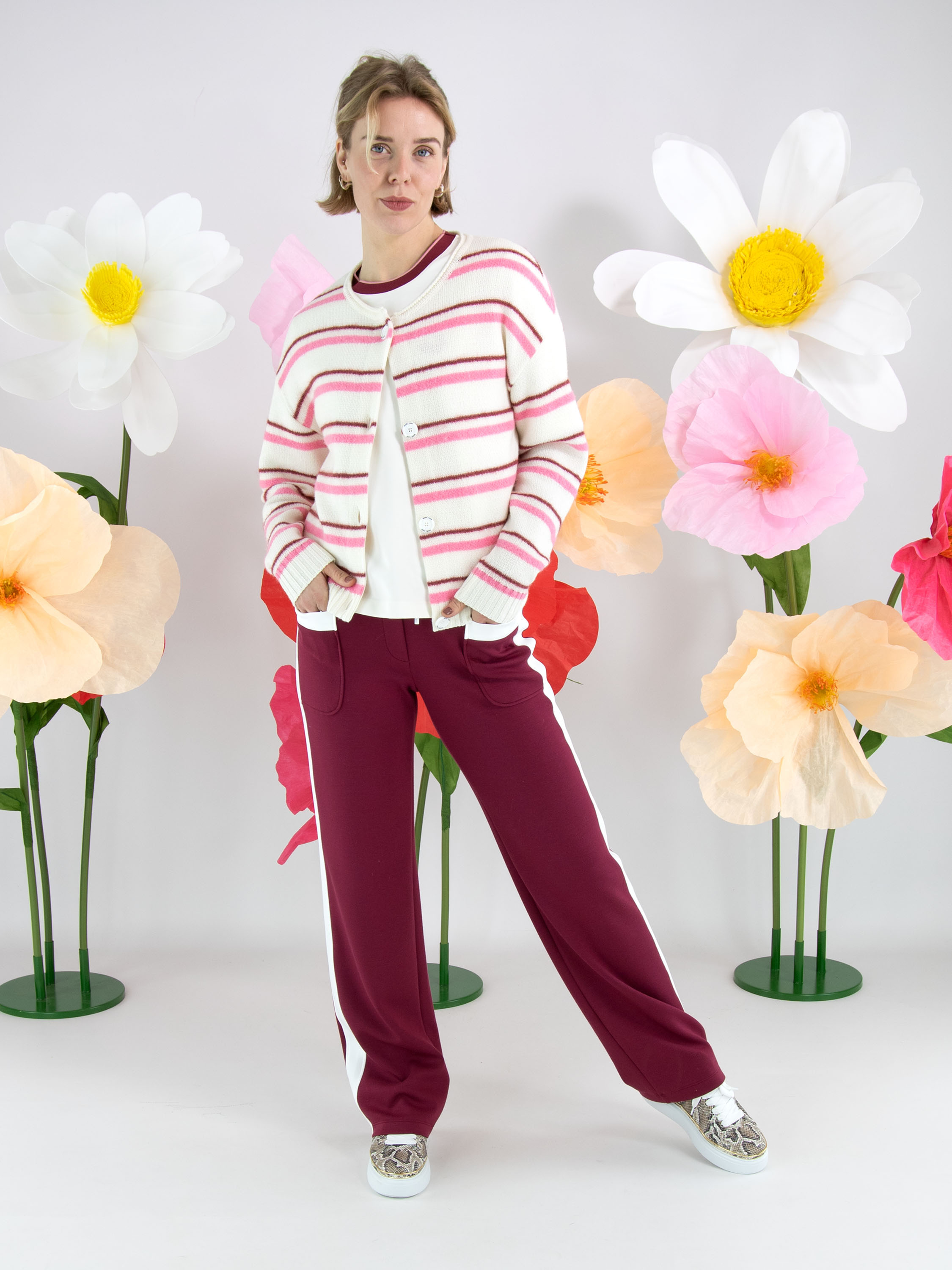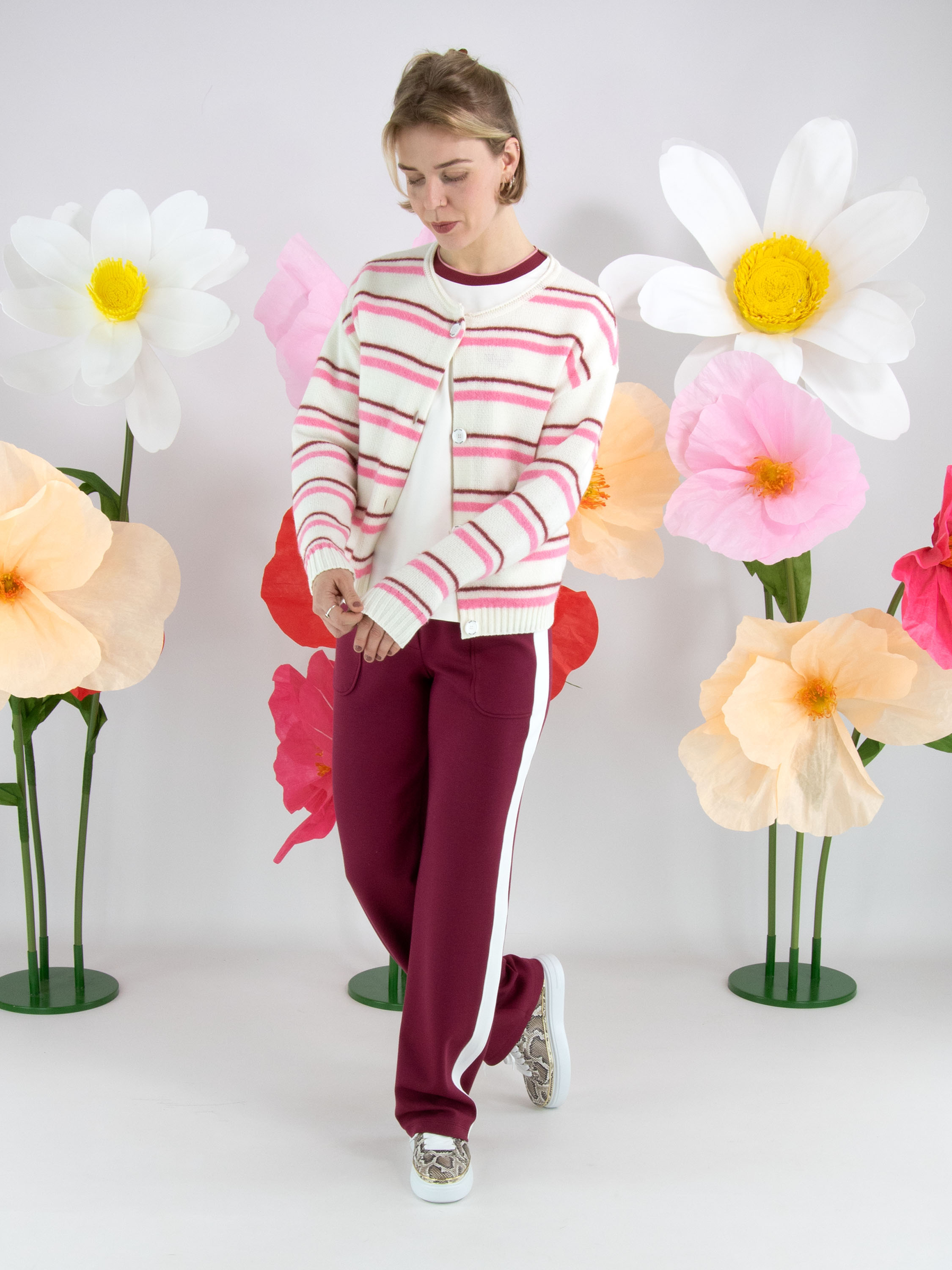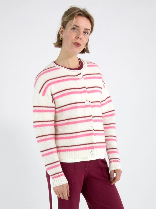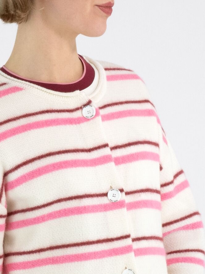 A cardigan from Marc Cain in a horizontal stripe pattern in salmon pink and burgundy on an off-white background. The cardigan has a round neckline and closes with four white buttons. At the hem is a ribbed trim in off-white. The long sleeves have ribbed cuffs in off-white. This cardigan can be hand-washed.