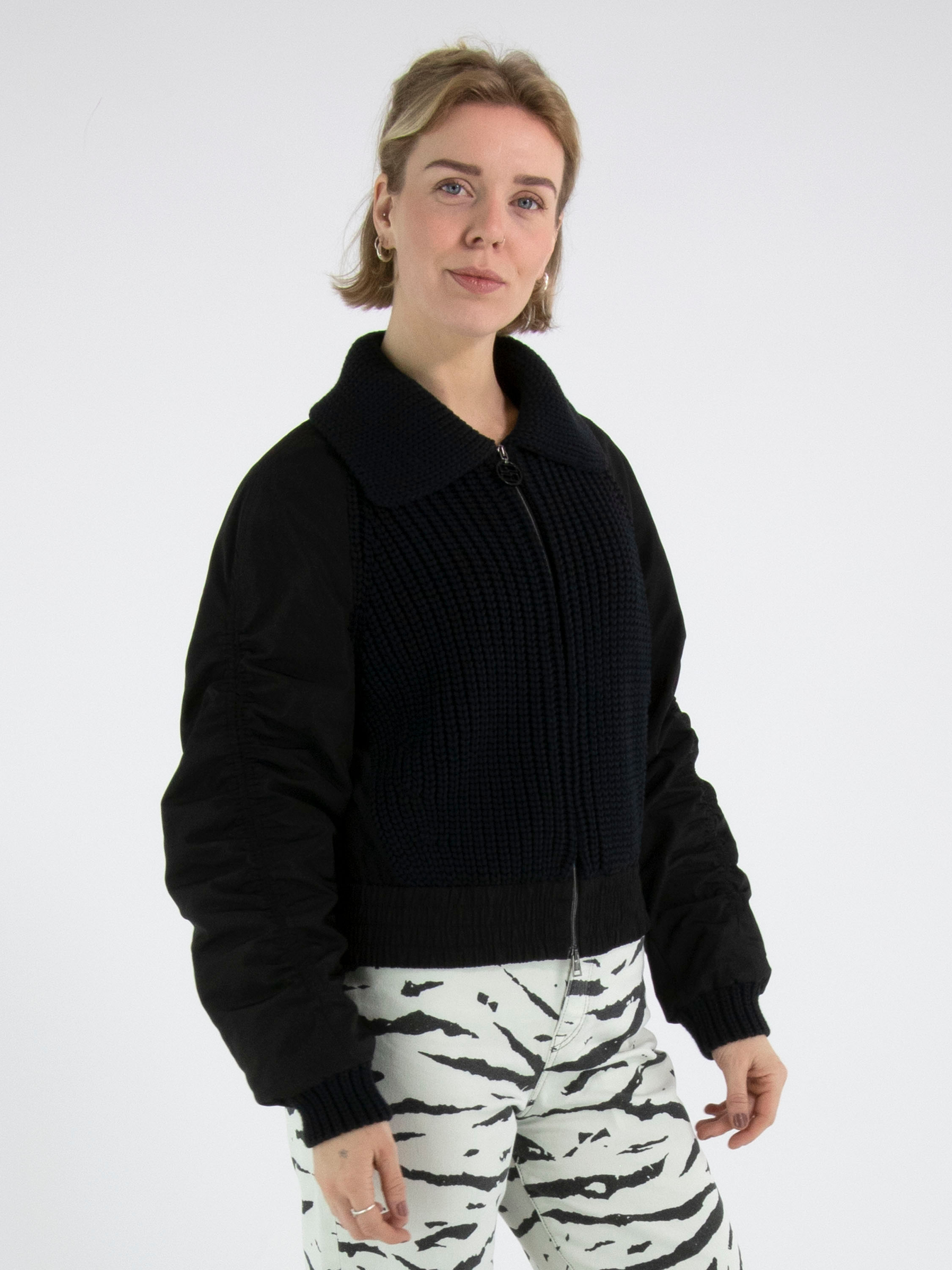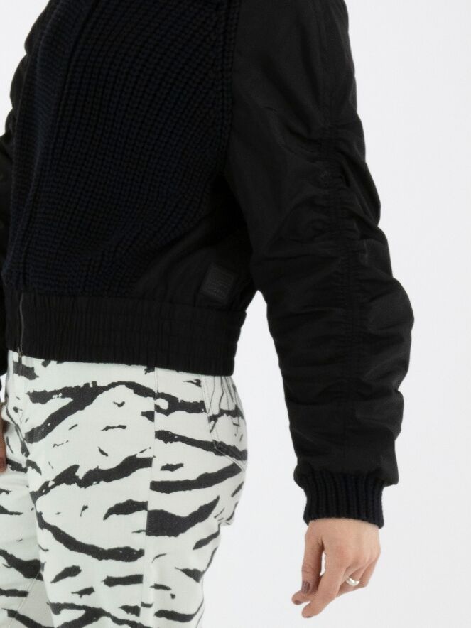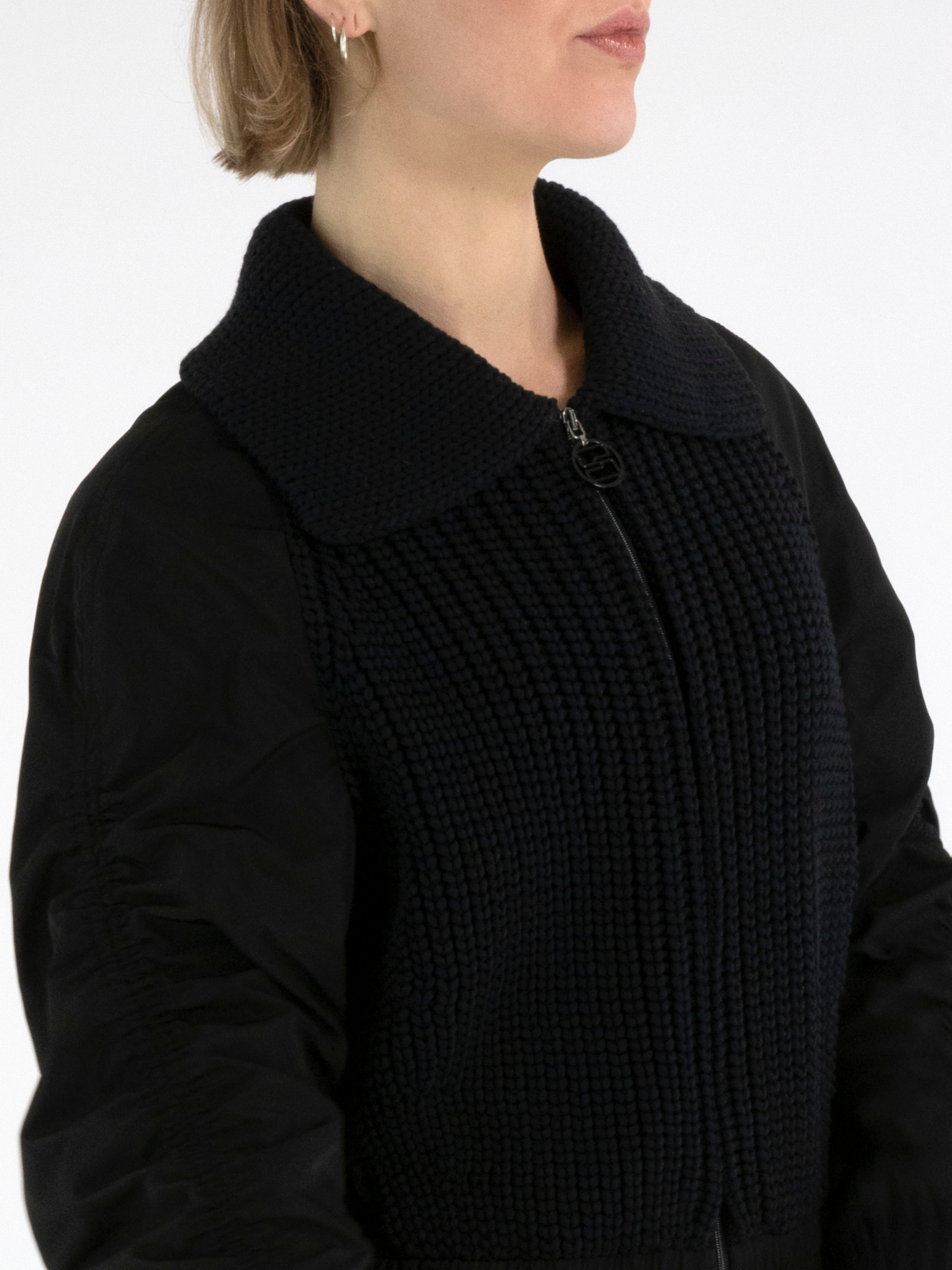 A cardigan from Marc Cain in black. The front of the cardigan, the cuffs, and the collar are knitted in a patent stitch, while the back and sleeves are made from parachute fabric. The seam along the top of the long sleeves is finely gathered on both sides. At the hem, there is a wide, finely gathered band. The cardigan has a zip fastening and can be washed at 30 degrees.