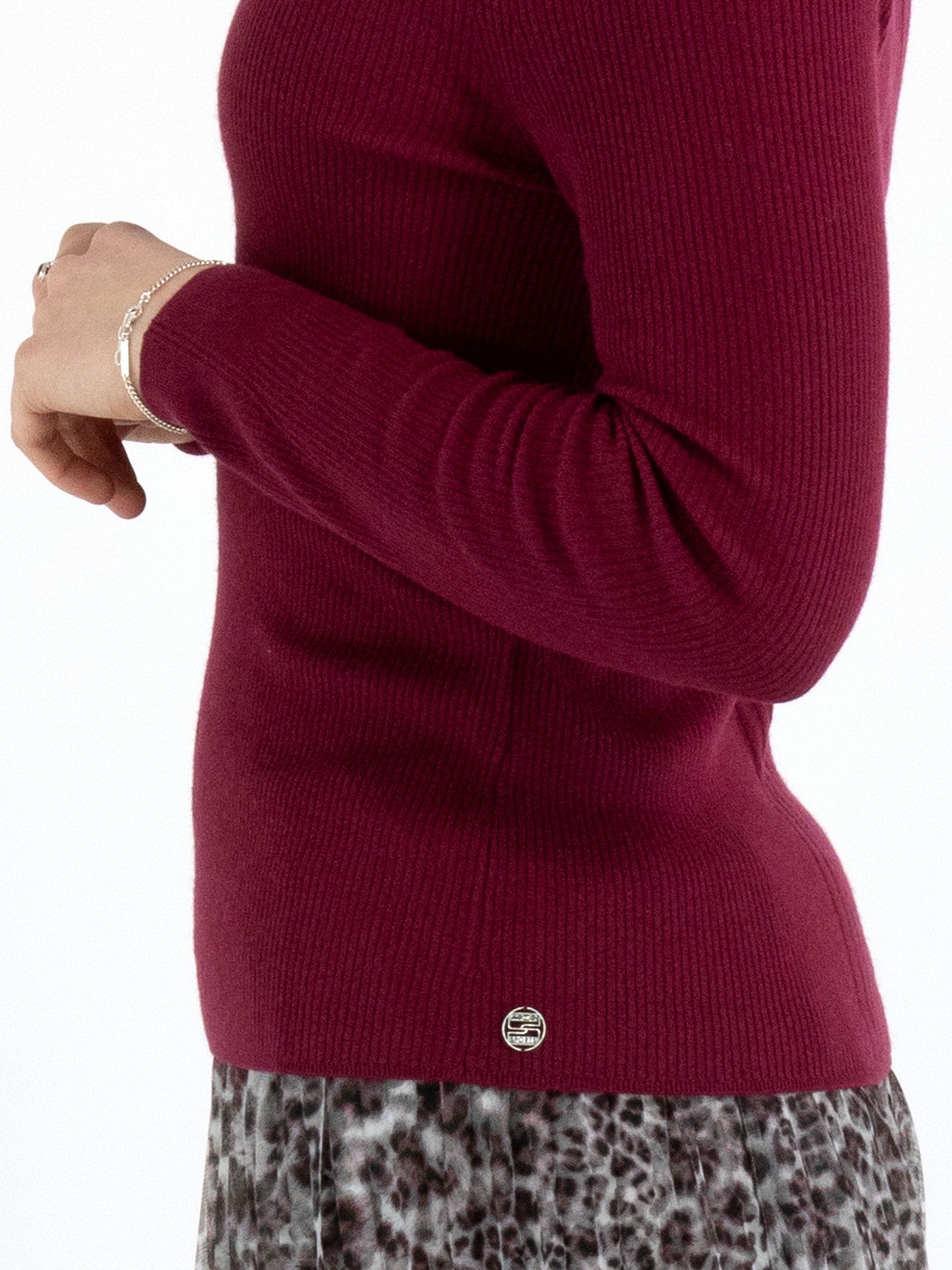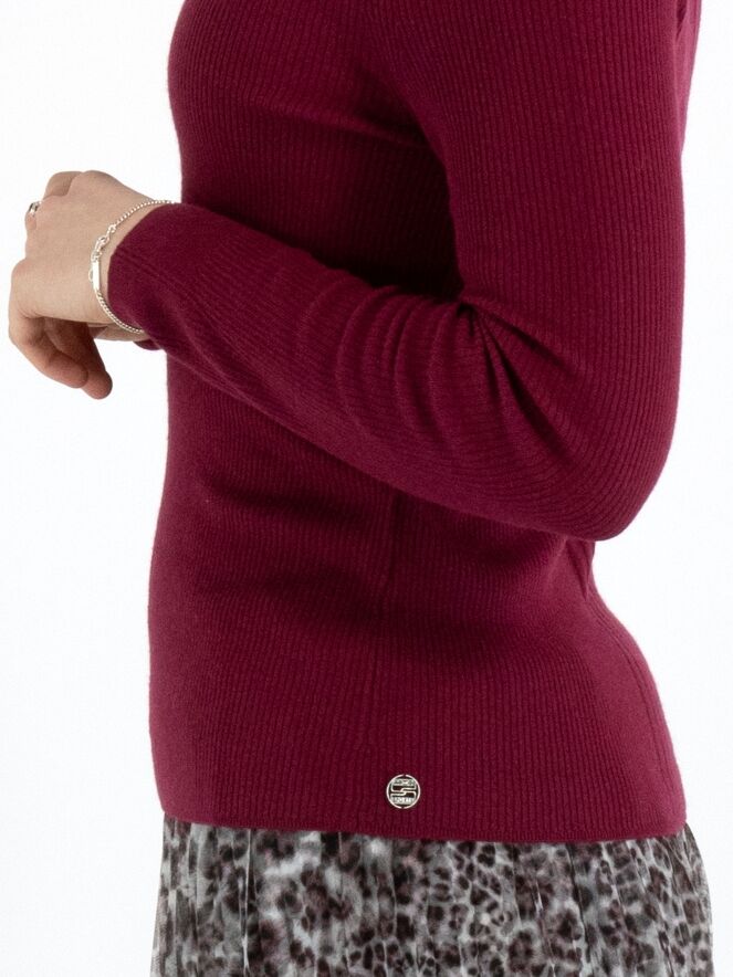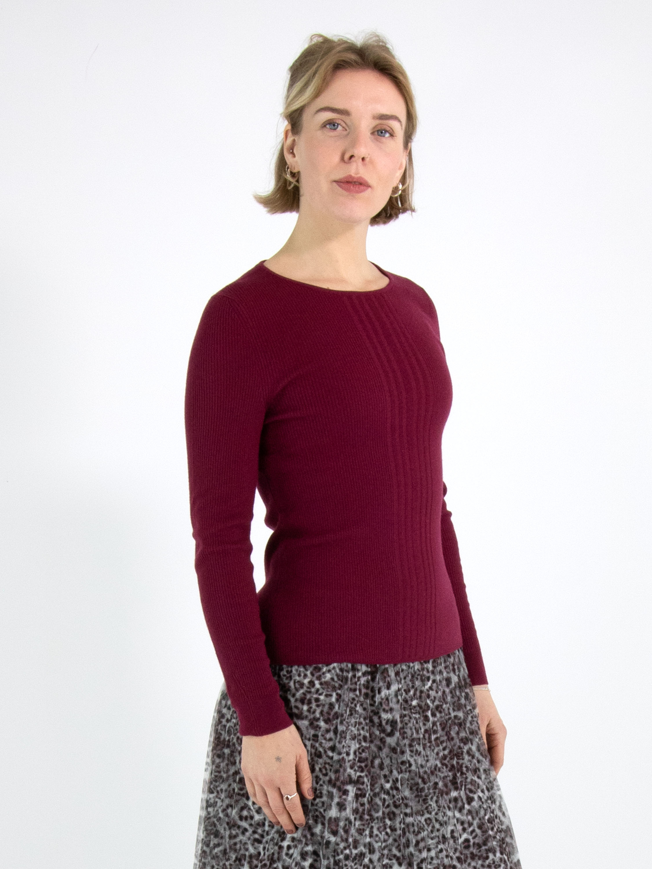 A pullover from Marc Cain in burgundy. The fabric is finely ribbed, with a wide panel at the front where the ribbing is broader. The pullover has a round neckline and long sleeves. This pullover can be hand-washed.