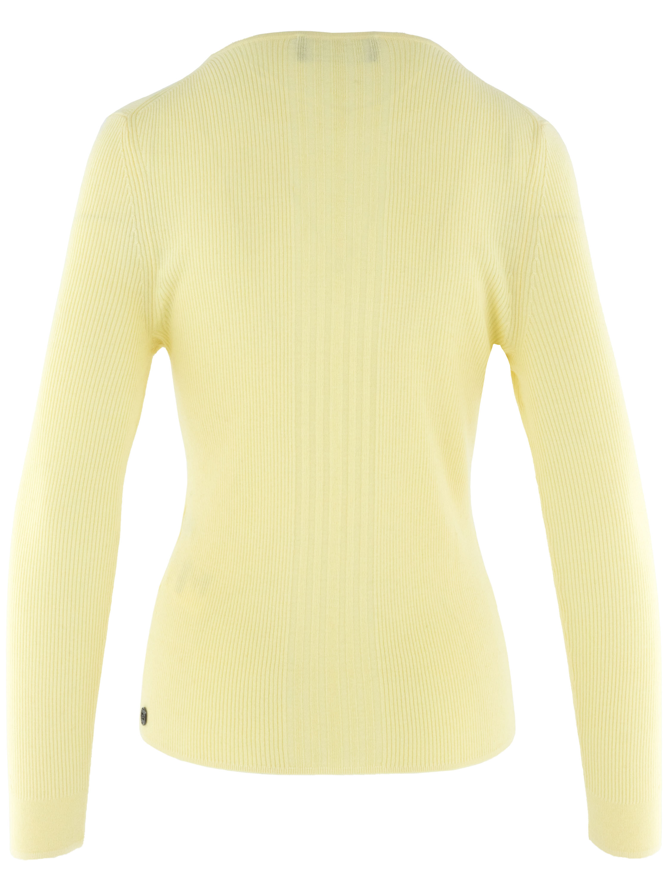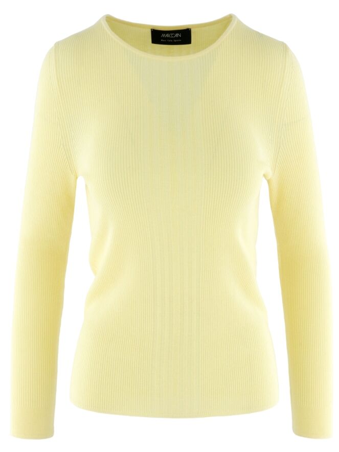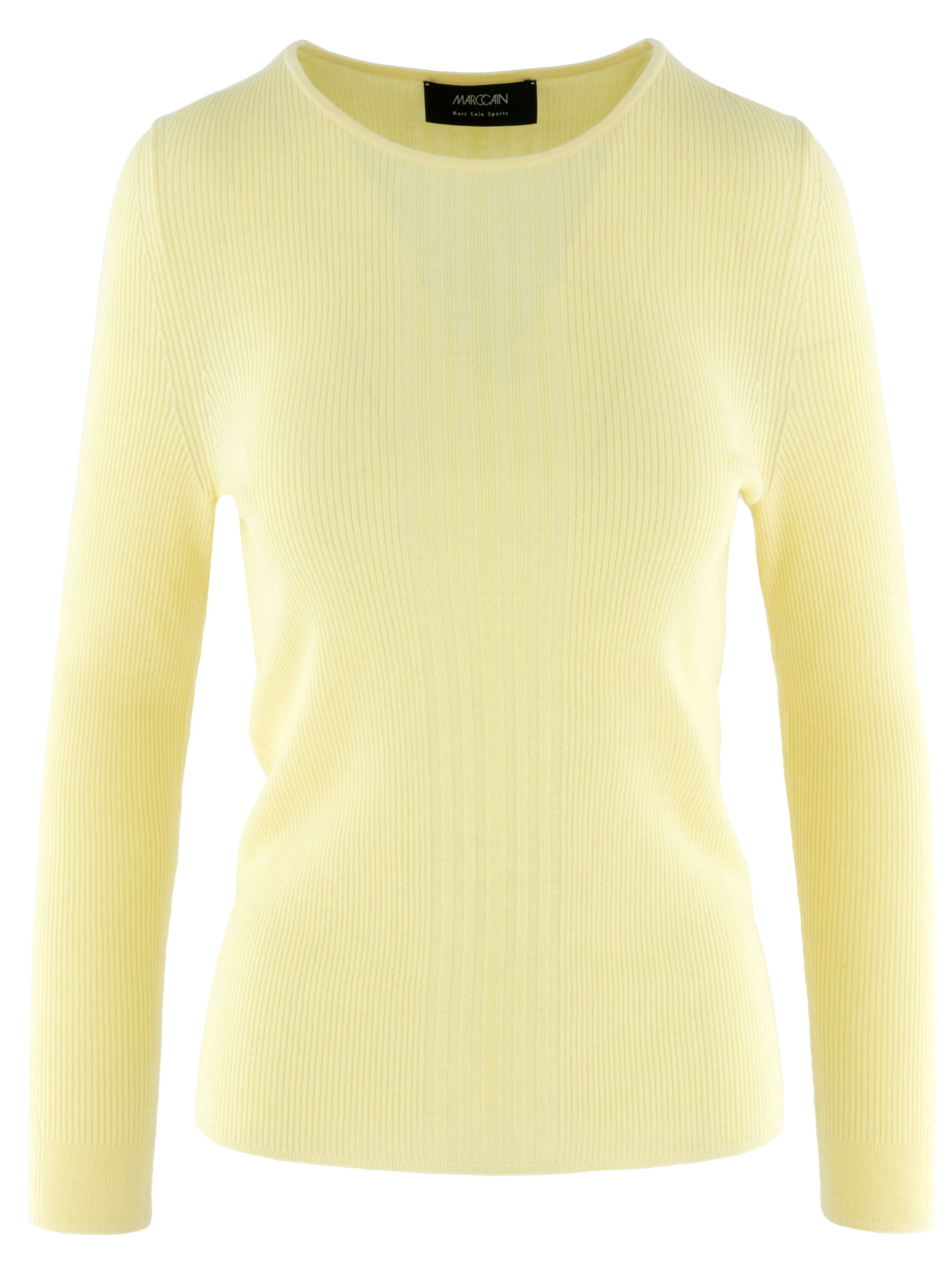 A pullover from Marc Cain in yellow. The fabric is finely ribbed, with a wide panel at the front where the ribbing is broader. The pullover has a round neckline and long sleeves. This pullover can be hand-washed.