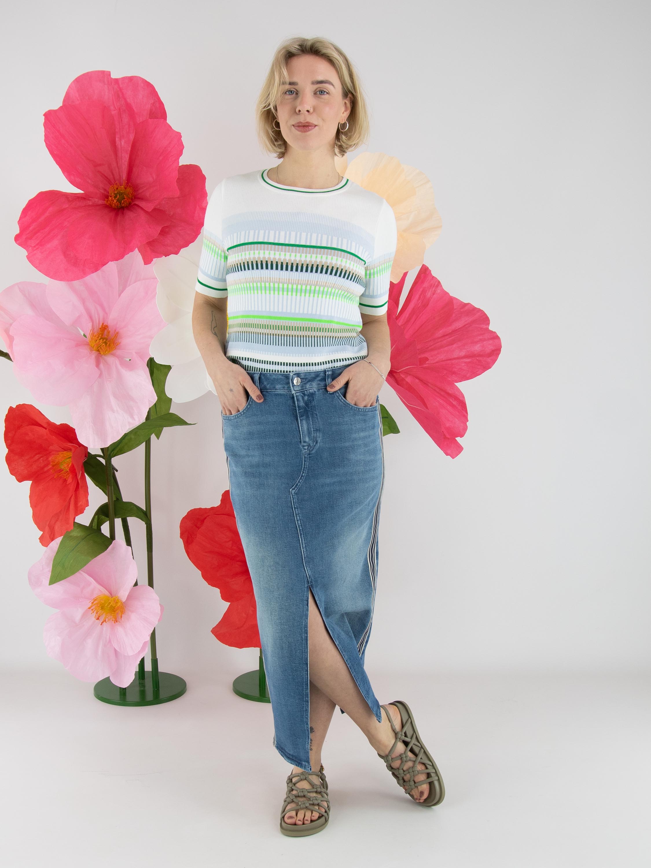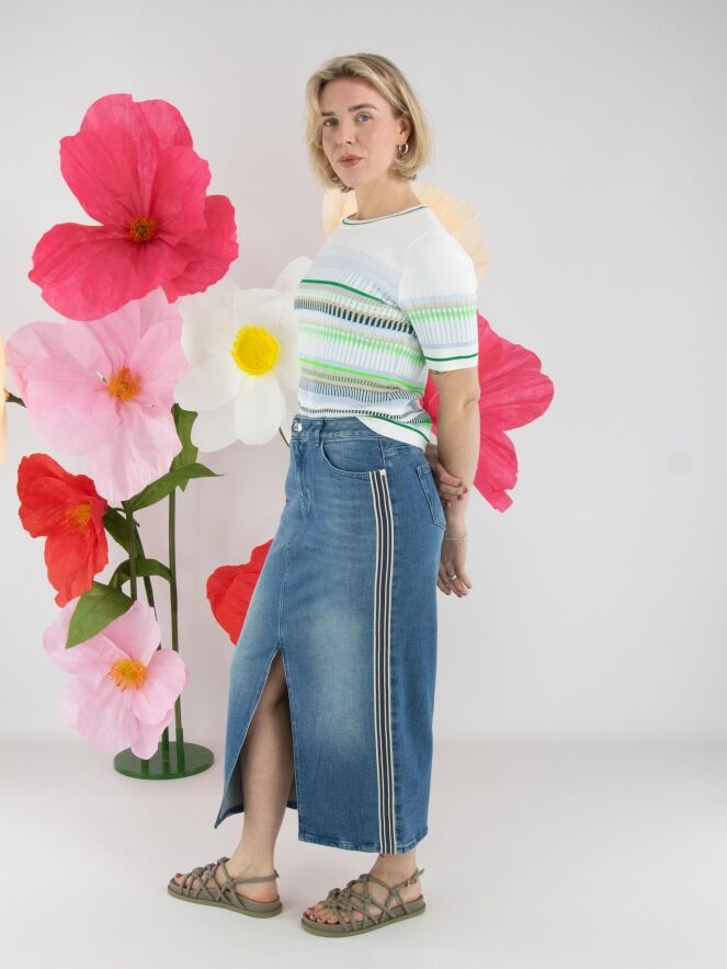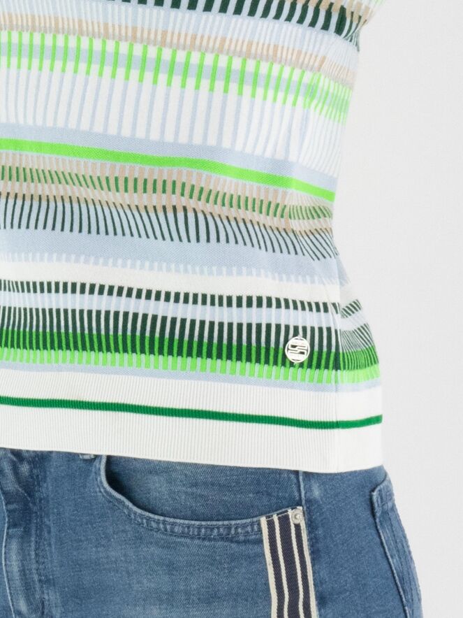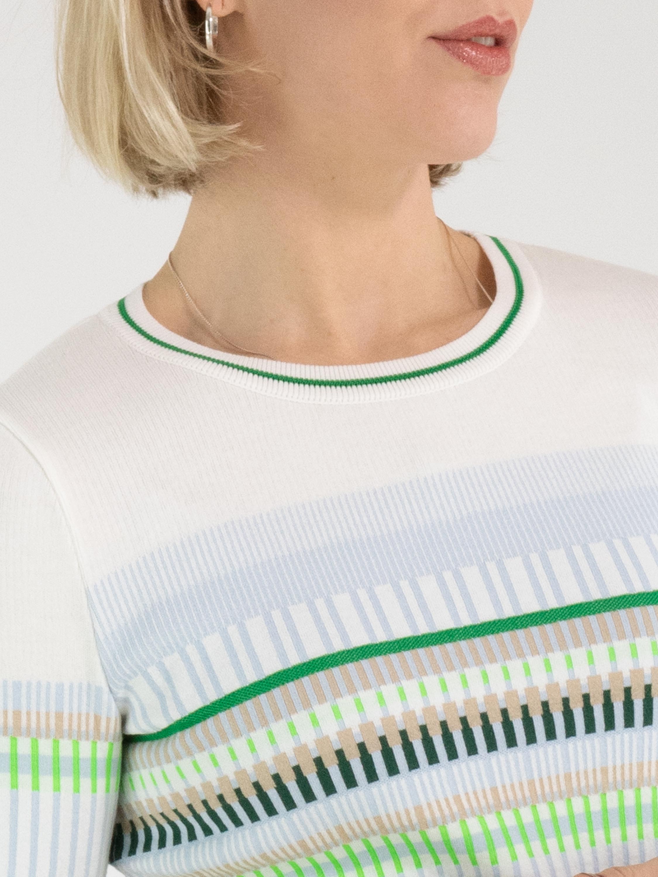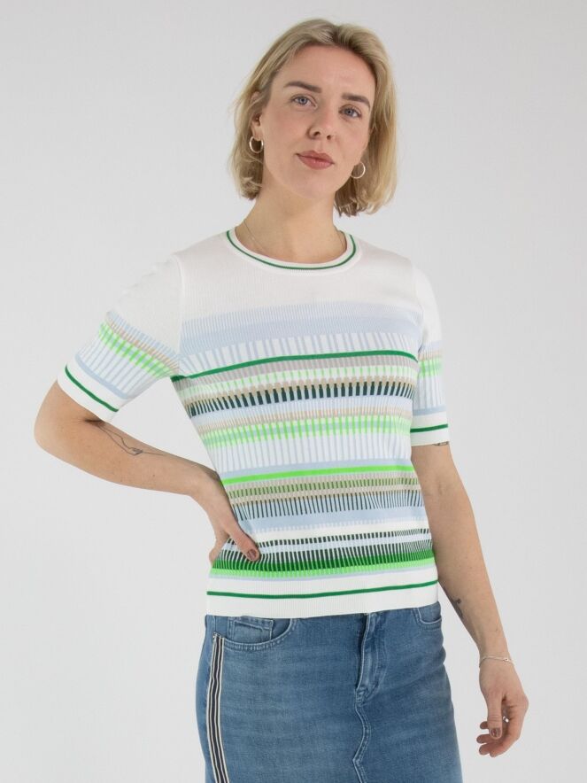 A shirt by Marc Cain featuring a striped pattern in blue, sand, light and dark green, and white. The edges of the round neckline, the hem and the short sleeves are finished with a finely ribbed knit trim featuring a striped pattern in green and cream white. This shirt can be washed at 30 degrees.