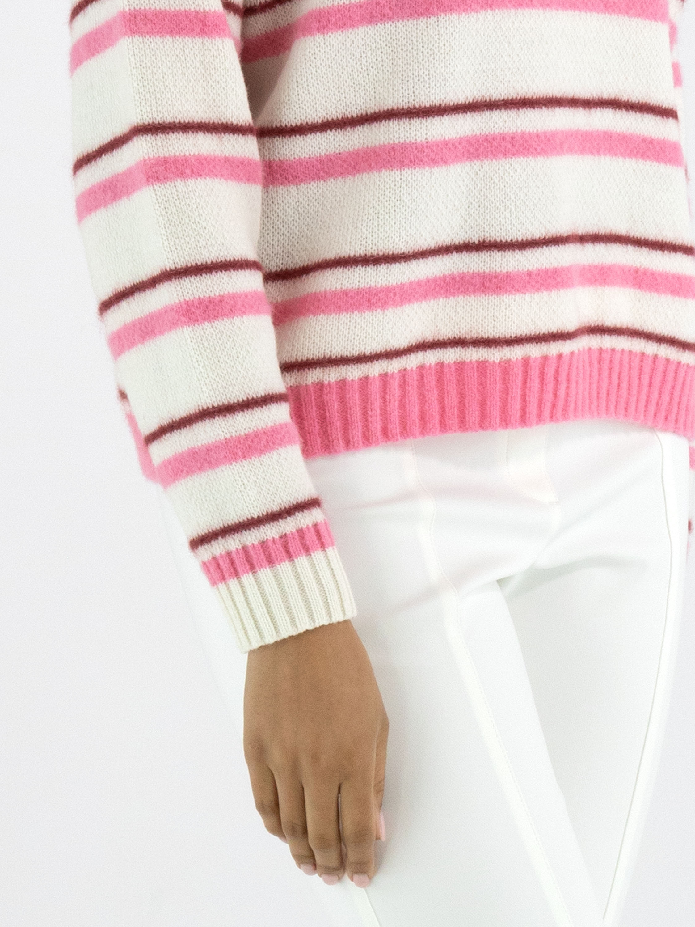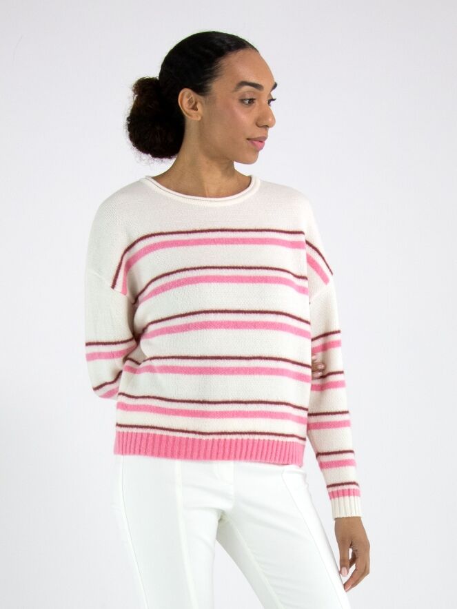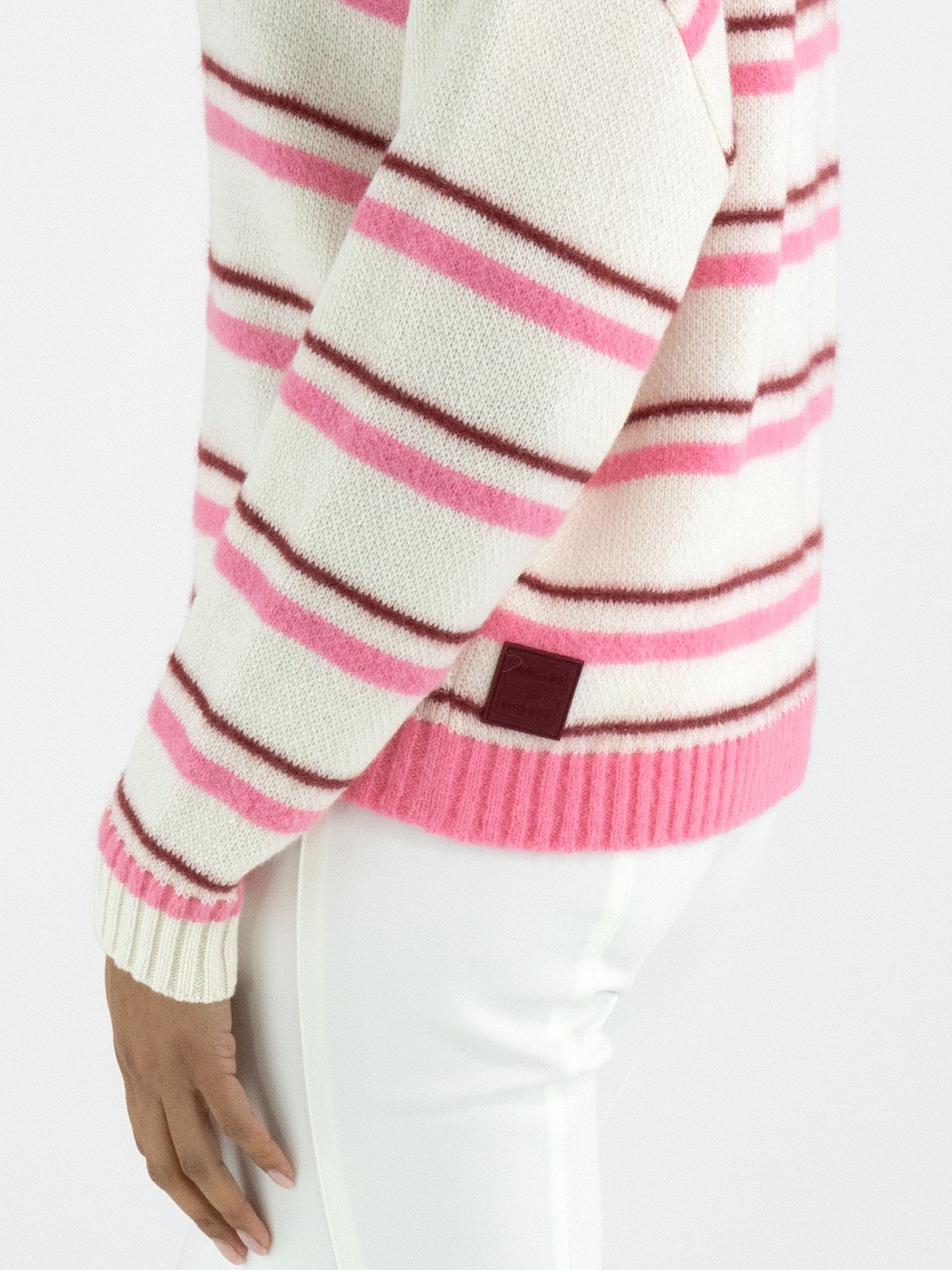 A pullover from Marc Cain with a horizontal stripe pattern in salmon pink and burgundy on an off-white background. The pullover has a round neckline. The hem features a ribbed trim in salmon pink. The long sleeves have ribbed cuffs in off-white and salmon pink. This pullover can be hand-washed.