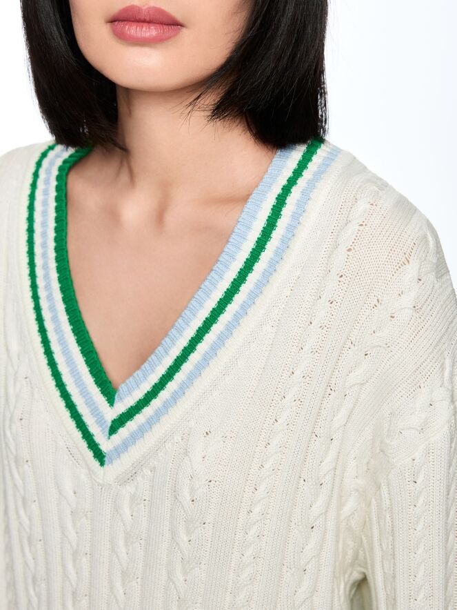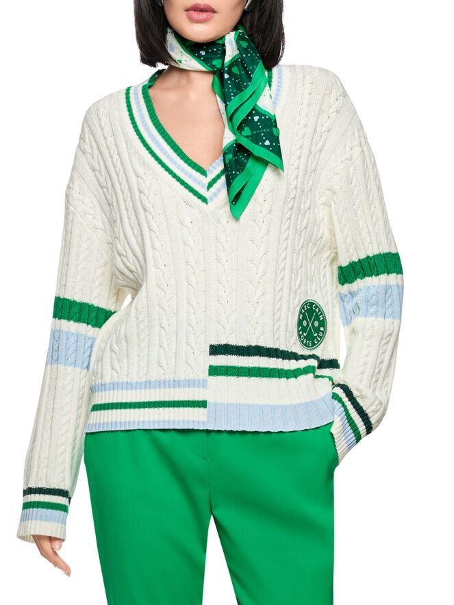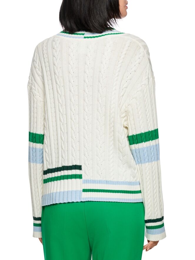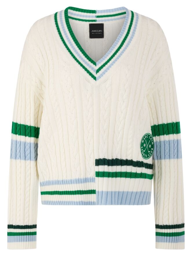 A cable-knit pullover by Marc Cain in cream white. Along the edge of the V-neckline, the hem and the ends of the long sleeves, a ribbed knit trim is applied featuring a striped pattern in blue, bright green and dark green. At upper-arm level, a stripe in blue and bright green is added. On the right side at waist level, a “Marc Cain Sports Club” emblem is placed. This pullover can be washed at 30 degrees.