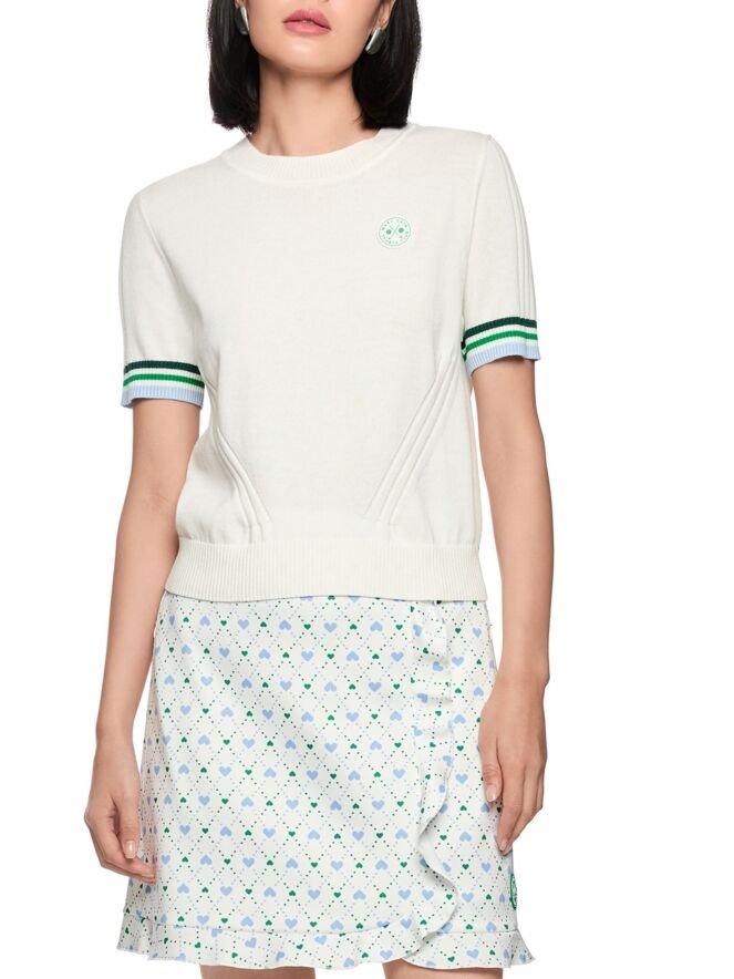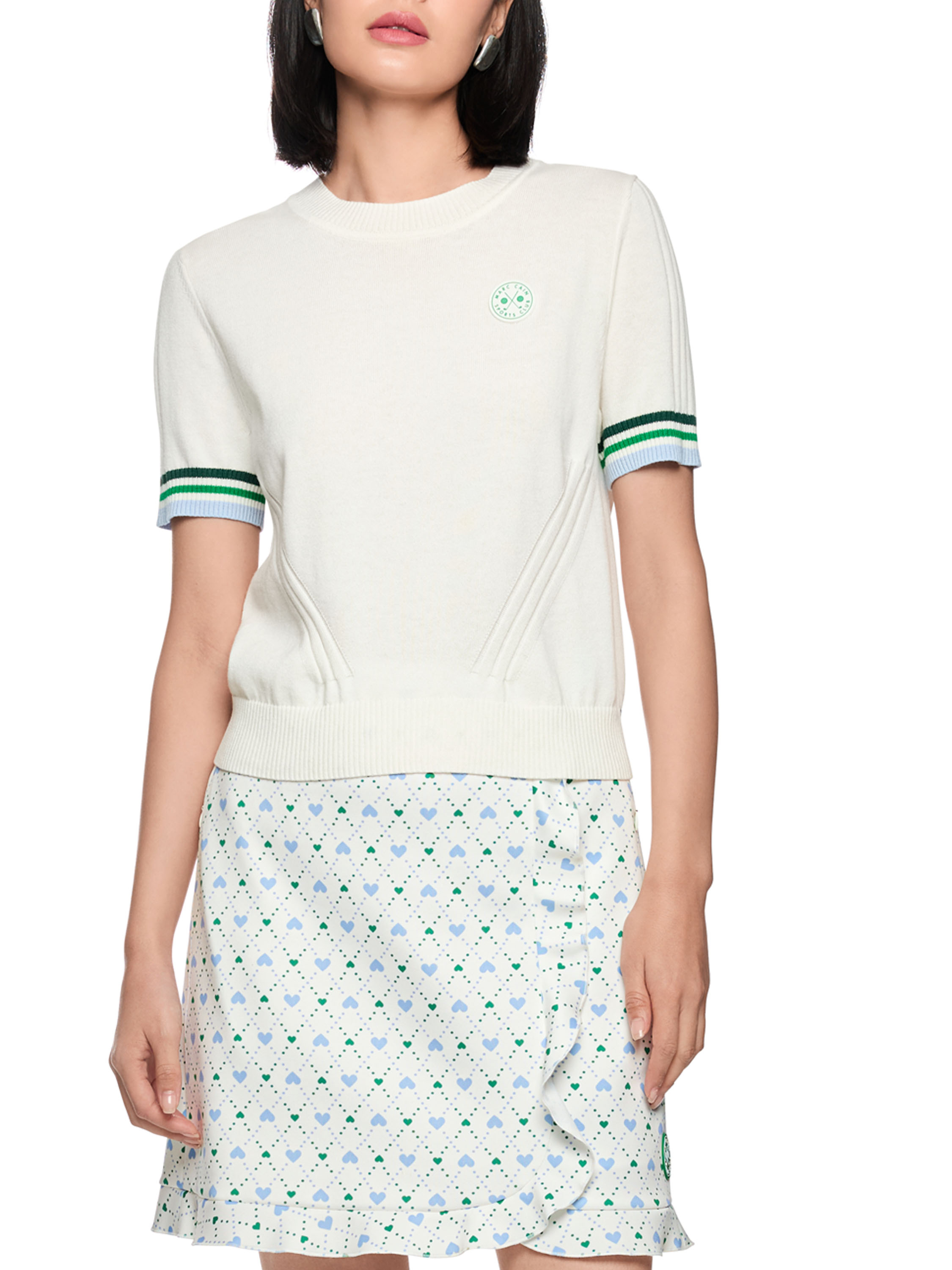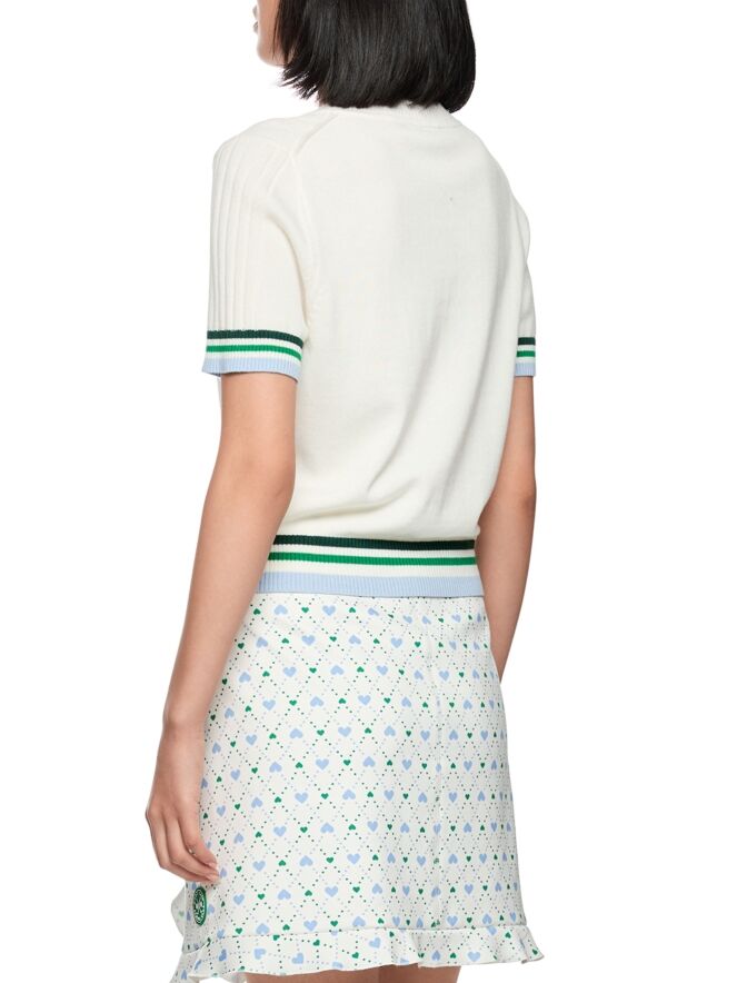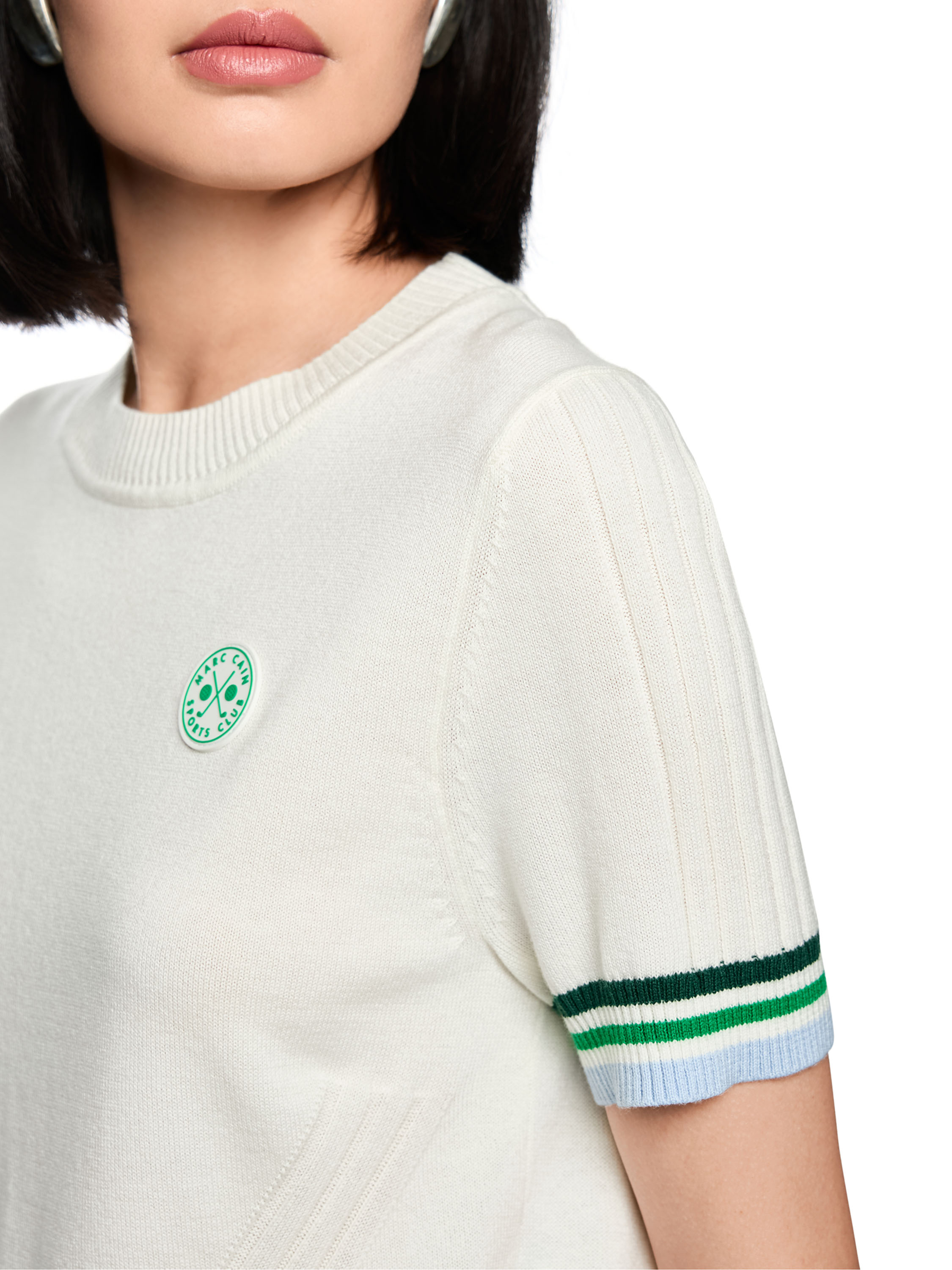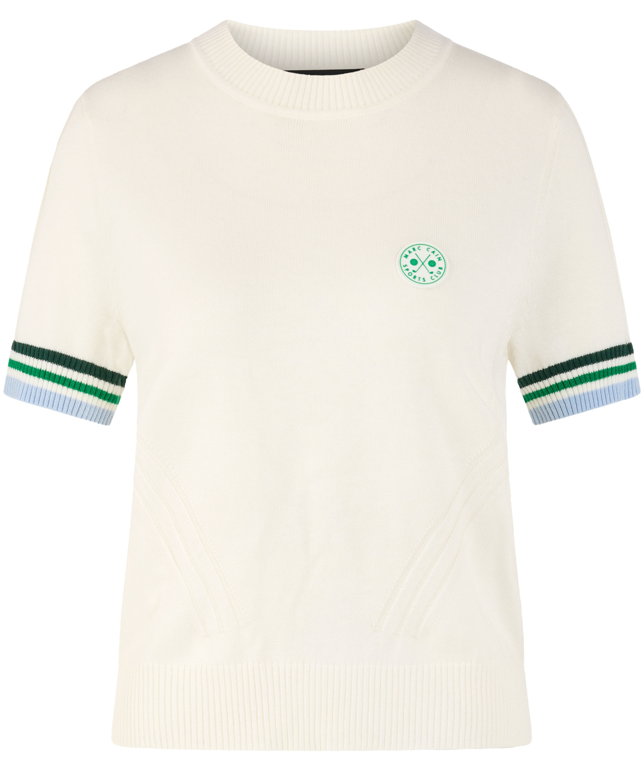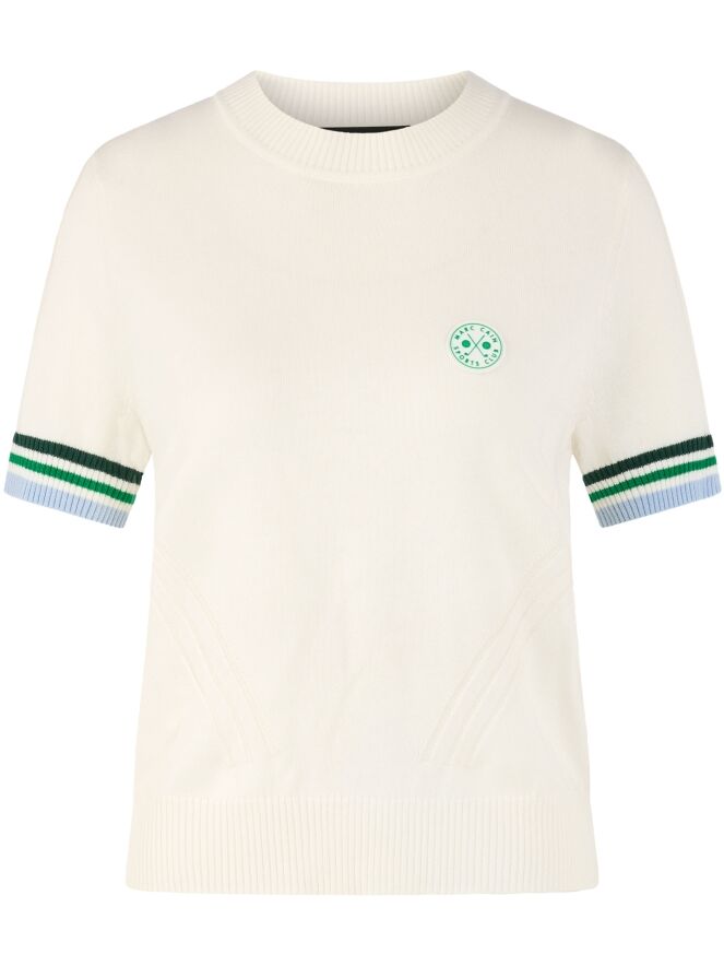 A short-sleeved pullover by Marc Cain in cream white. The edges of the short sleeves and the lower back hem are finished with a ribbed knit trim featuring a striped pattern in blue, bright green and dark green. The pullover has a high round neckline and can be washed at 30 degrees.