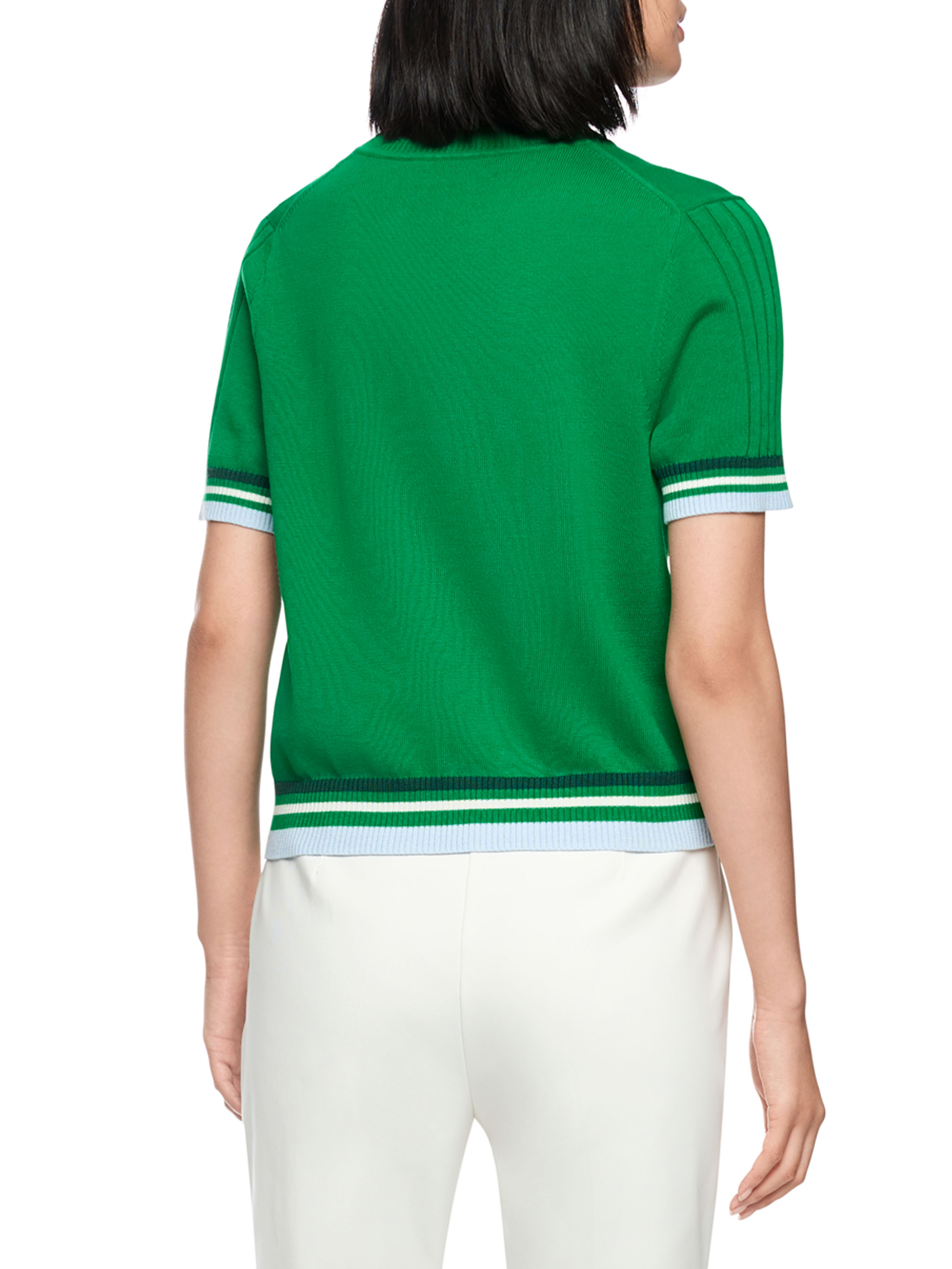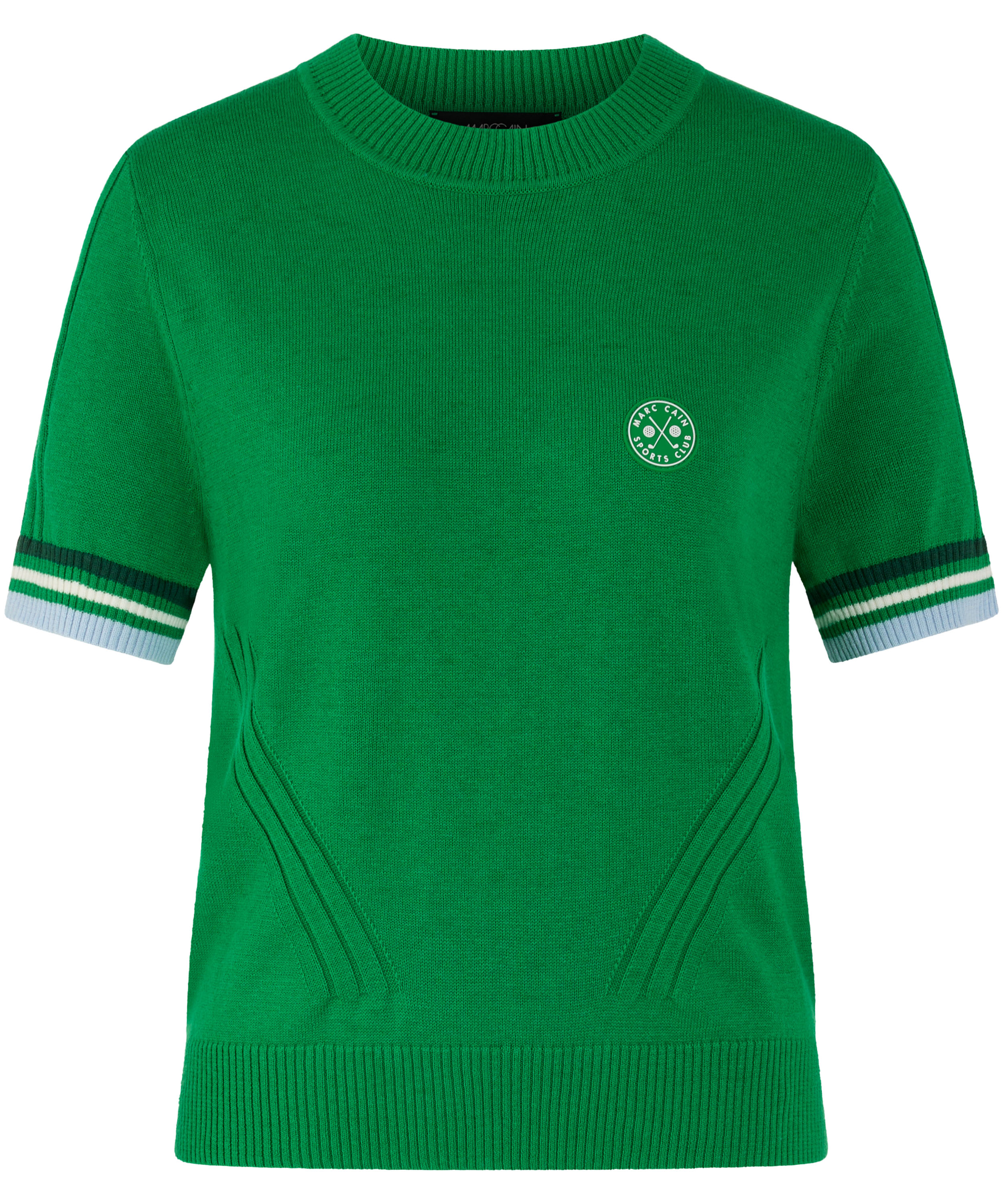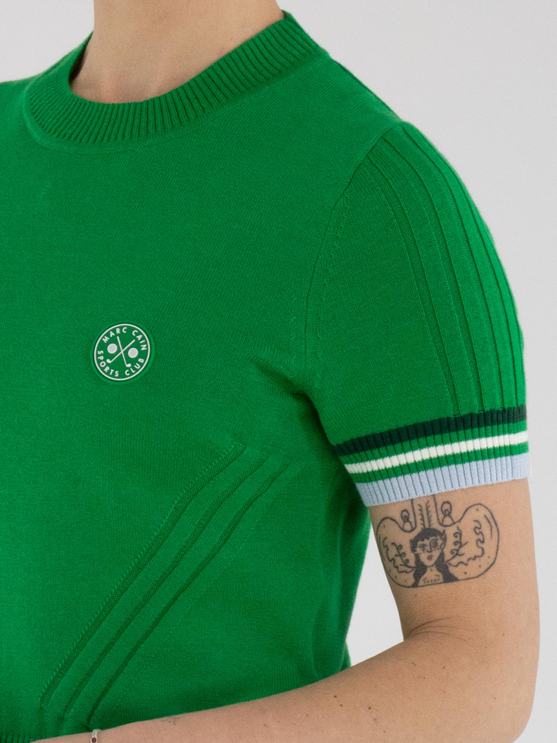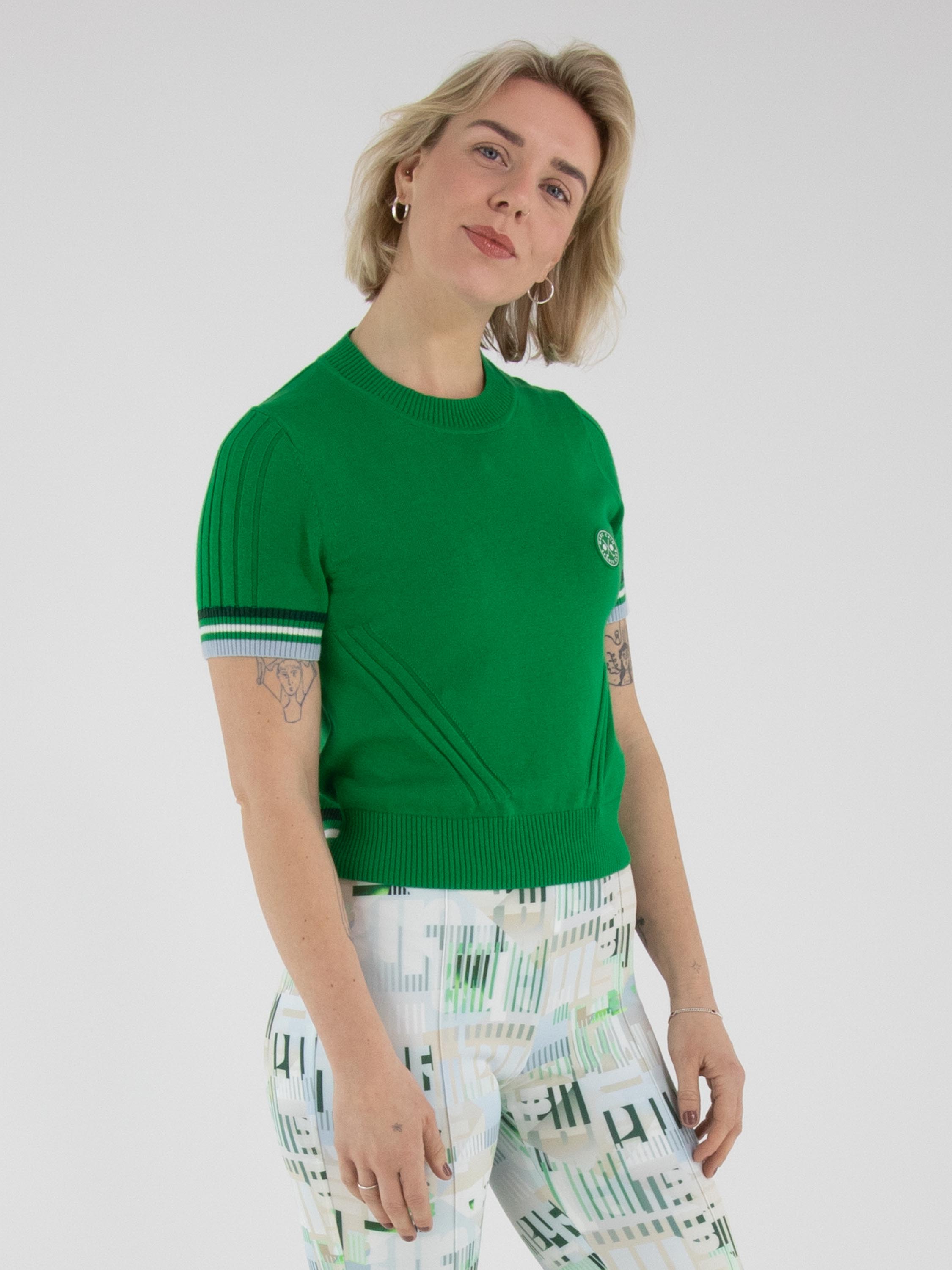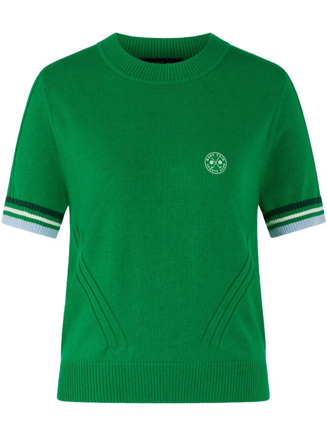A short-sleeved pullover by Marc Cain in green. The edges of the short sleeves and the back hem are finished with a ribbed knit trim featuring a striped pattern in blue, cream white and dark green. The pullover has a high round neckline and can be washed at 30 degrees.