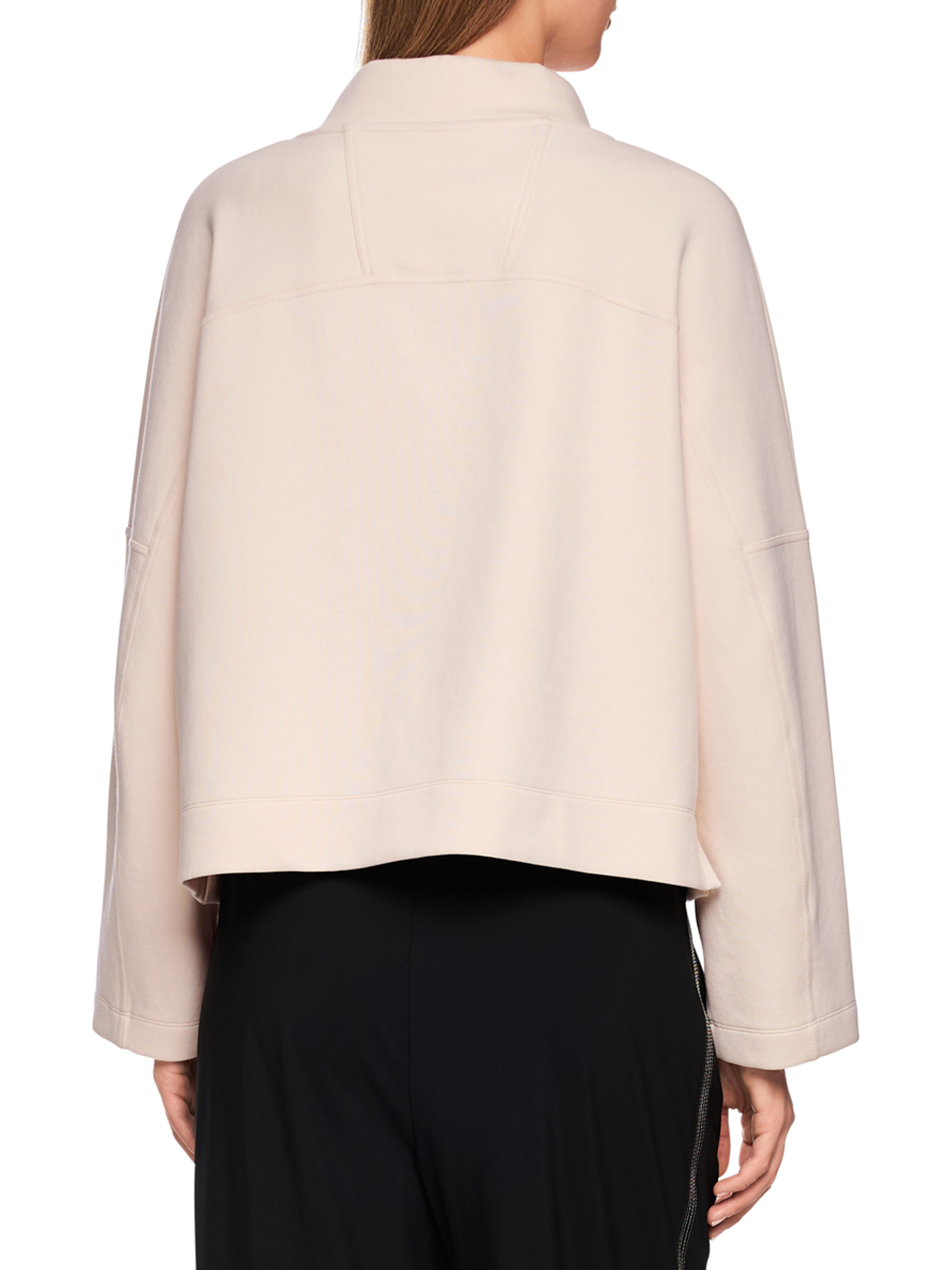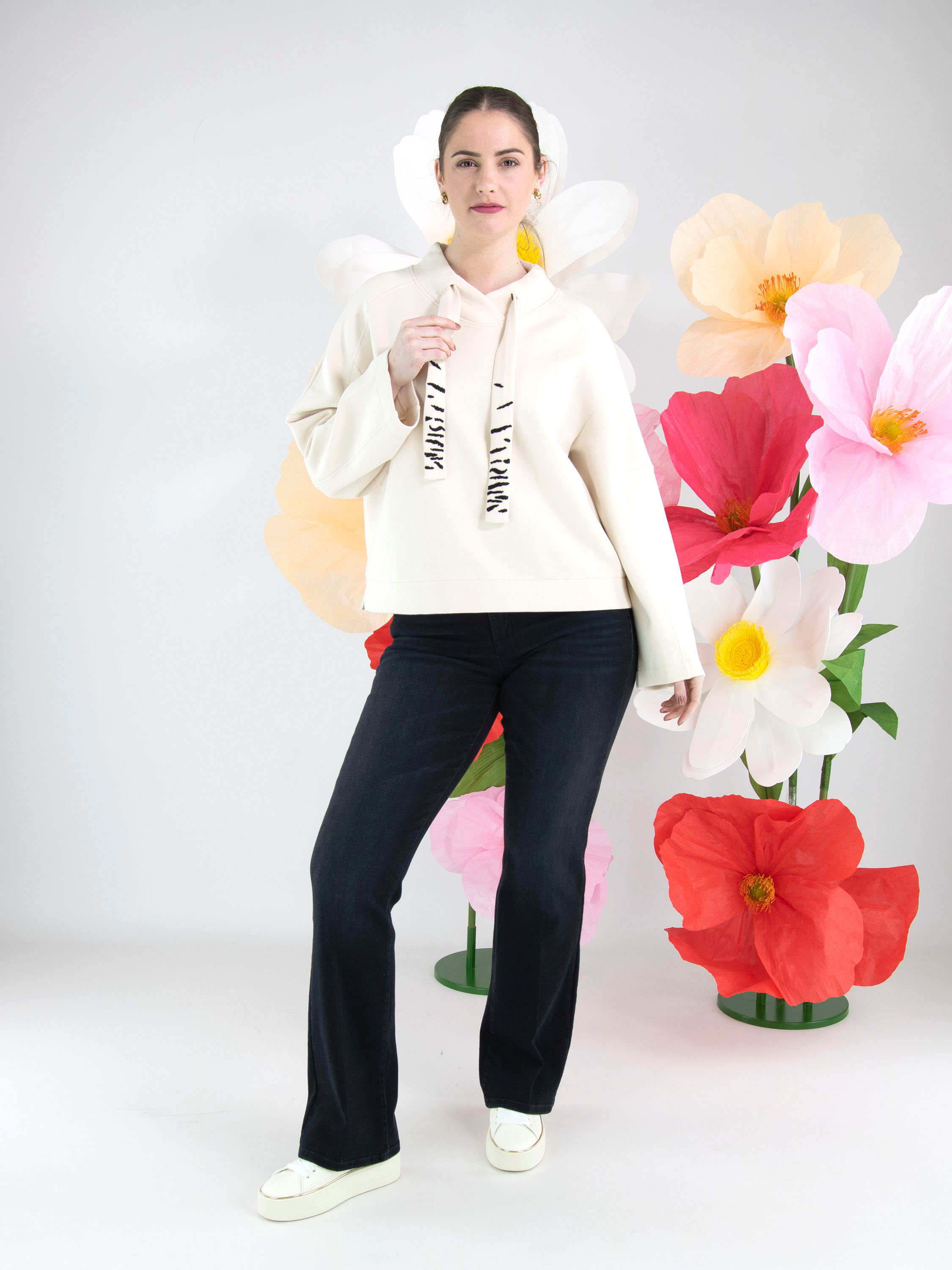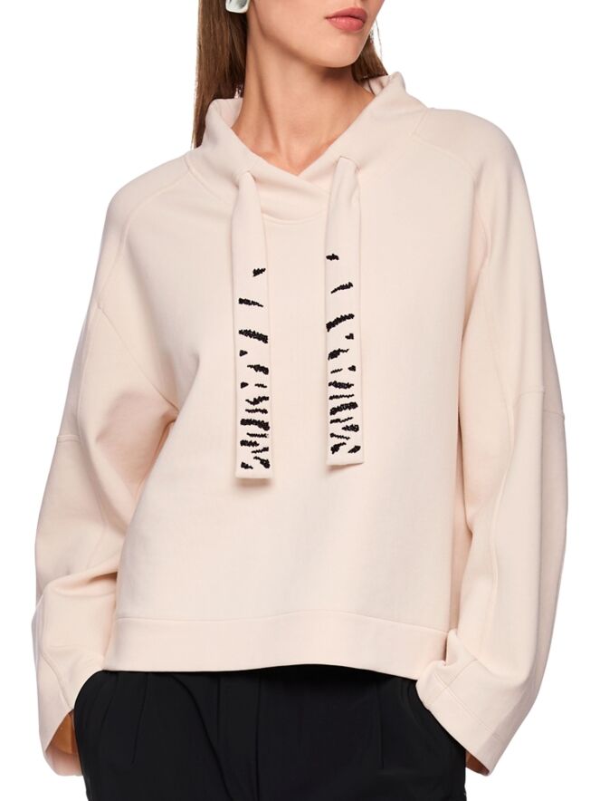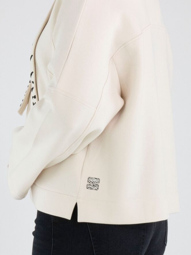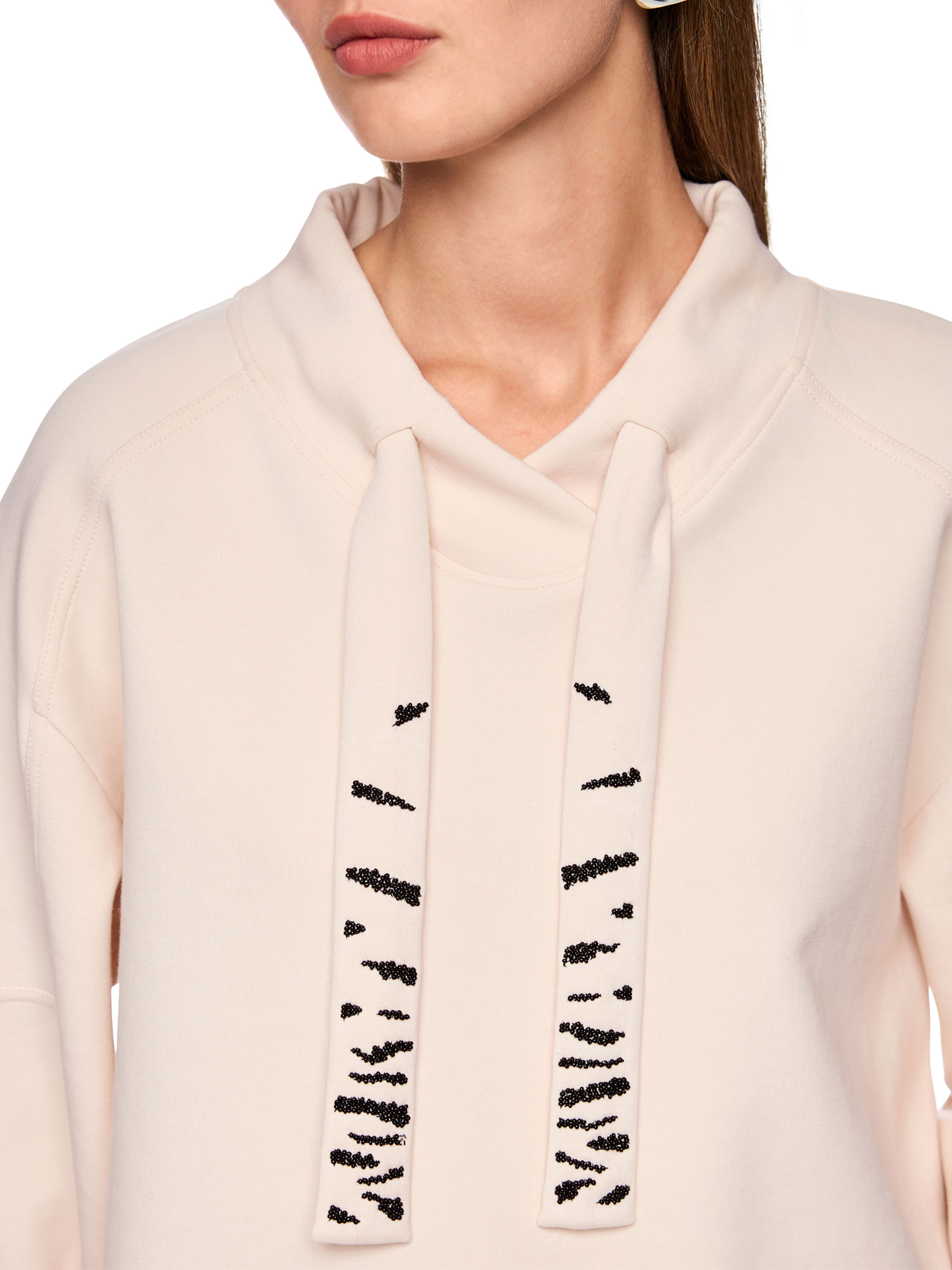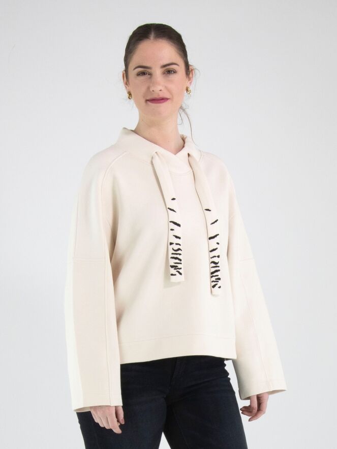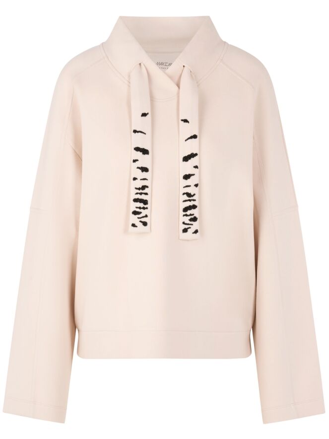 A sweater from Marc Cain in beige. From the neckline runs a beige ribbon with black rhinestones in a zebra pattern. This sweater can be washed at 30 degrees.