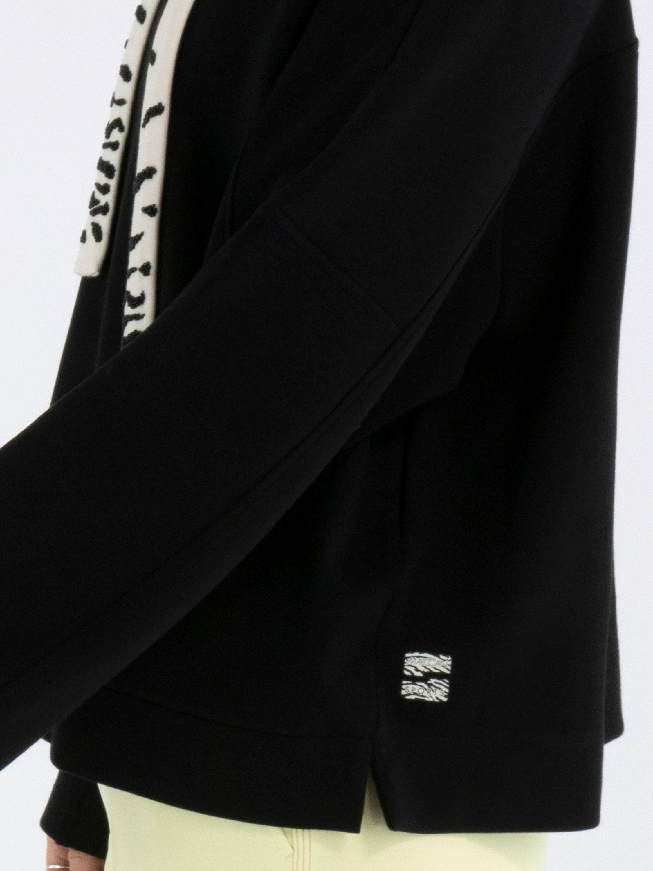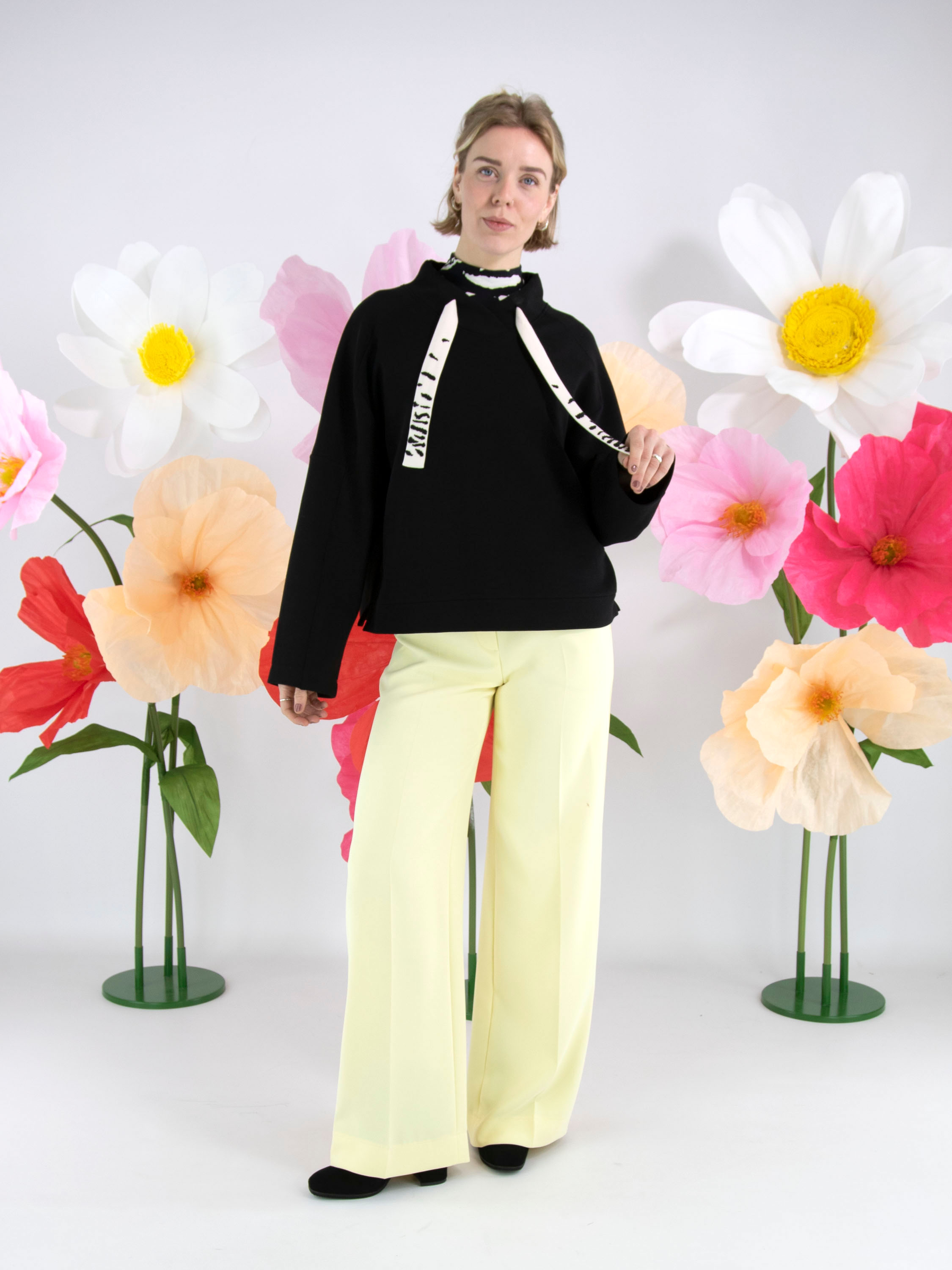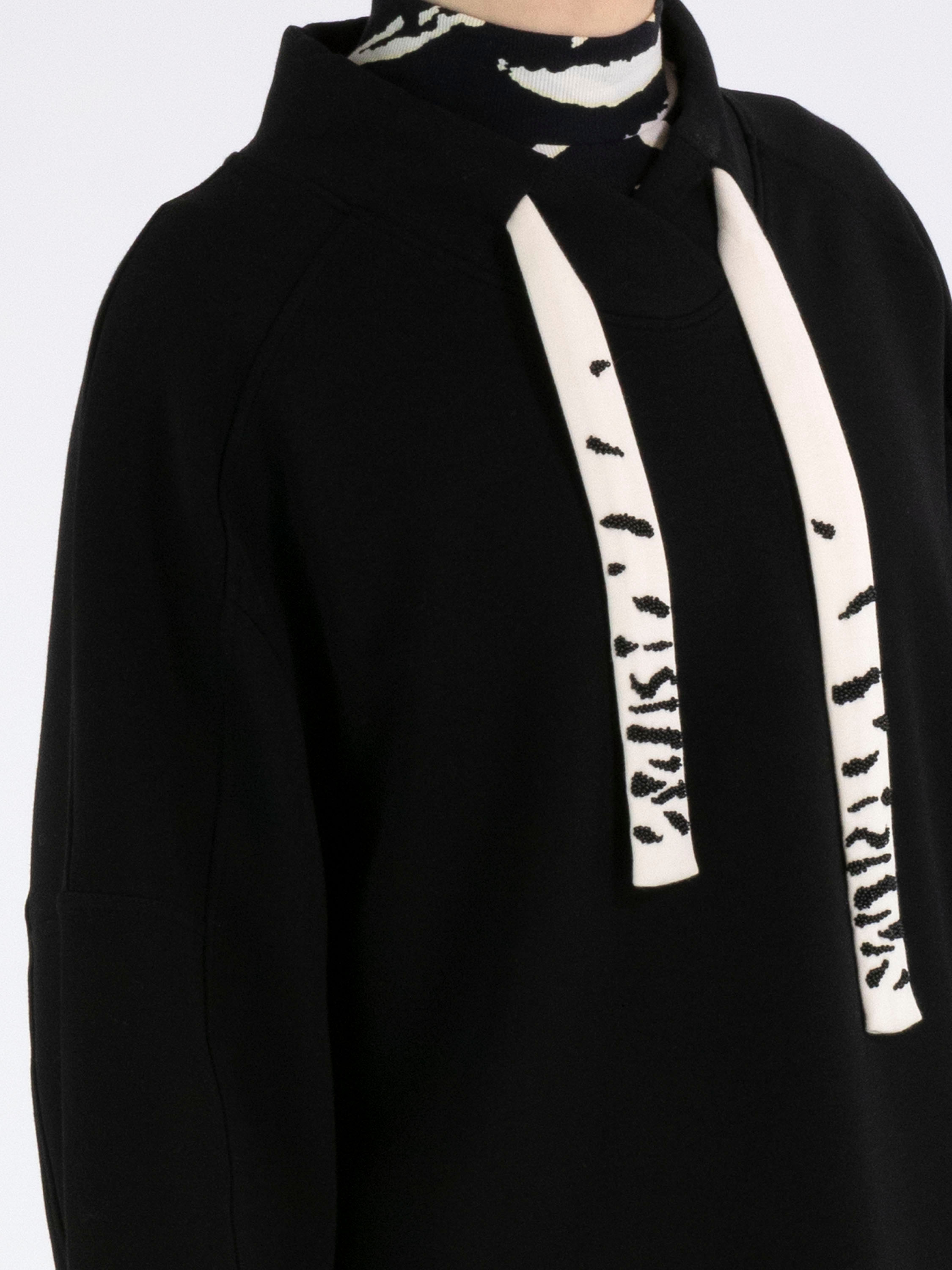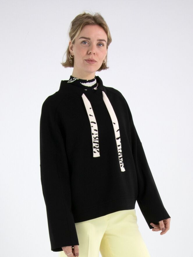 A sweater from Marc Cain in black. From the neckline runs a beige ribbon with black rhinestones in a zebra pattern. This sweater can be washed at 30 degrees.
