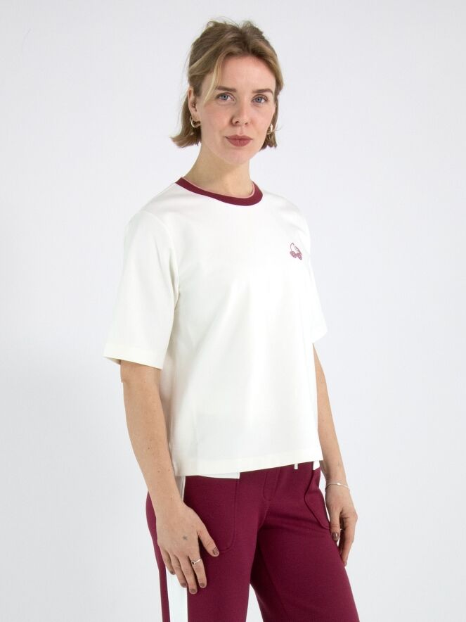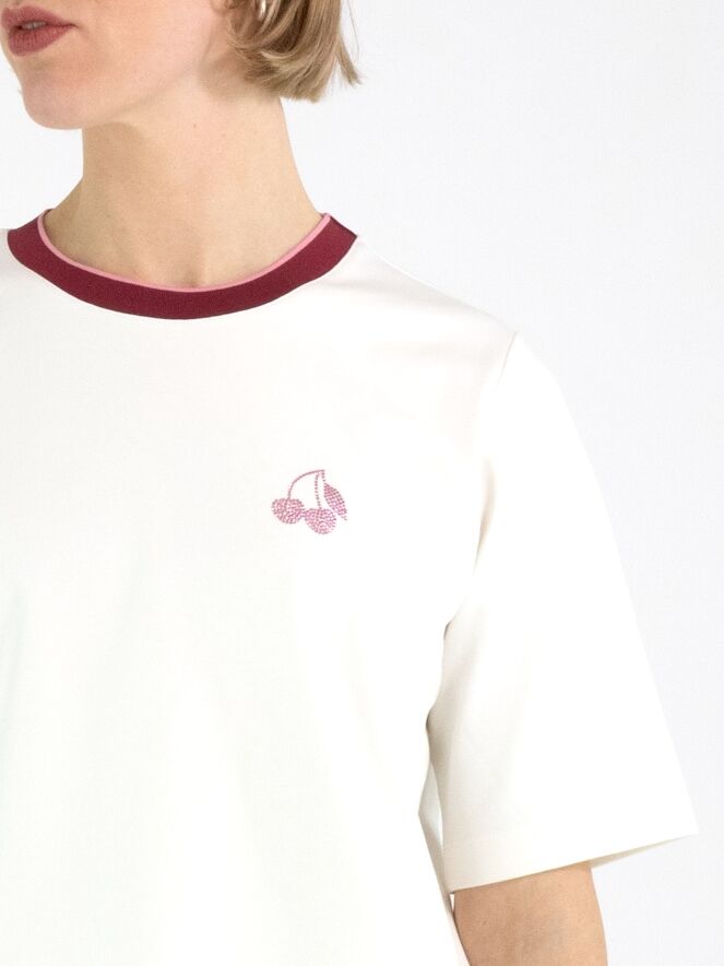 A wide, straight-cut shirt from Marc Cain in off-white, featuring a cherry emblem made of rhinestones. The round neckline is finished with a finely ribbed knit trim in a striped pattern in burgundy and pastel pink. The shirt has short sleeves and can be washed at 30 degrees.