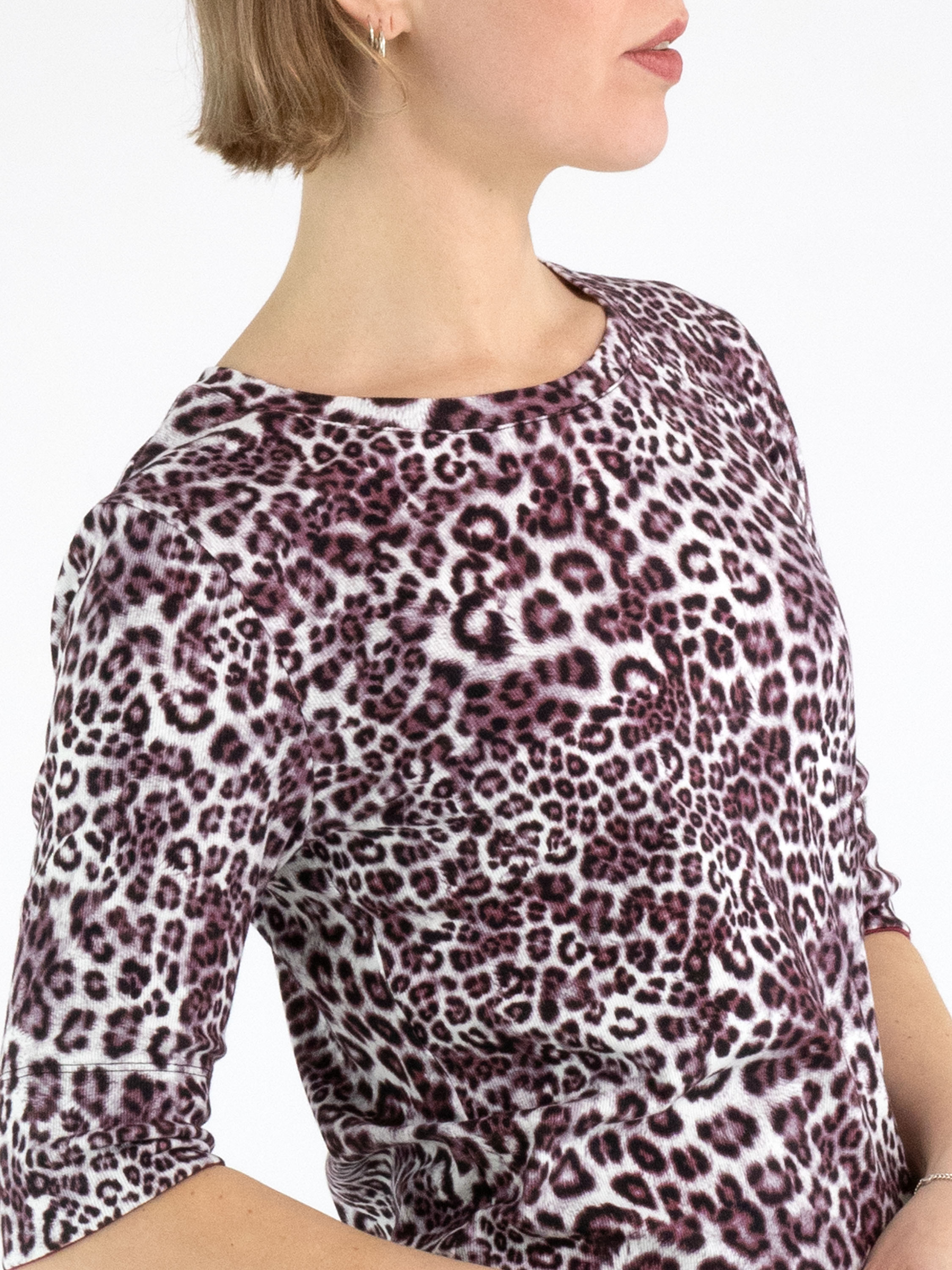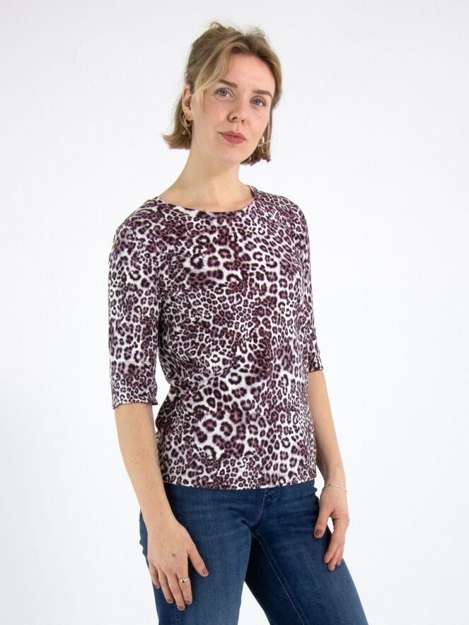A shirt from Marc Cain in a finely ribbed structure with a leopard print in various shades of grey, burgundy and off-white. The short sleeves have a turn-up in a solid burgundy colour. The shirt has a round neckline and can be washed at 30 degrees.