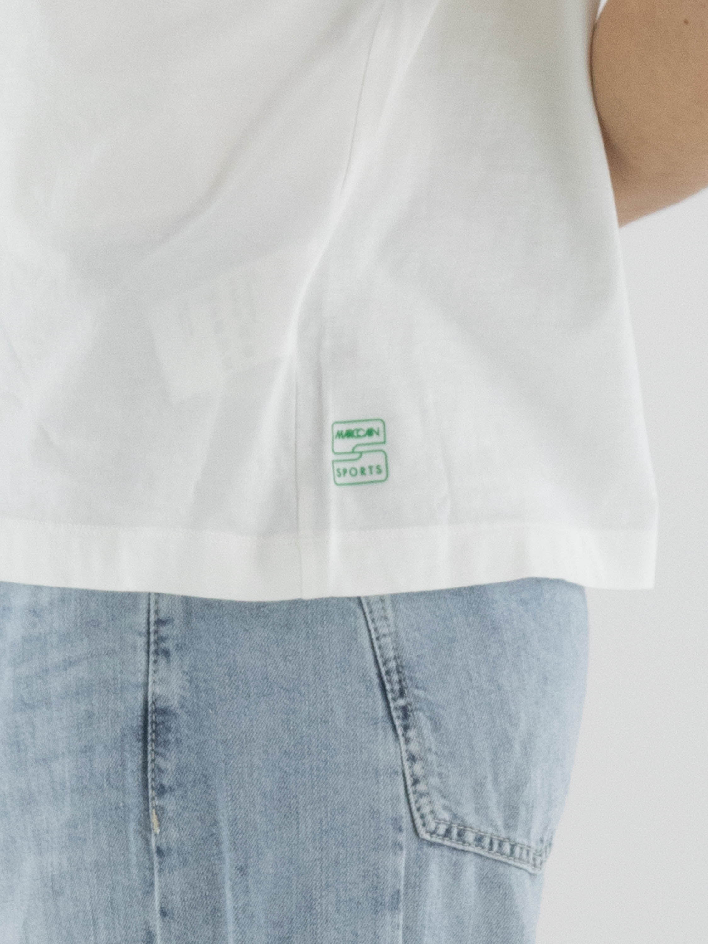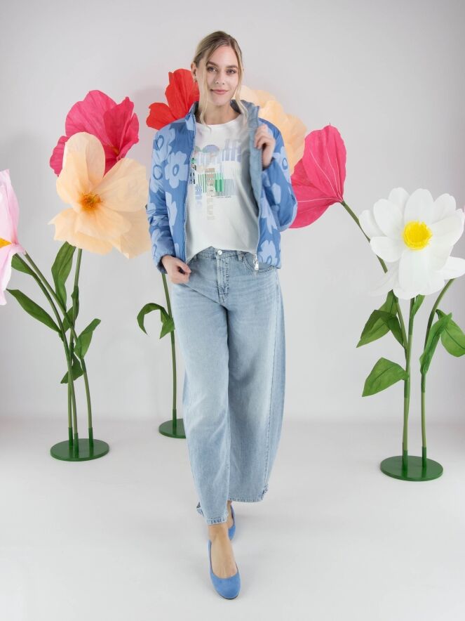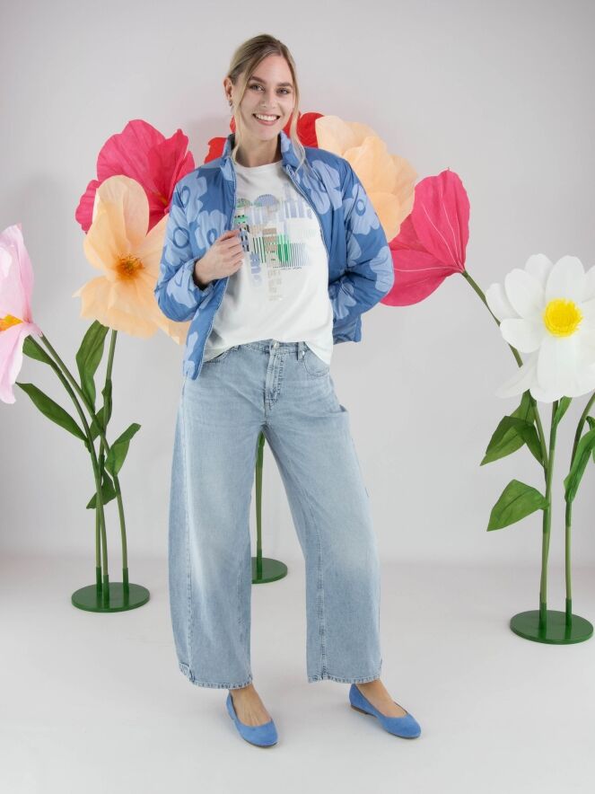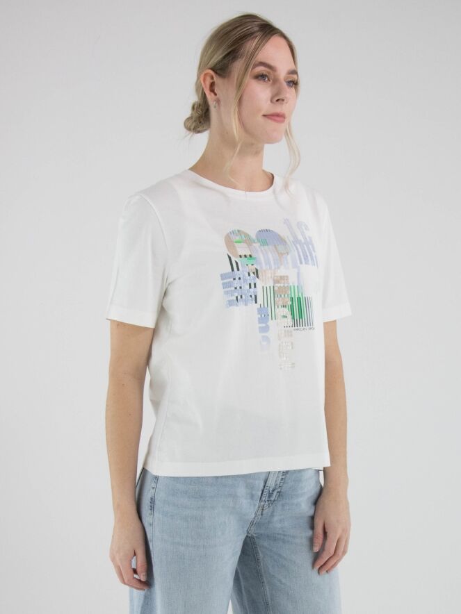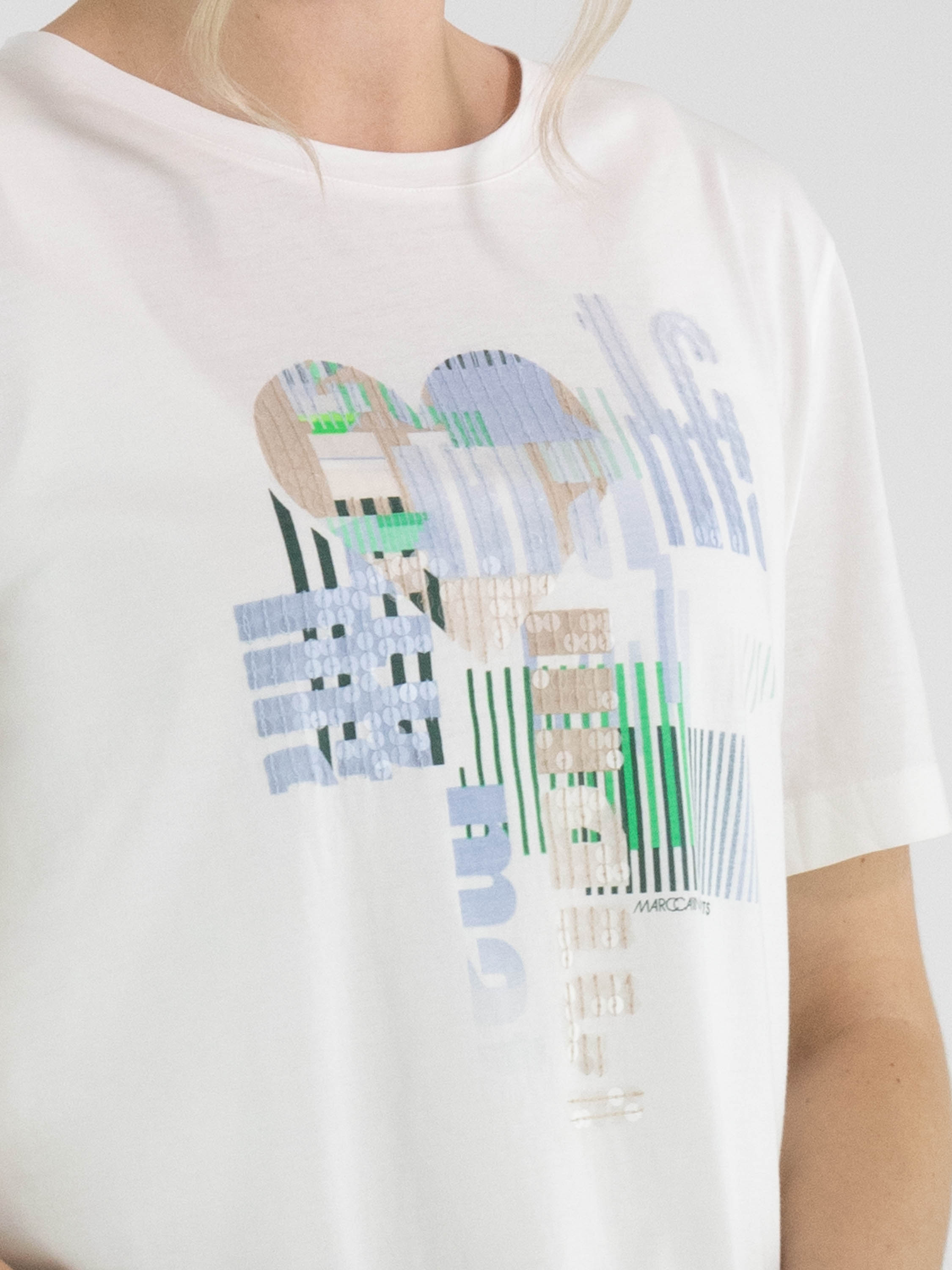 Shirt by Marc Cain featuring a graphic print with subtly integrated transparent sequins in shades of blue, green, and beige on a white background. Designed with a round neckline and short sleeves, it offers a fresh and contemporary look. This exclusive designer top can be washed at 30 degrees.