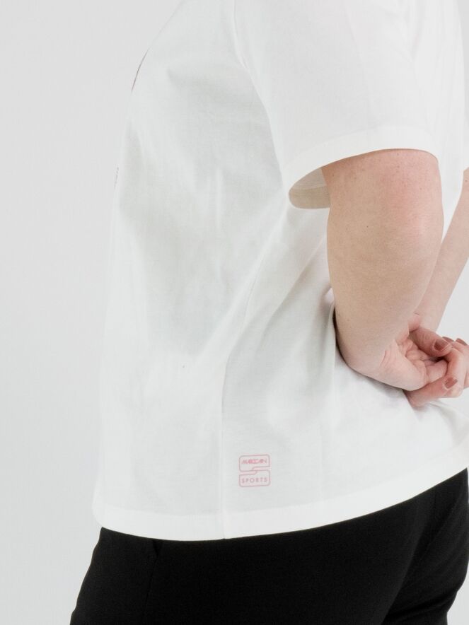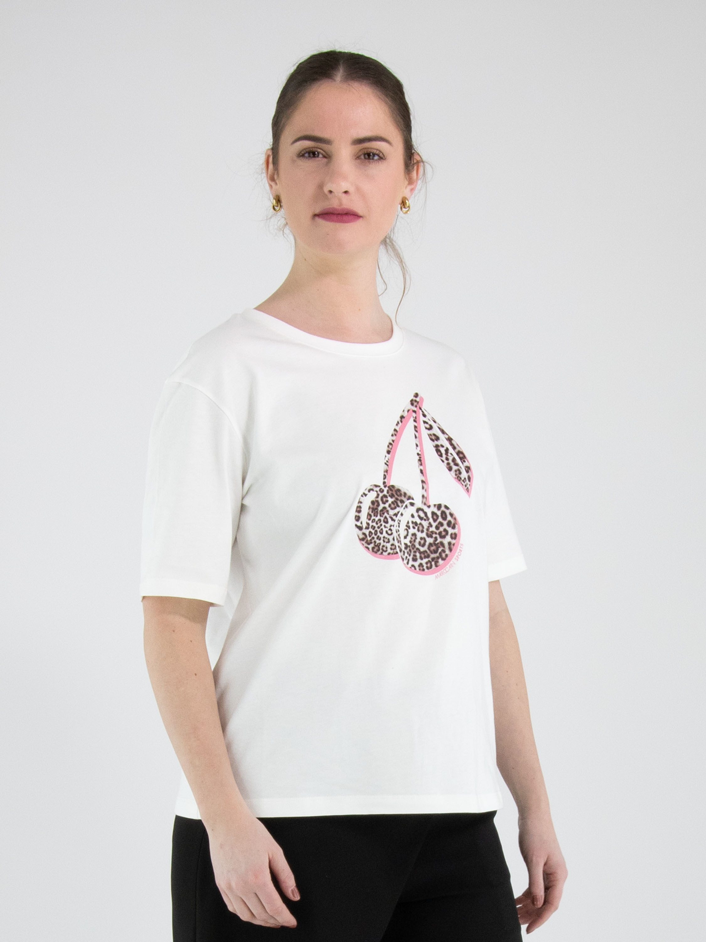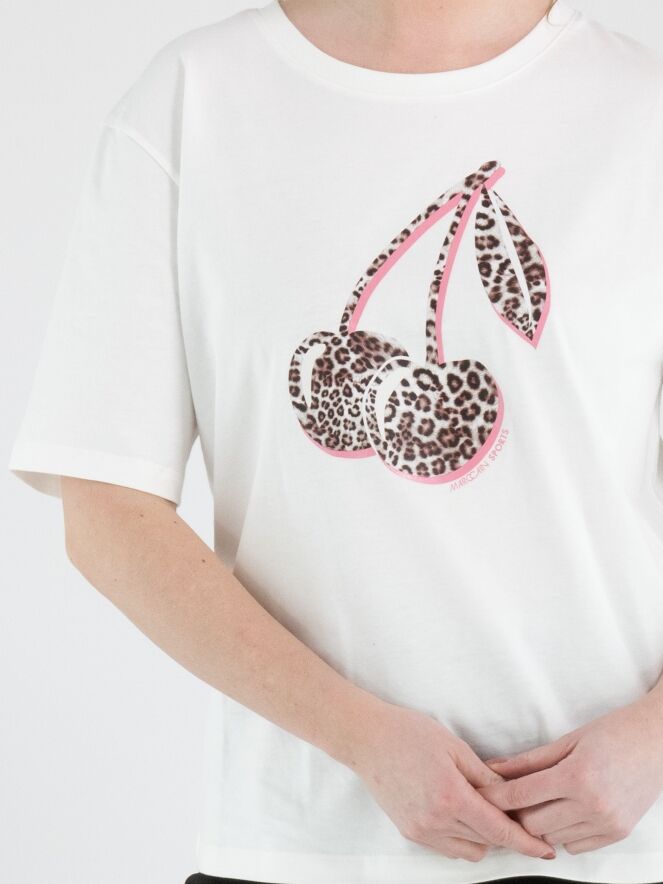 A wide, straight-cut shirt from Marc Cain in white. On the front, there is a decorative cluster of cherries in a leopard print, finished with a salmon-pink trim along the edges of the cherry stems. The shirt has a round neckline and short sleeves. This shirt can be washed at 30 degrees.