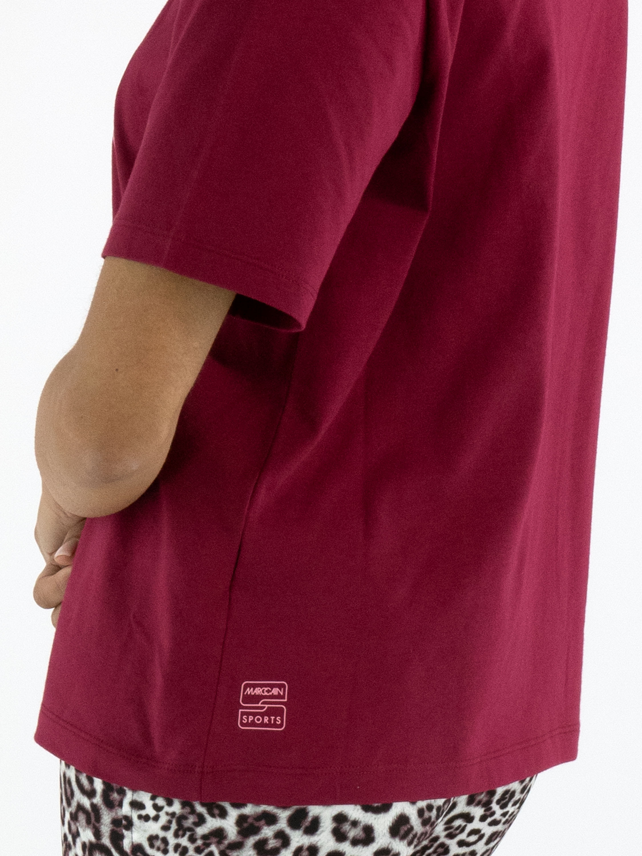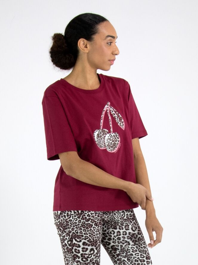 A wide, straight-cut shirt from Marc Cain in burgundy. On the front is a decorative cluster of cherries in a leopard print with a salmon-pink trim along the edges of the cherry stems. The shirt has a round neckline and short sleeves. This shirt can be washed at 30 degrees.