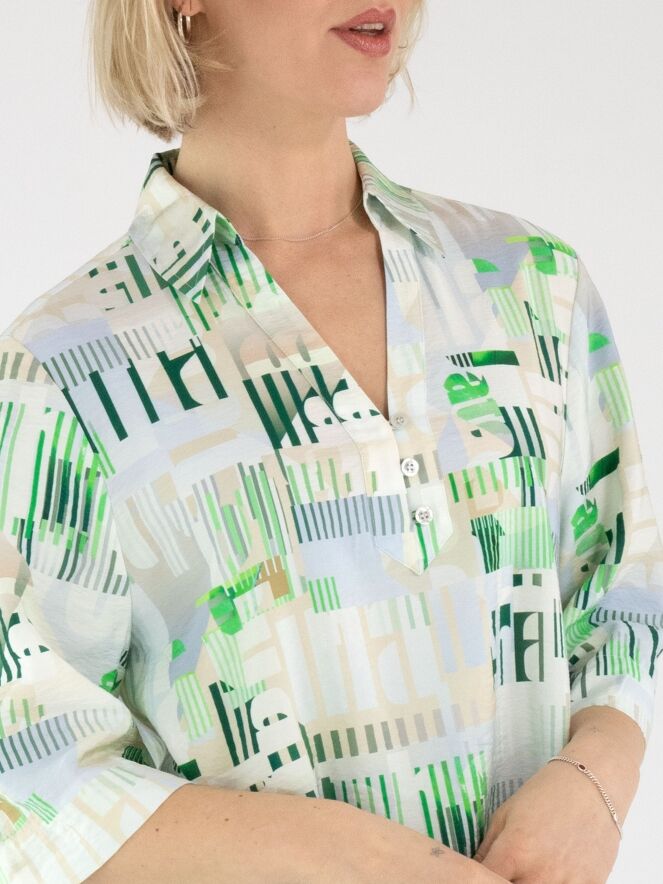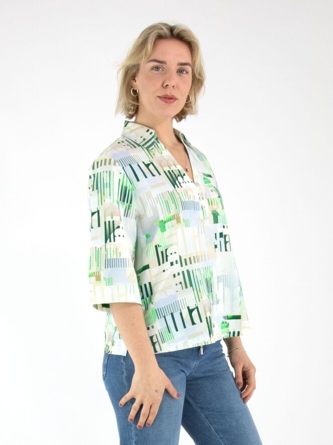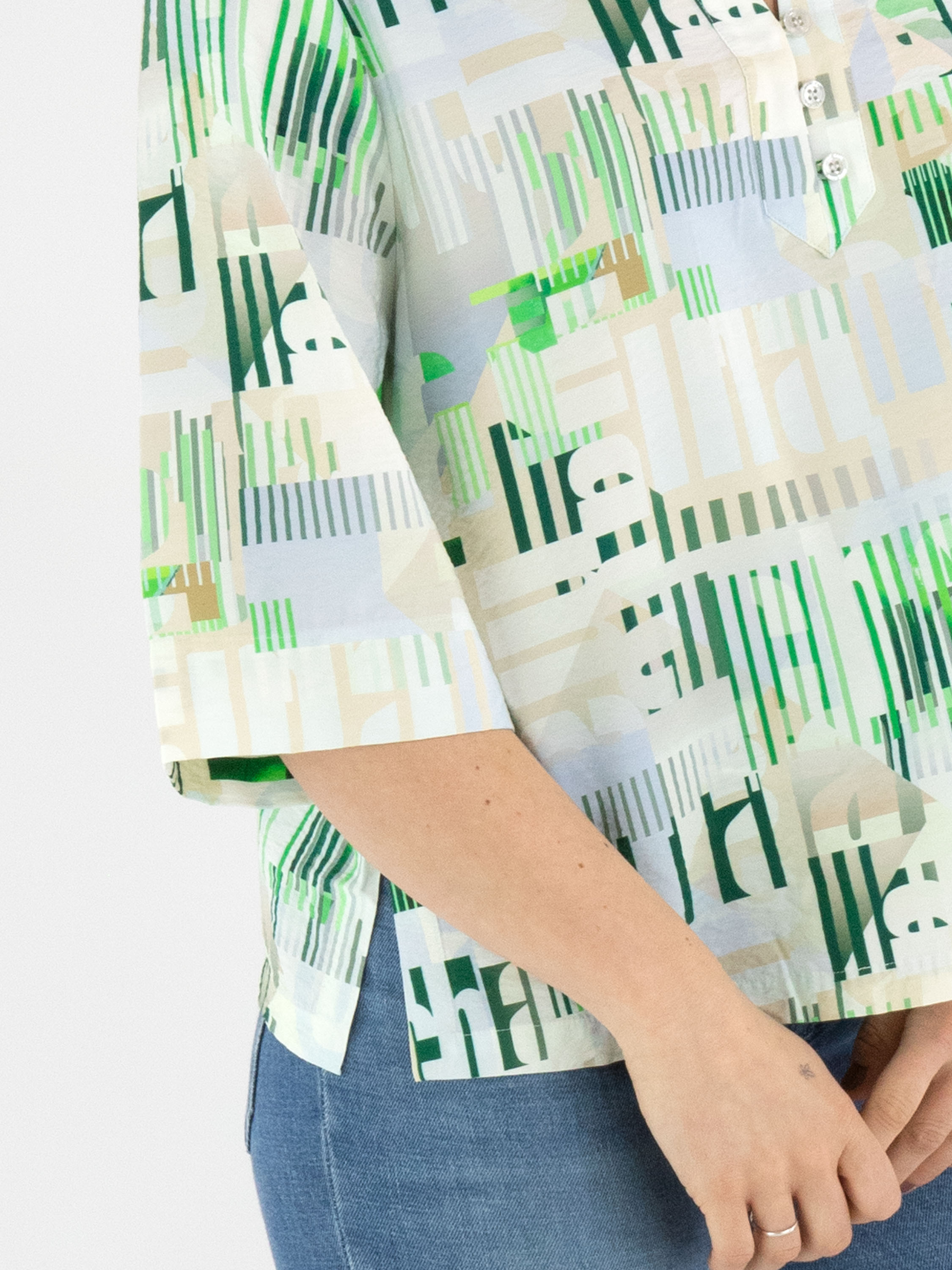 A blouse by Marc Cain featuring a graphic letter and stripe print in shades of sand, blue, dark green, bright green and cream white. The blouse has a V-neckline with a collar and short sleeves. This blouse can be washed at 30 degrees.
