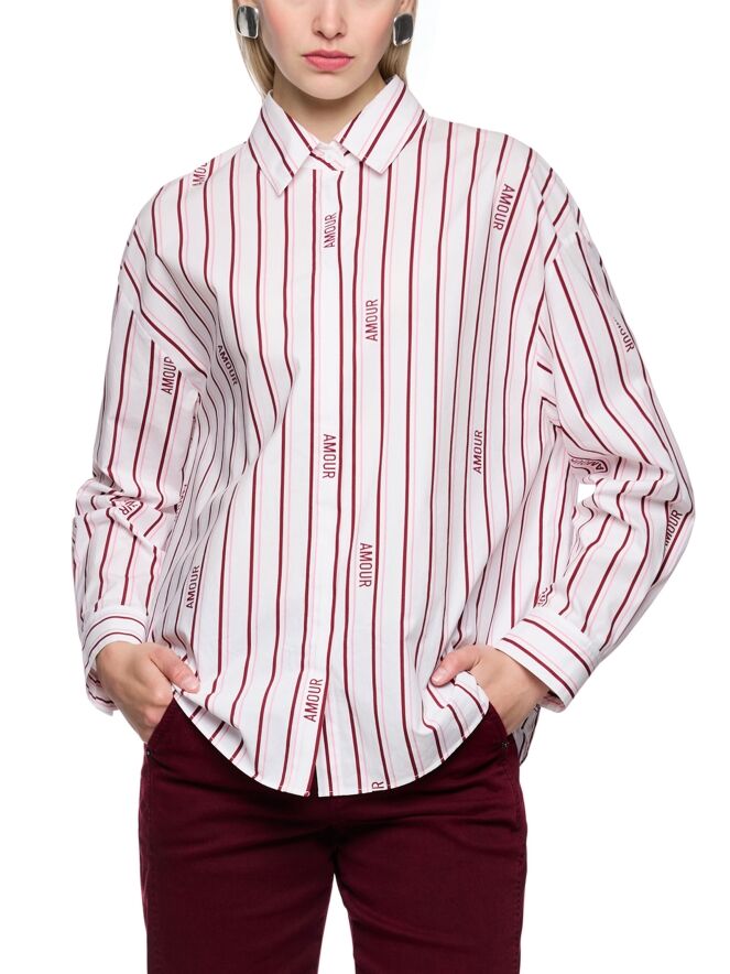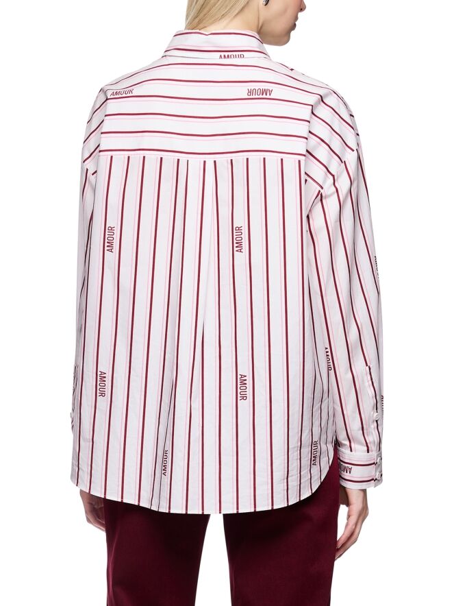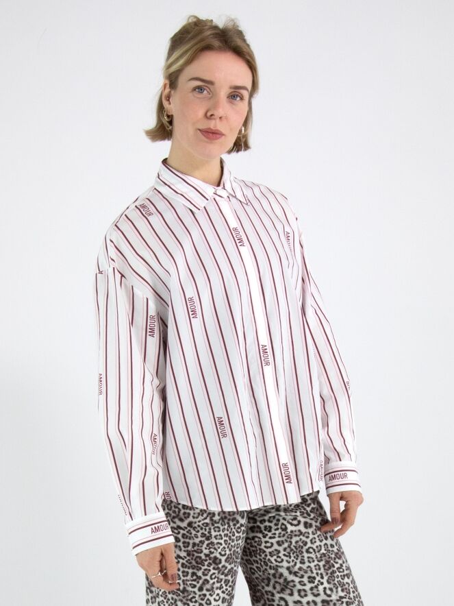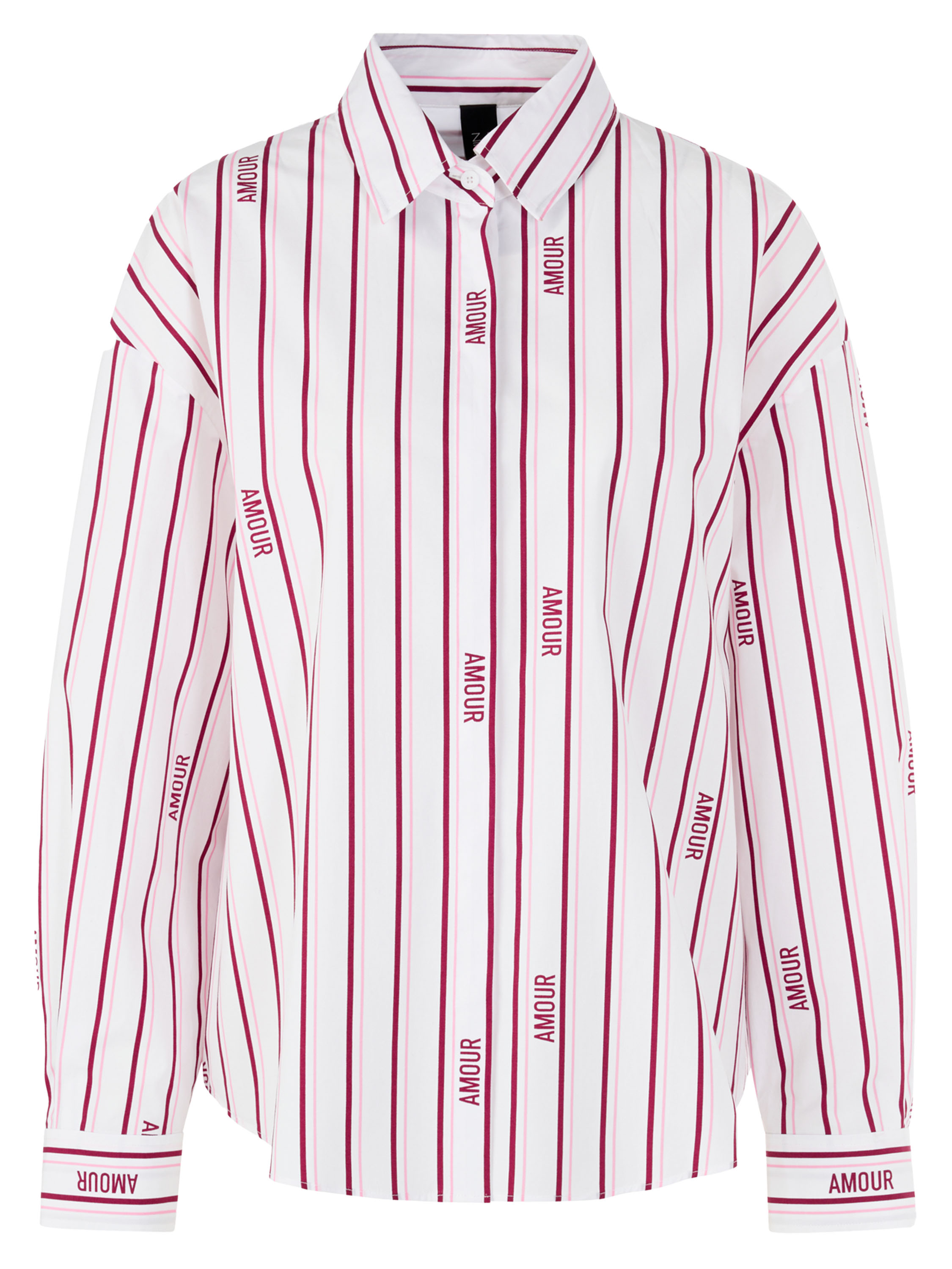 A blouse from Marc Cain with a striped pattern in burgundy and pastel pink on a white background. Between the stripes, the word amour appears in several places. The blouse has a concealed button placket and long sleeves. This blouse can be washed at 30 degrees.