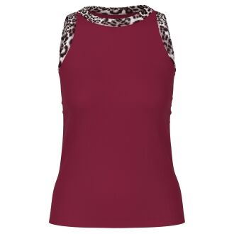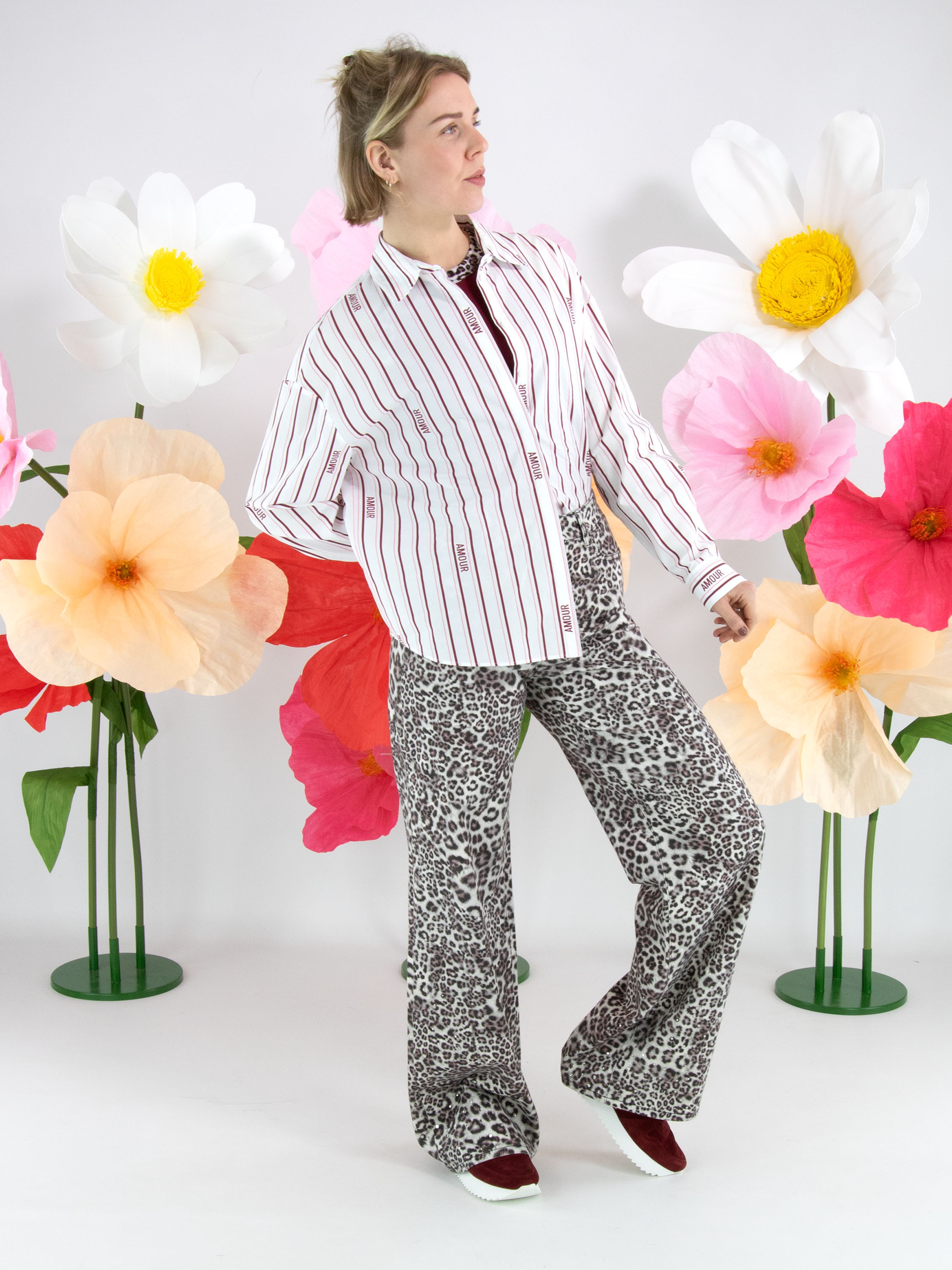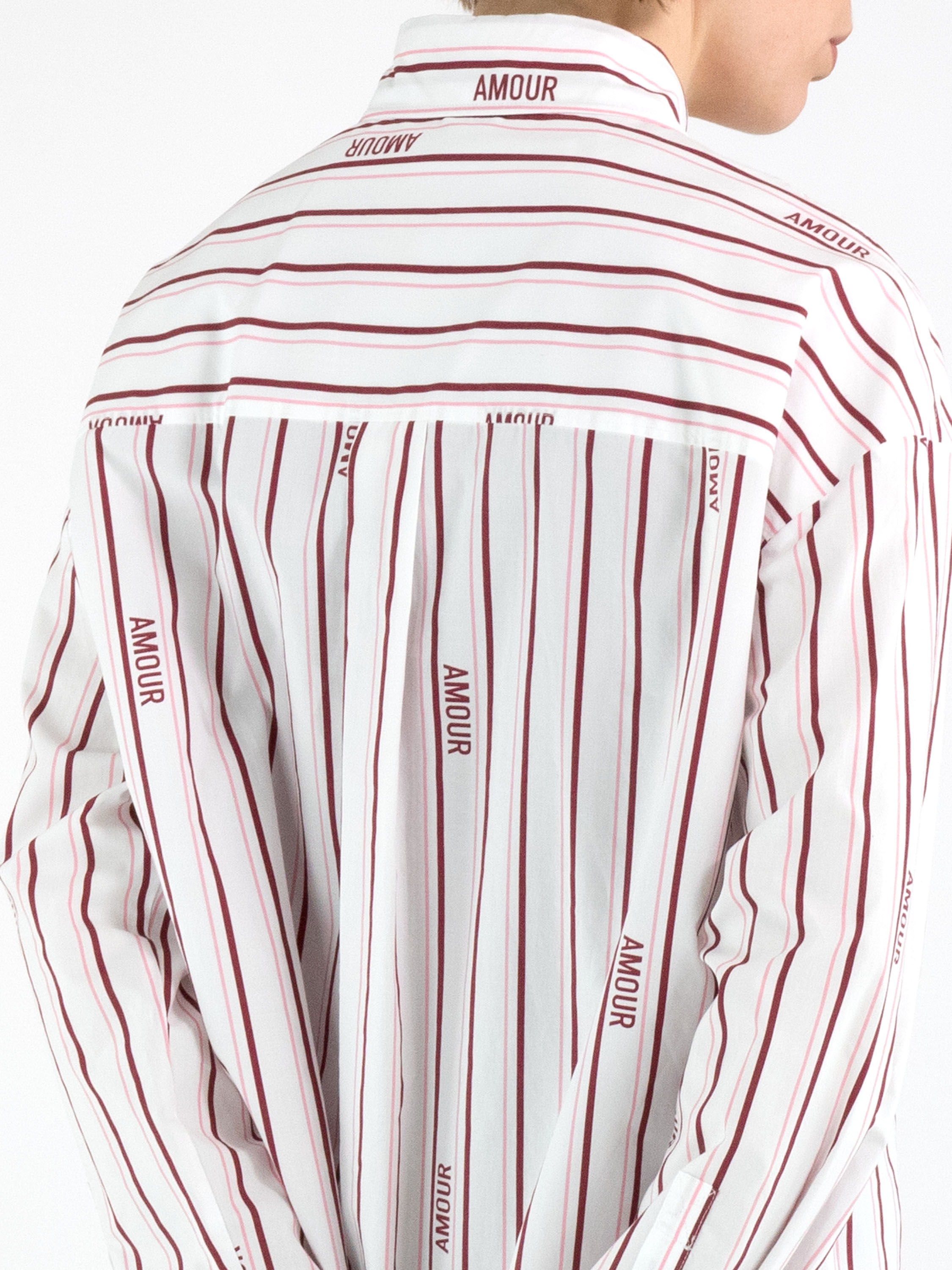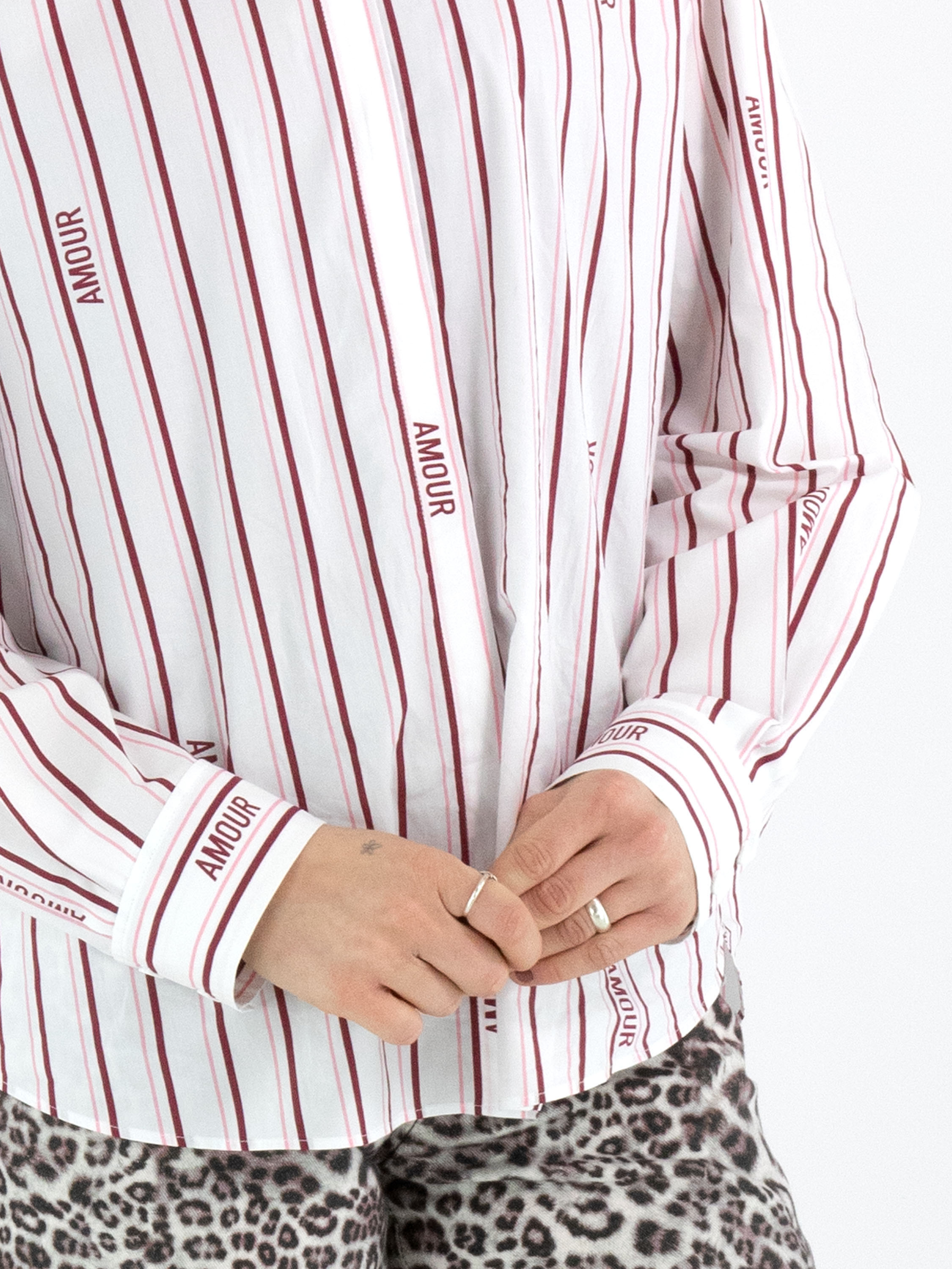A blouse from Marc Cain with a striped pattern in burgundy and pastel pink on a white background. Between the stripes, the word amour appears in several places. The blouse has a concealed button placket and long sleeves. This blouse can be washed at 30 degrees.