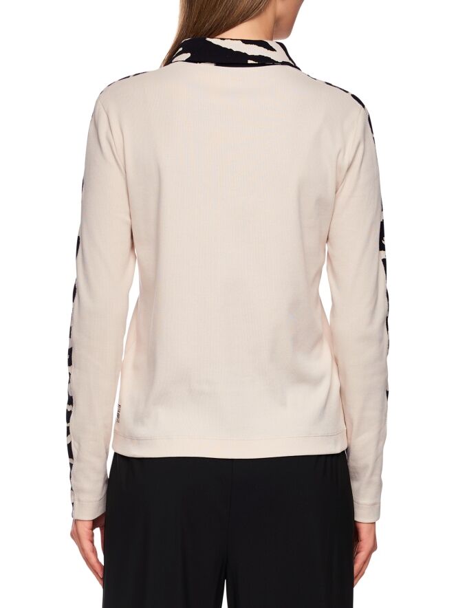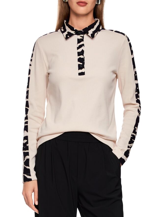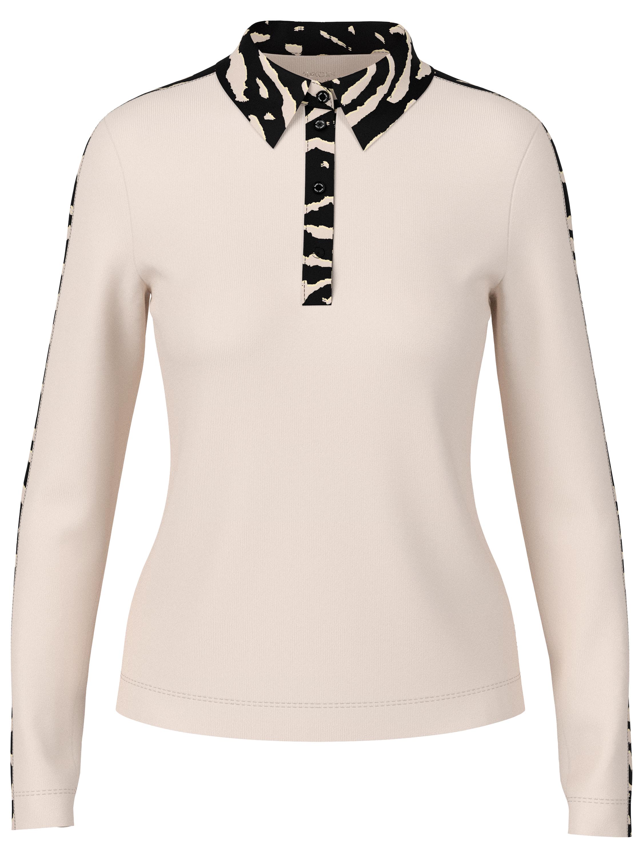 A finely ribbed polo shirt from Marc Cain in beige. The collar, the top of the long sleeves, and the trim along the buttons feature a zebra print. This shirt can be washed at 30 degrees.