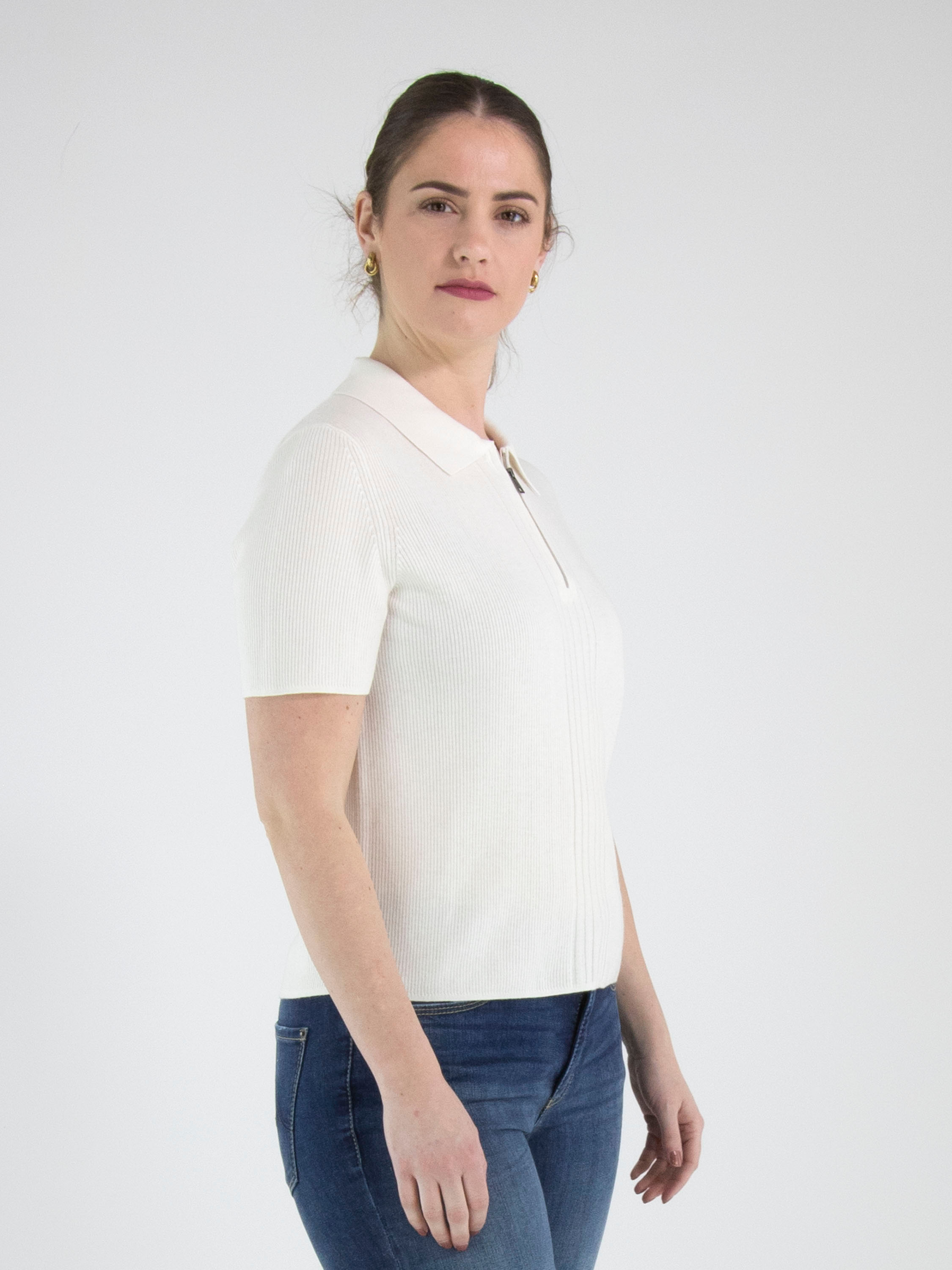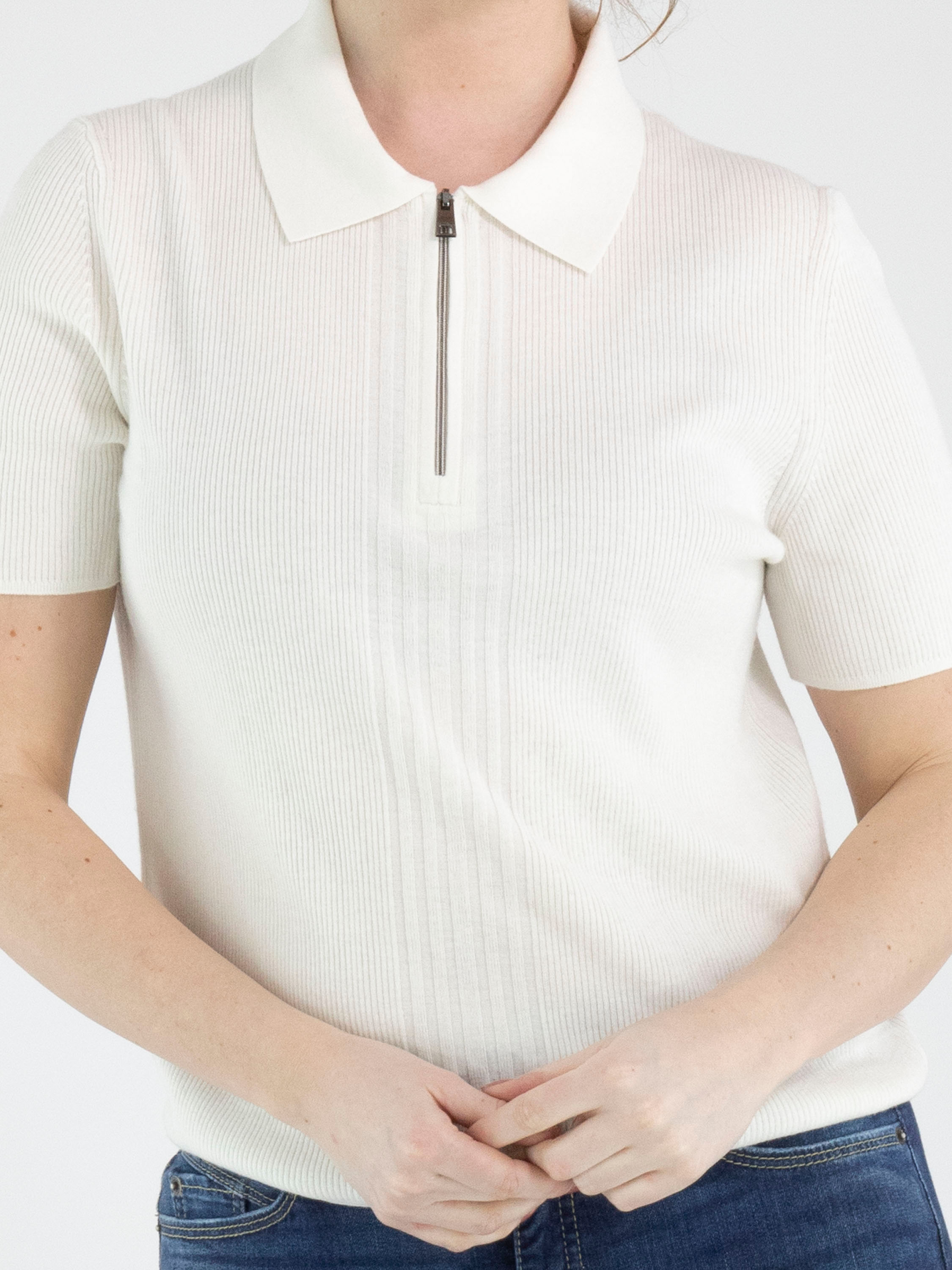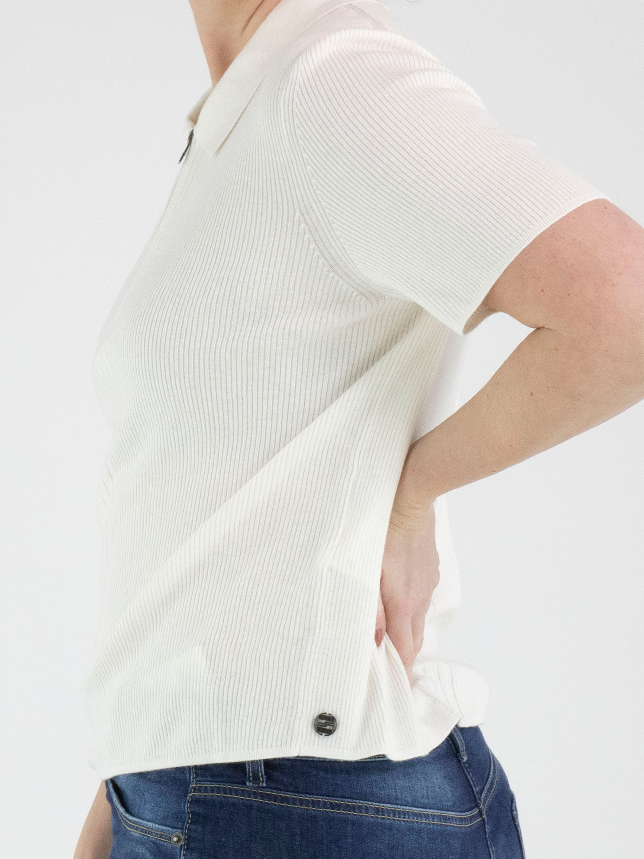 A polo shirt from Marc Cain in off-white. The fabric is finely ribbed, with a wide panel at the front where the ribbing is broader. The collar is made from a solid fabric, and the zipper from the neckline extends to above the bust. This polo shirt can be hand-washed.