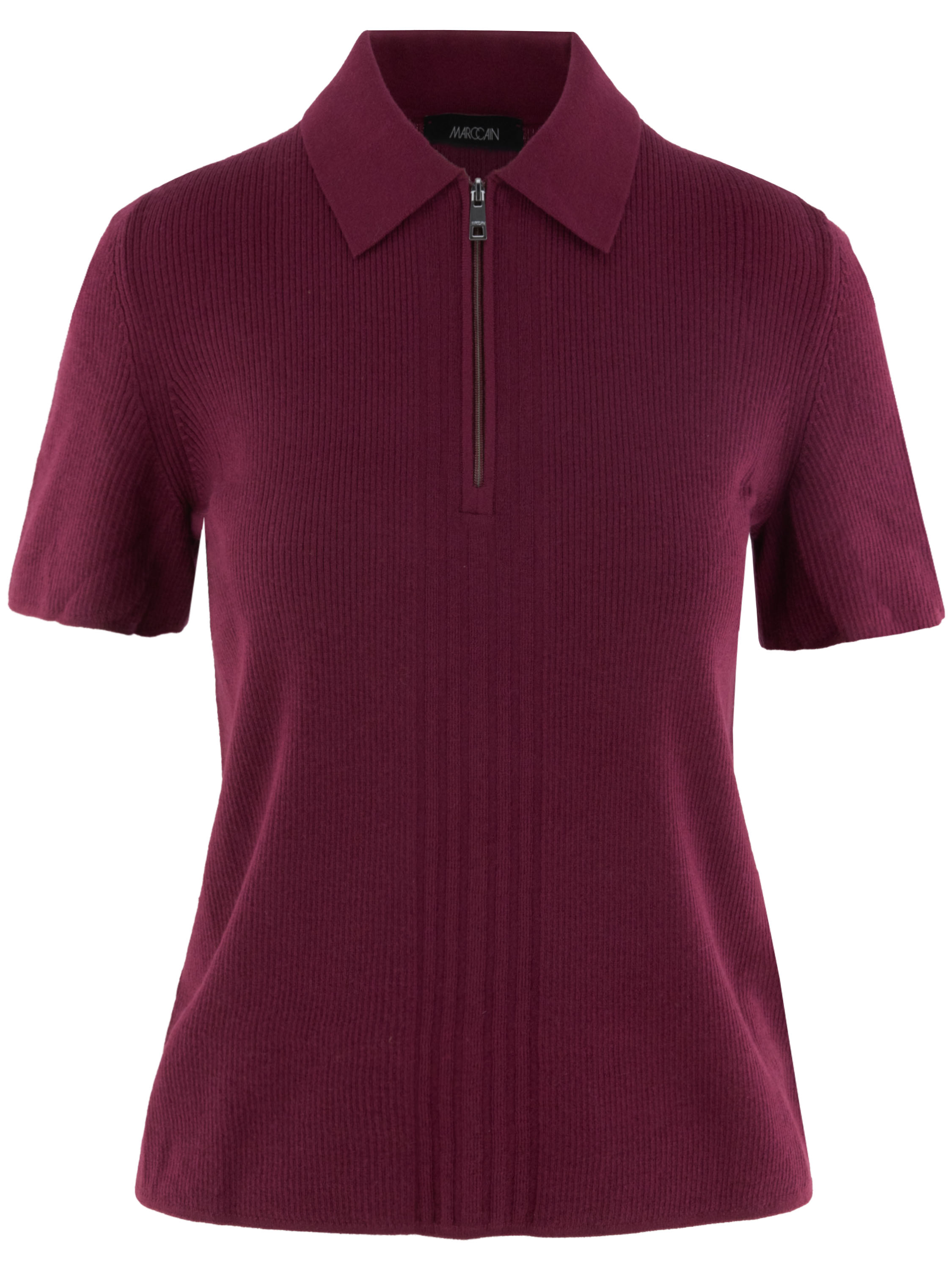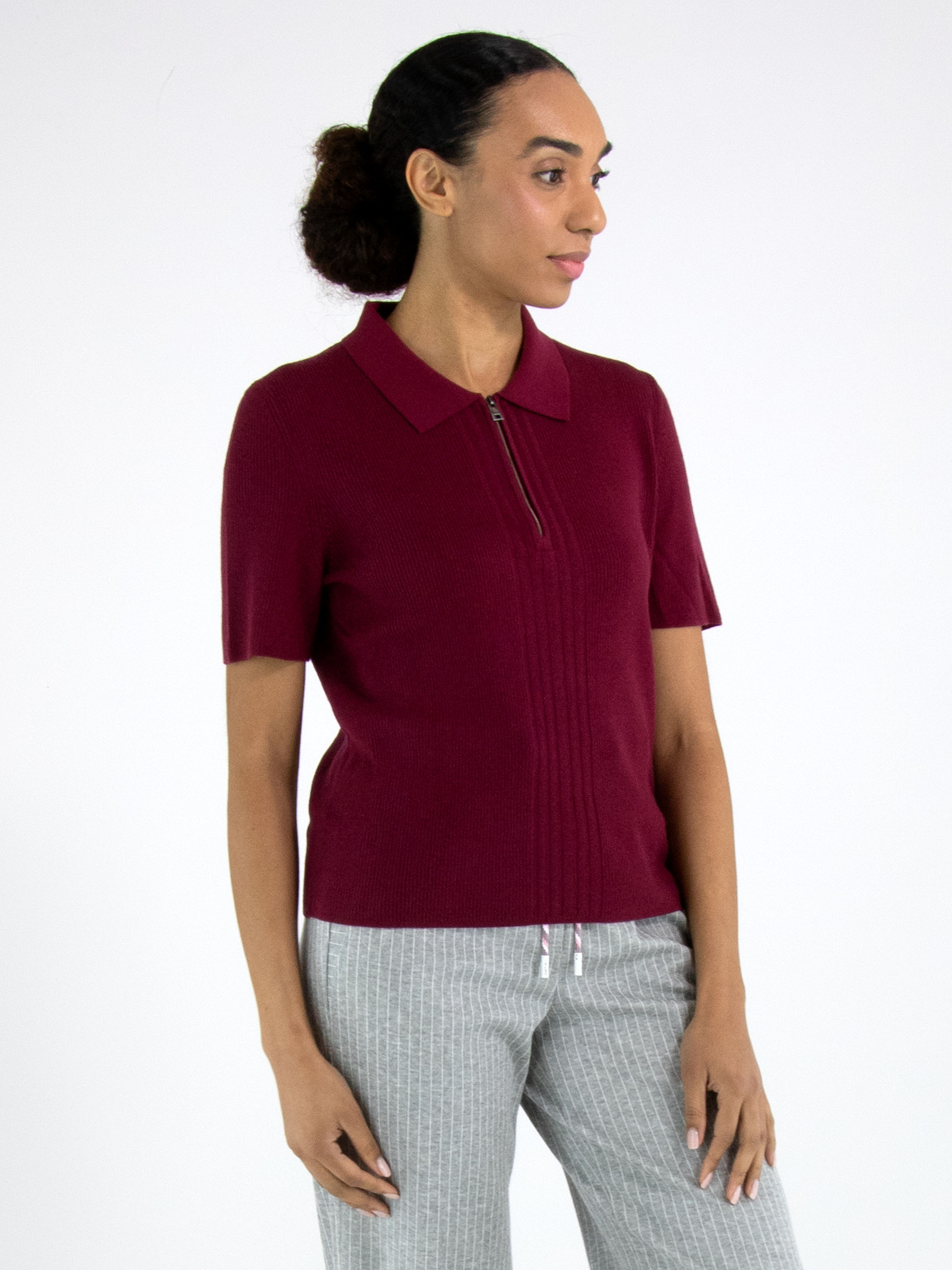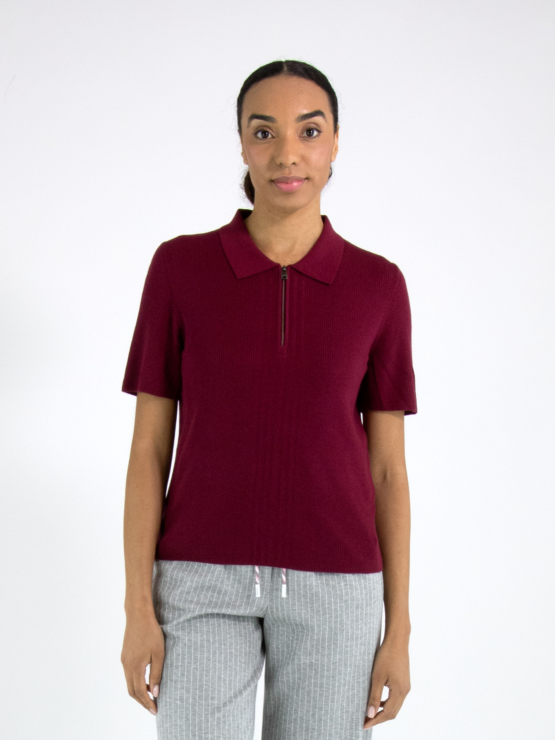 A polo shirt from Marc Cain in burgundy. The fabric is finely ribbed, with a wide panel at the front where the ribbing is broader. The collar is in a solid fabric, and the zipper from the neckline runs to above the bust. This polo shirt can be hand-washed.