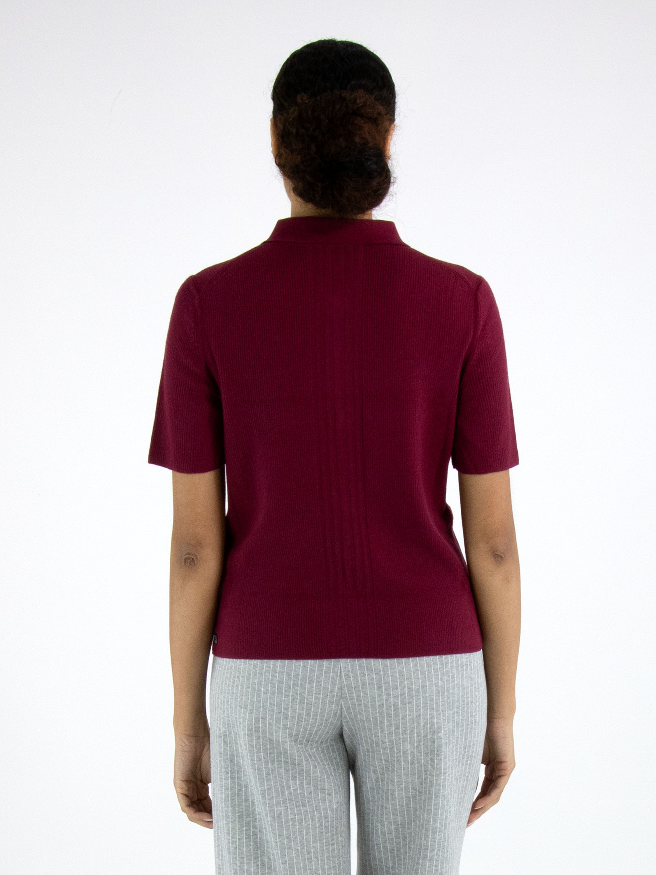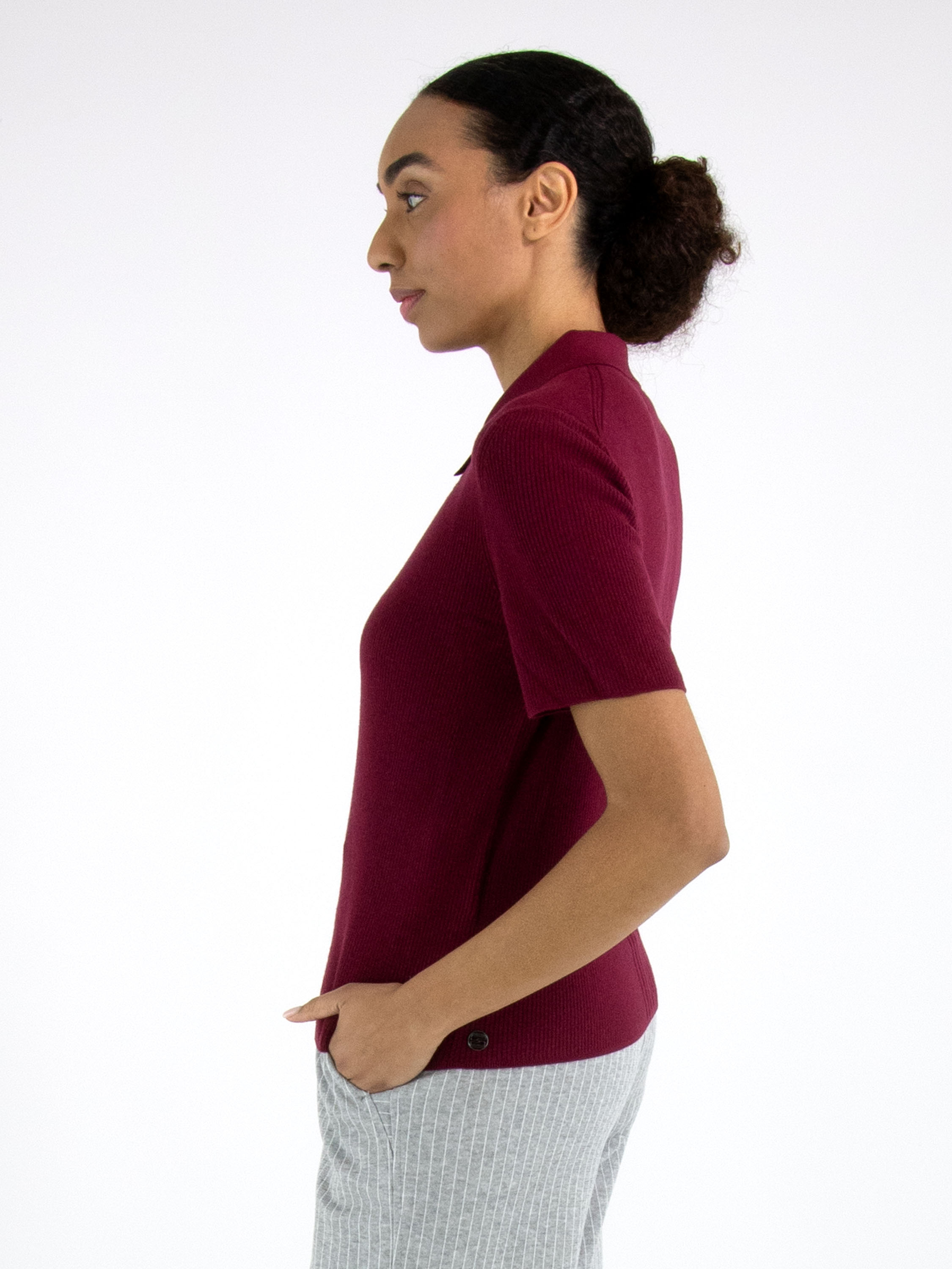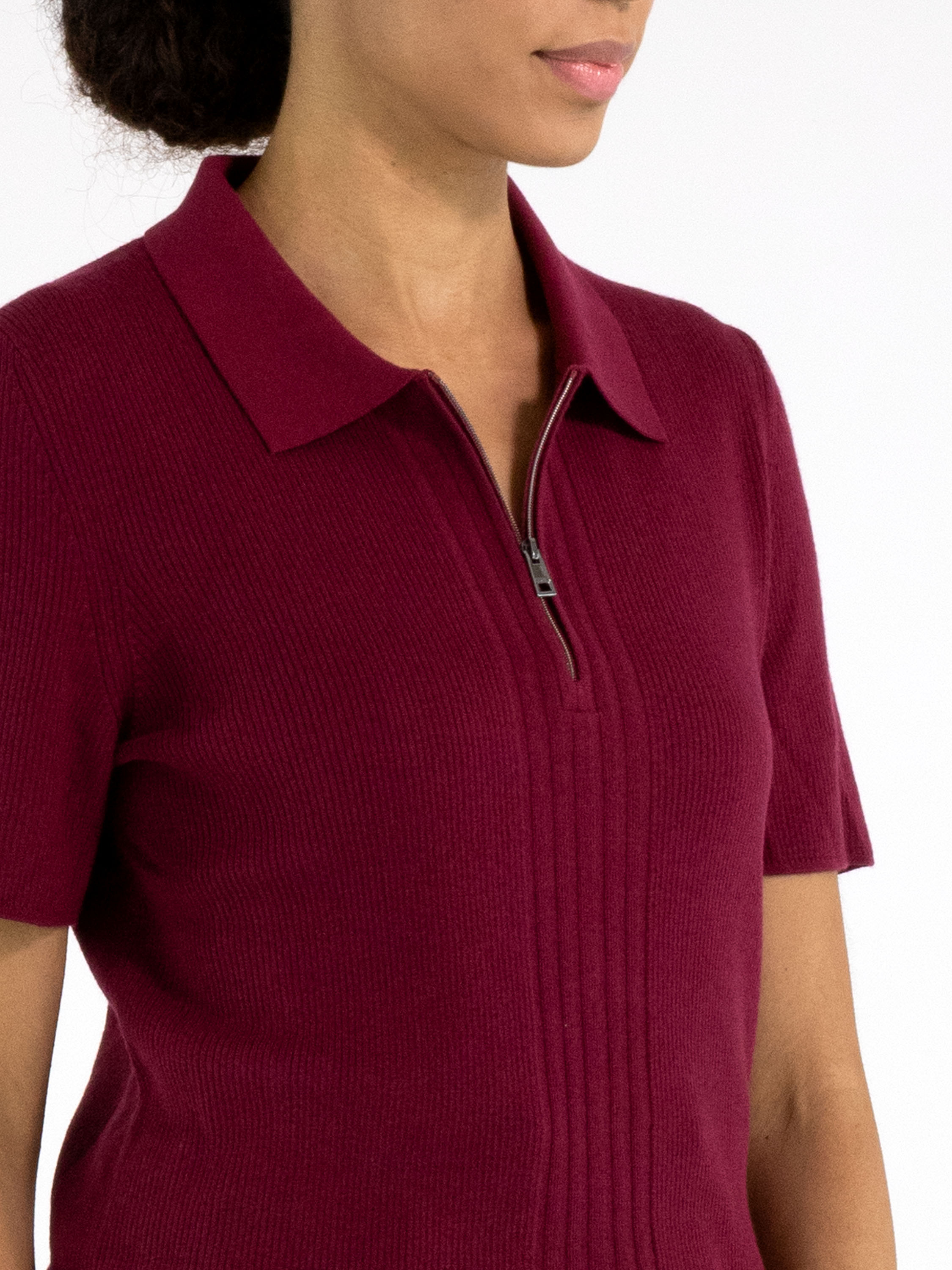 A polo shirt from Marc Cain in burgundy. The fabric is finely ribbed, with a wide panel at the front where the ribbing is broader. The collar is in a solid fabric, and the zipper from the neckline runs to above the bust. This polo shirt can be hand-washed.