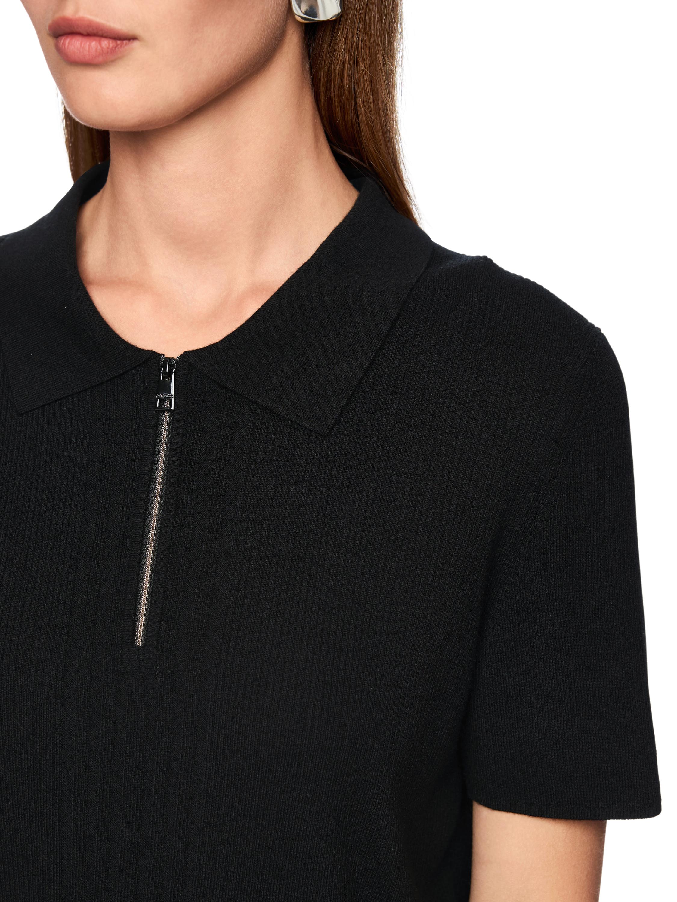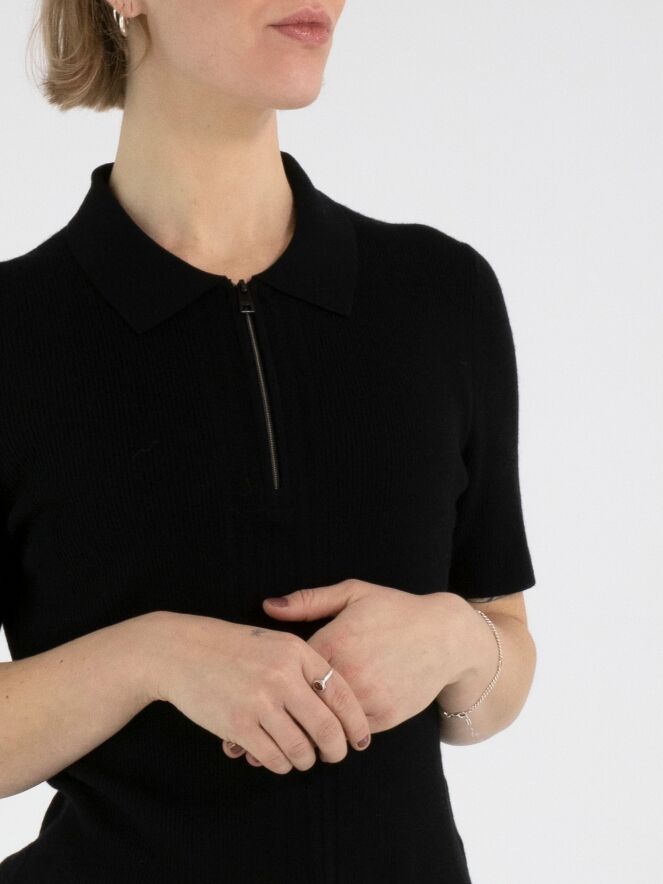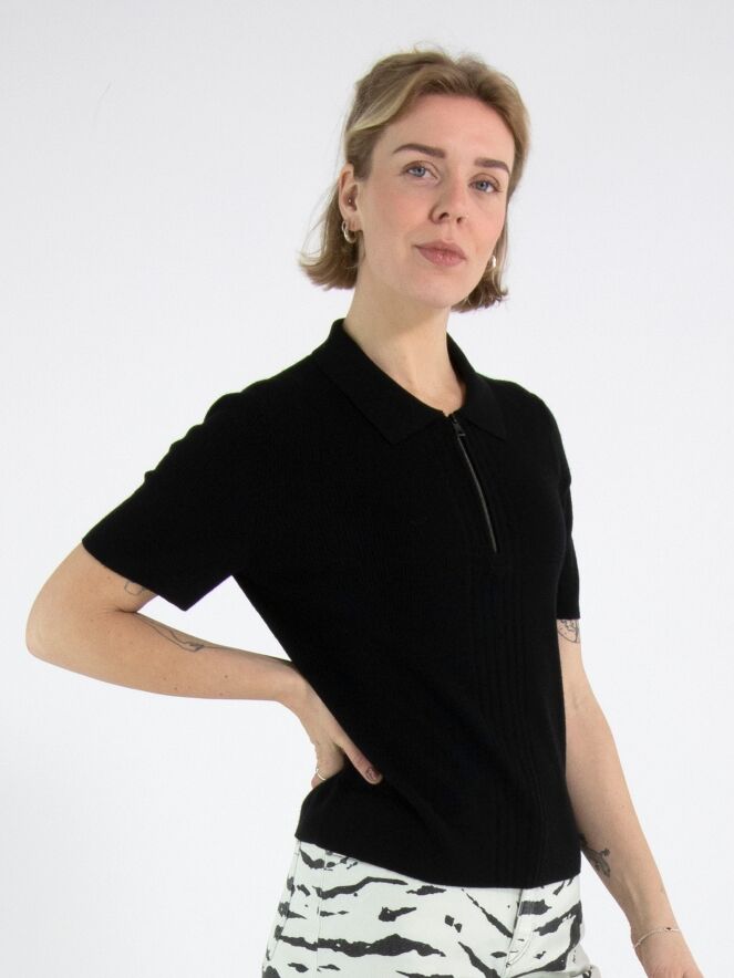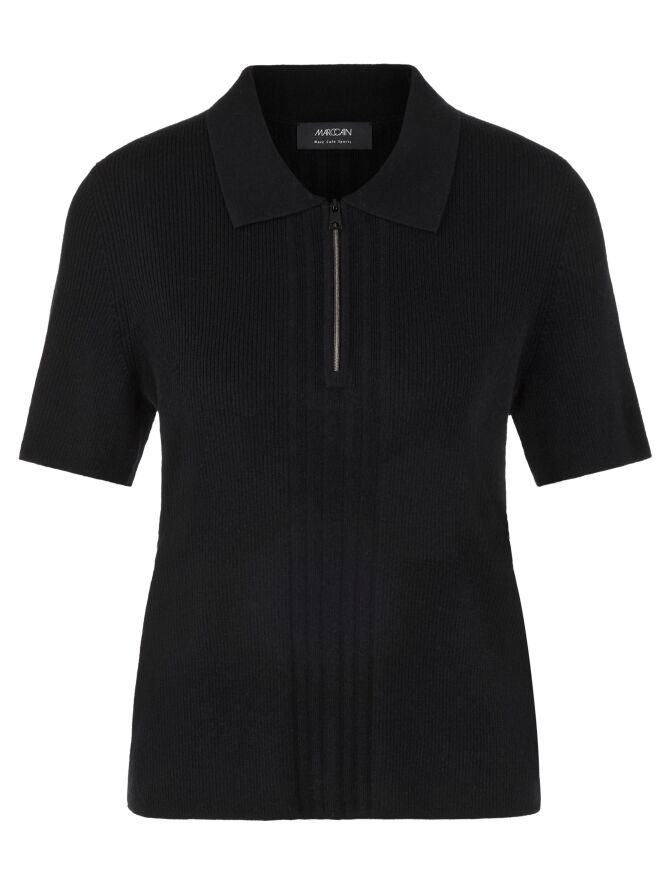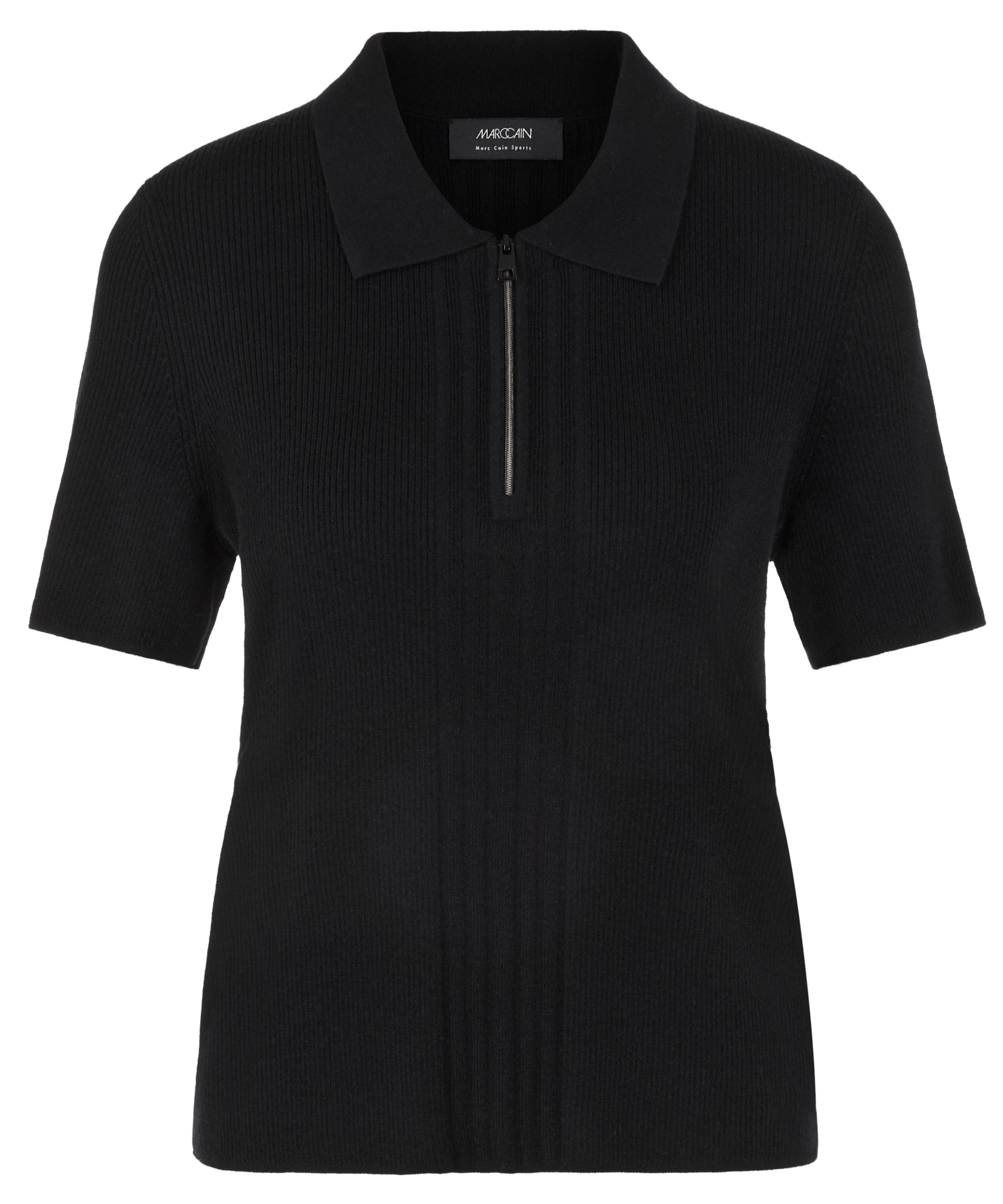 A polo shirt from Marc Cain in black. The fabric is finely ribbed, with a wide panel at the front where the ribbing is broader. The collar is in a solid fabric, and the zipper from the neckline extends to above the bust. This polo shirt can be hand-washed.