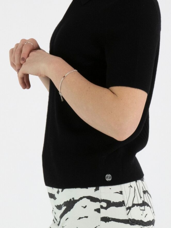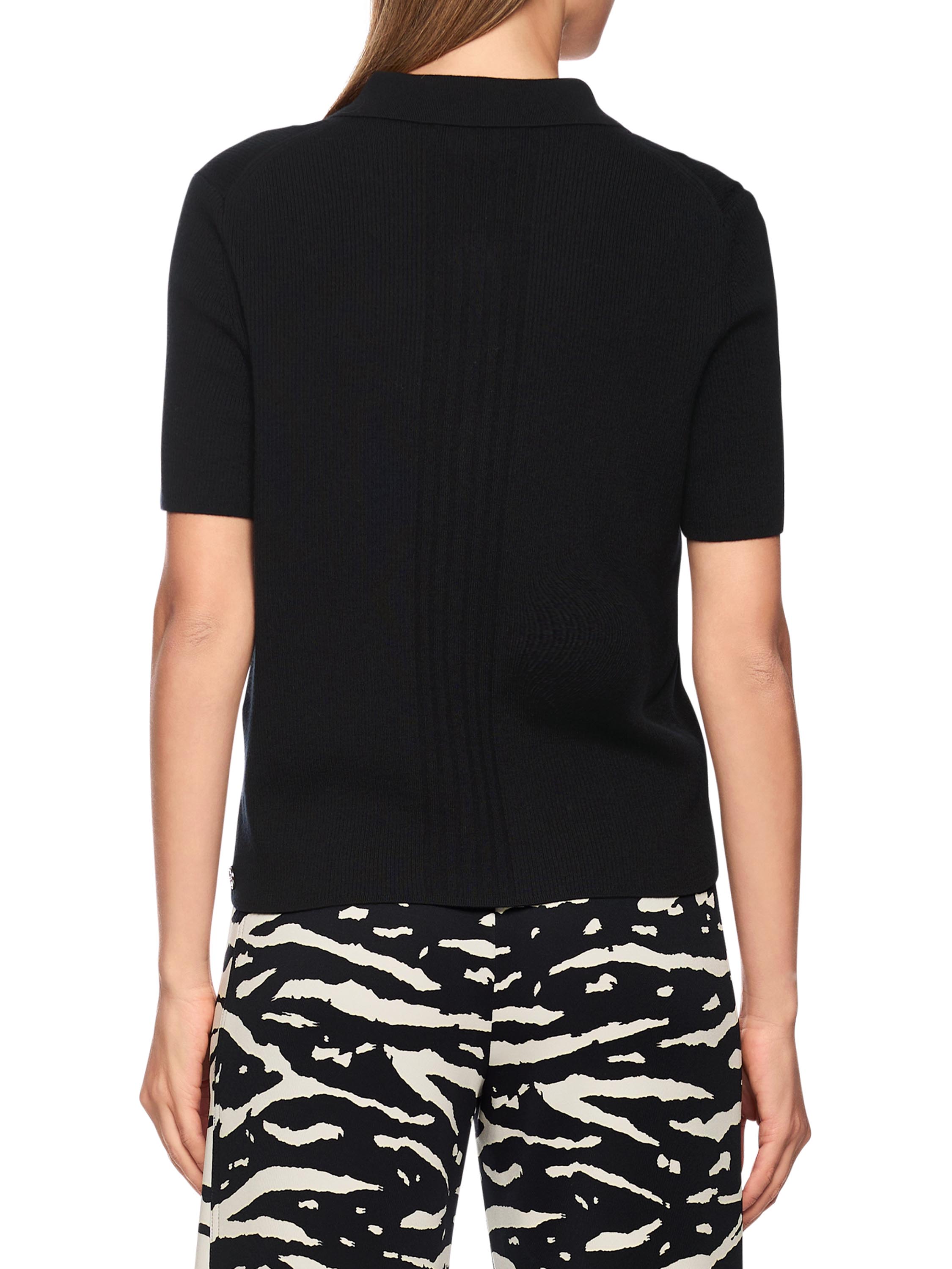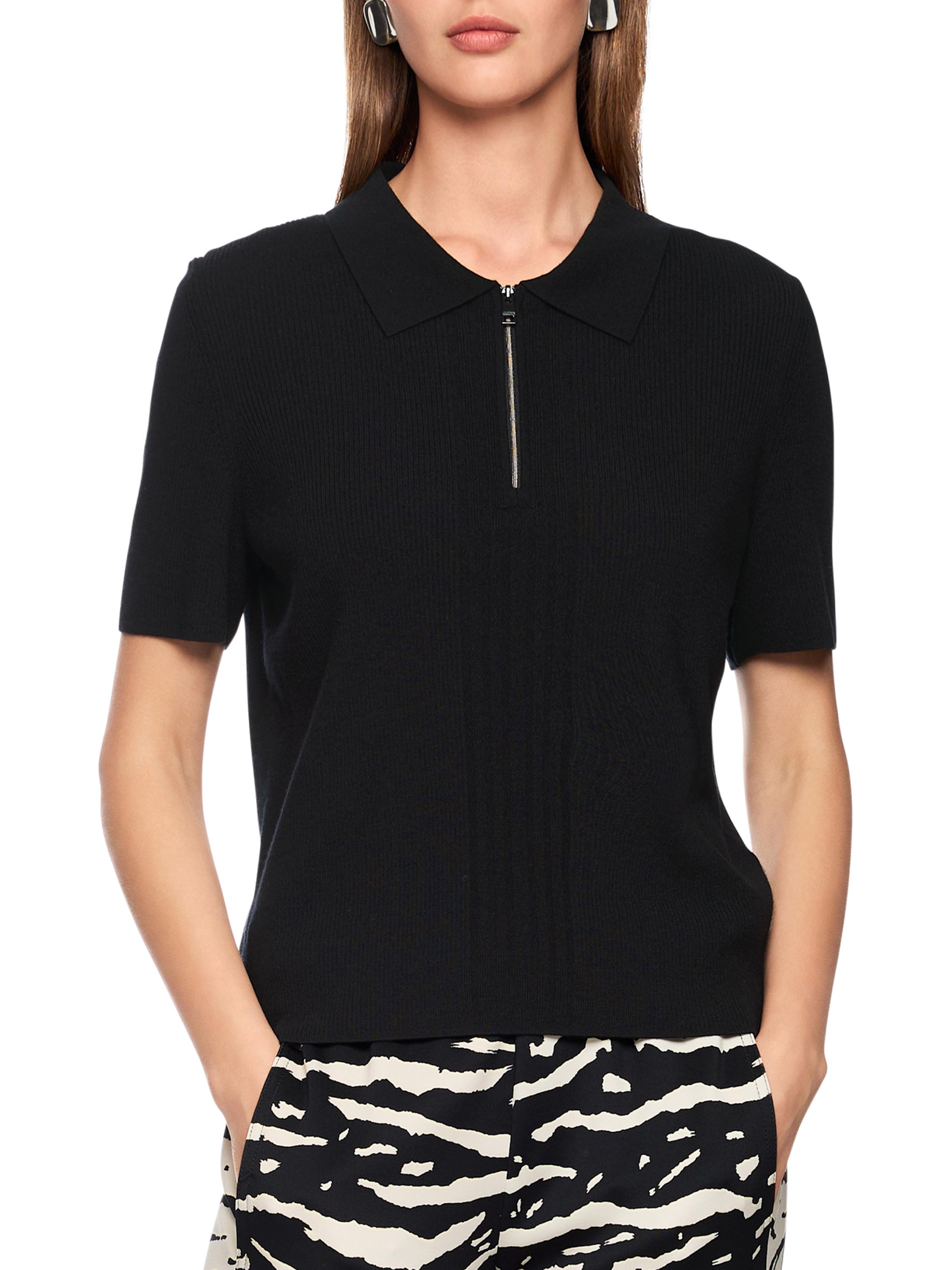 A polo shirt from Marc Cain in black. The fabric is finely ribbed, with a wide panel at the front where the ribbing is broader. The collar is in a solid fabric, and the zipper from the neckline extends to above the bust. This polo shirt can be hand-washed.