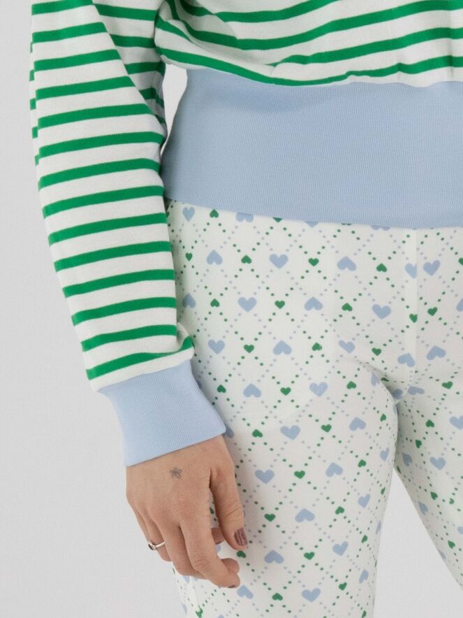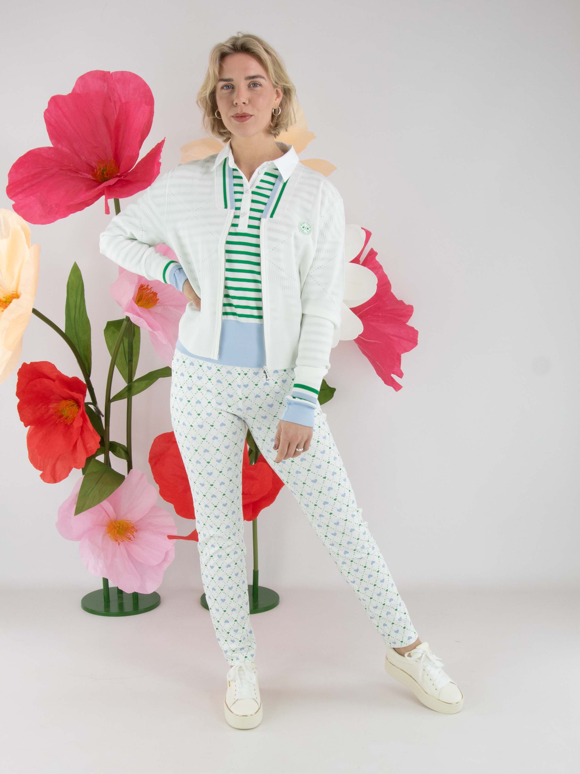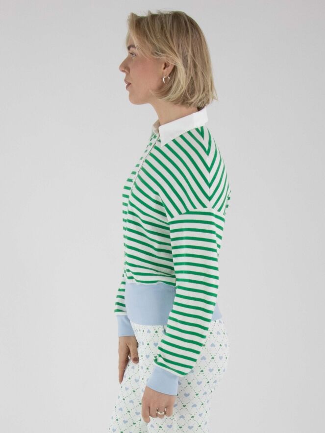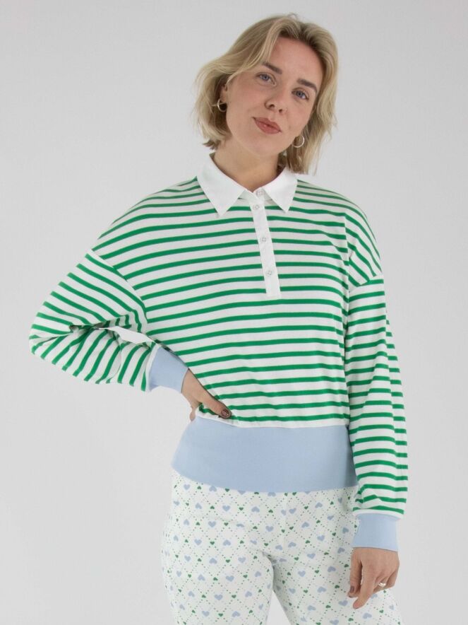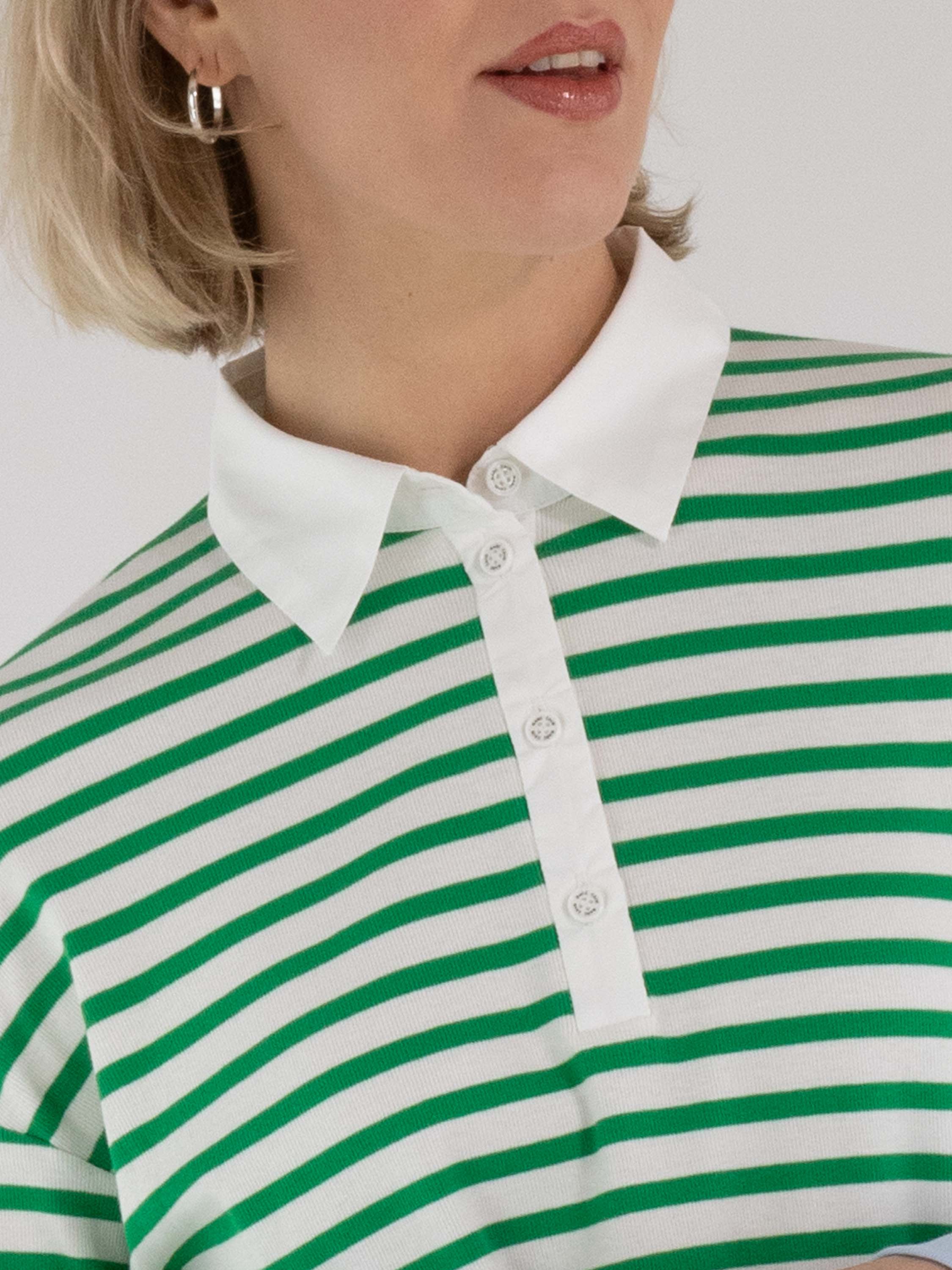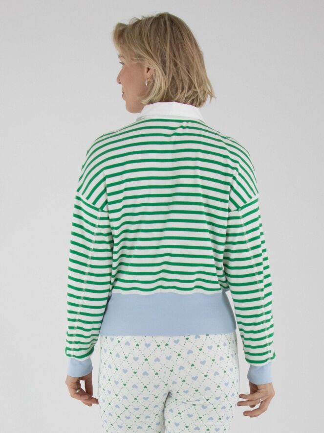 A polo shirt by Marc Cain featuring a striped pattern in green and cream white. The hem and the ends of the long sleeves are finished with a wide, finely ribbed knit trim in blue. The collar is executed in a solid cream-white colour. This polo shirt can be washed at 30 degrees.