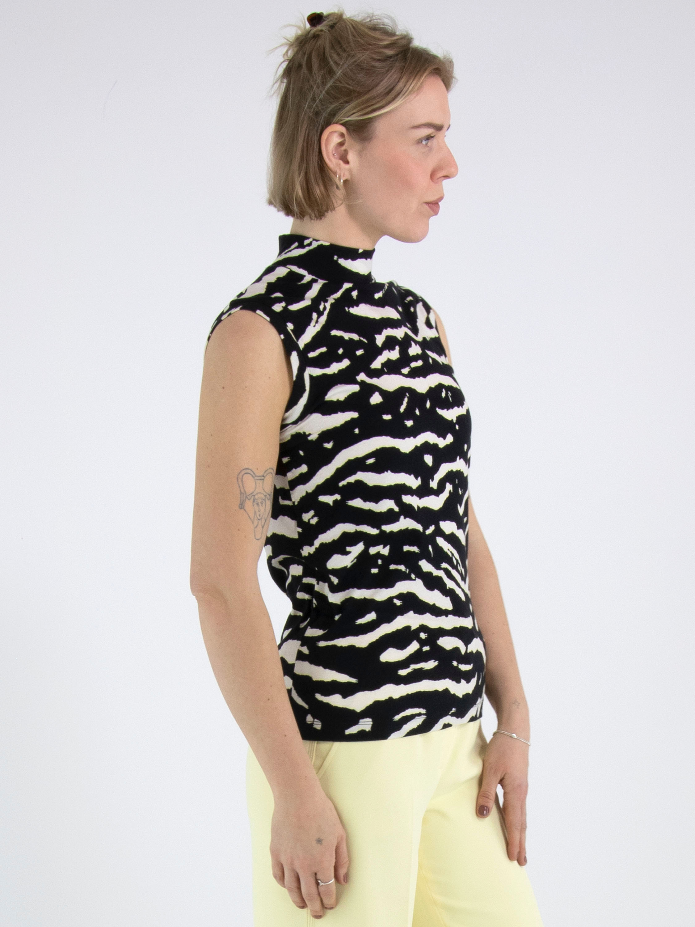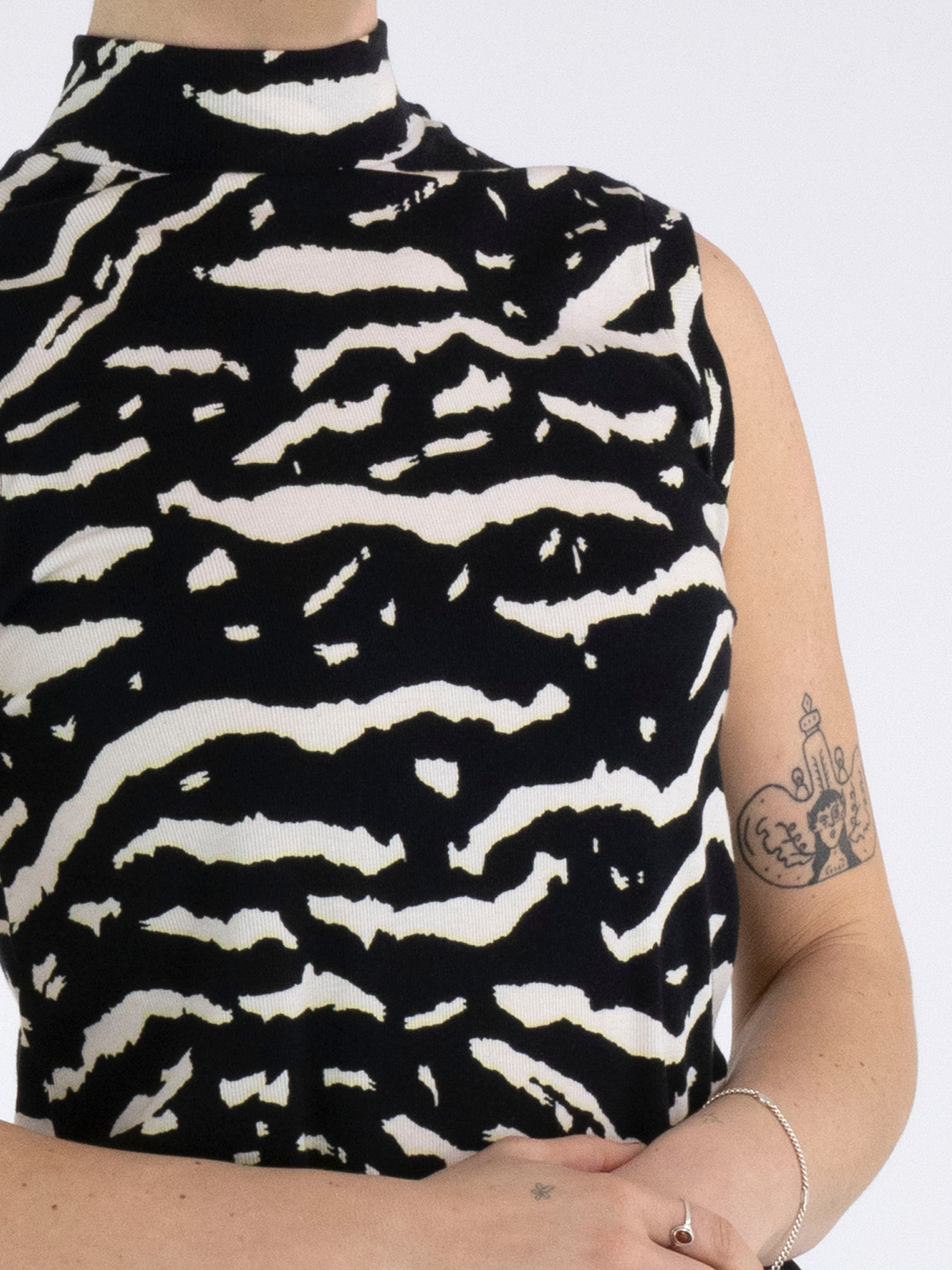 A sleeveless top from Marc Cain in a finely ribbed fabric with a zebra print in black and beige. The top has a turtle neckline and can be washed at 30 degrees.