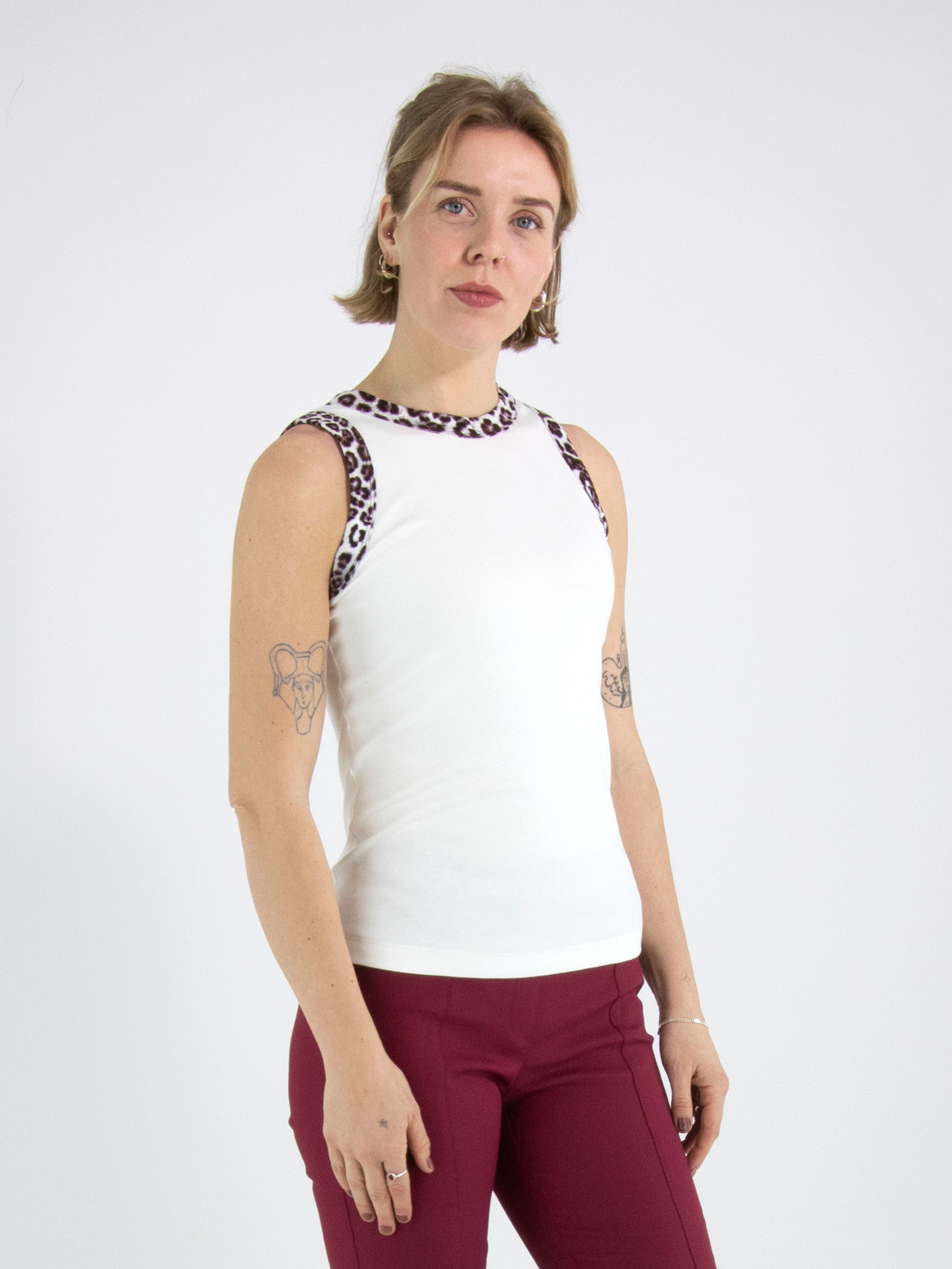 A top from Marc Cain in a finely ribbed texture in off-white. Along the edge of the round neckline and the armholes is a finely ribbed knit trim in a leopard print with various shades of grey, burgundy and off-white. This top can be washed at 30 degrees.