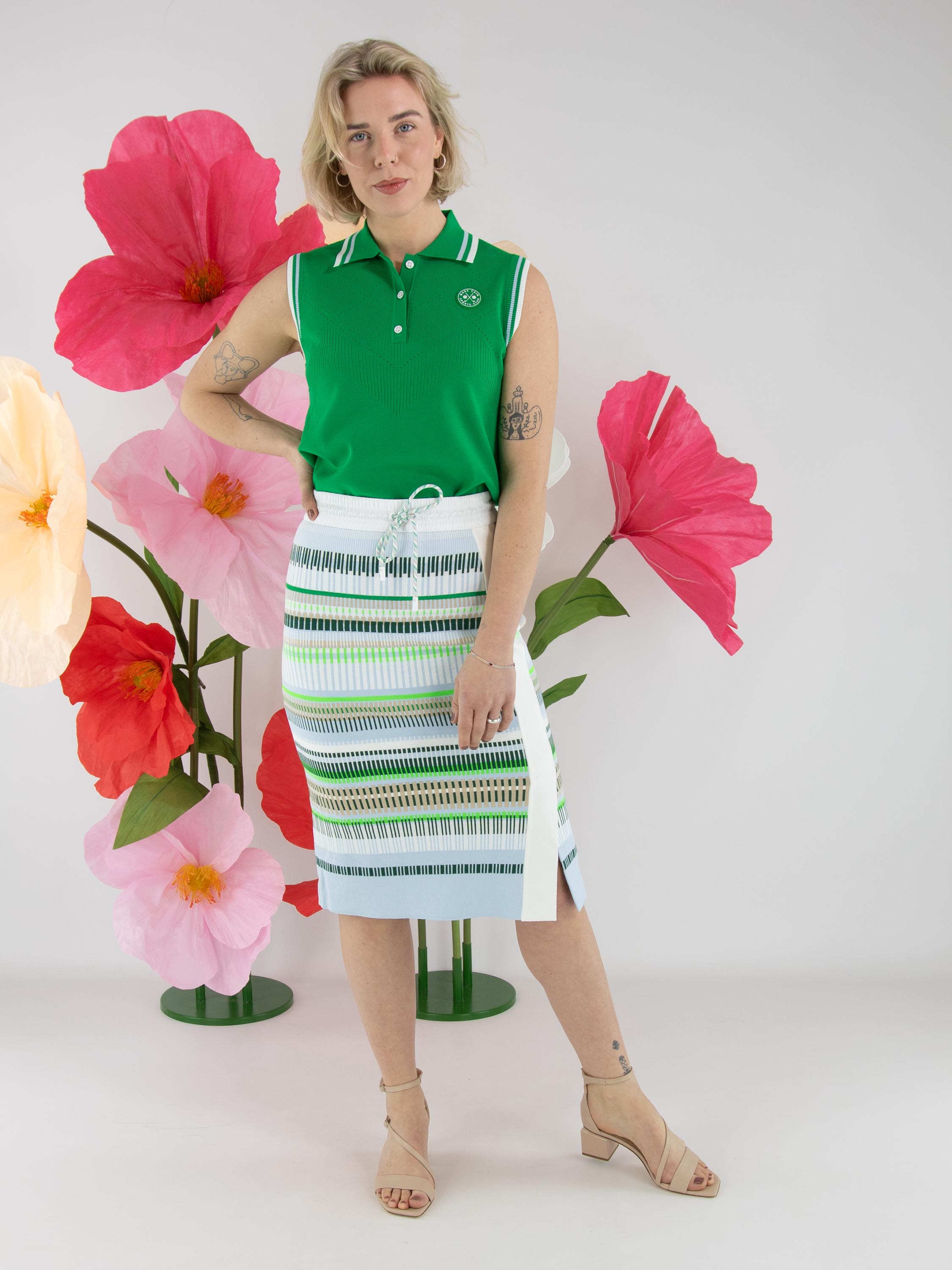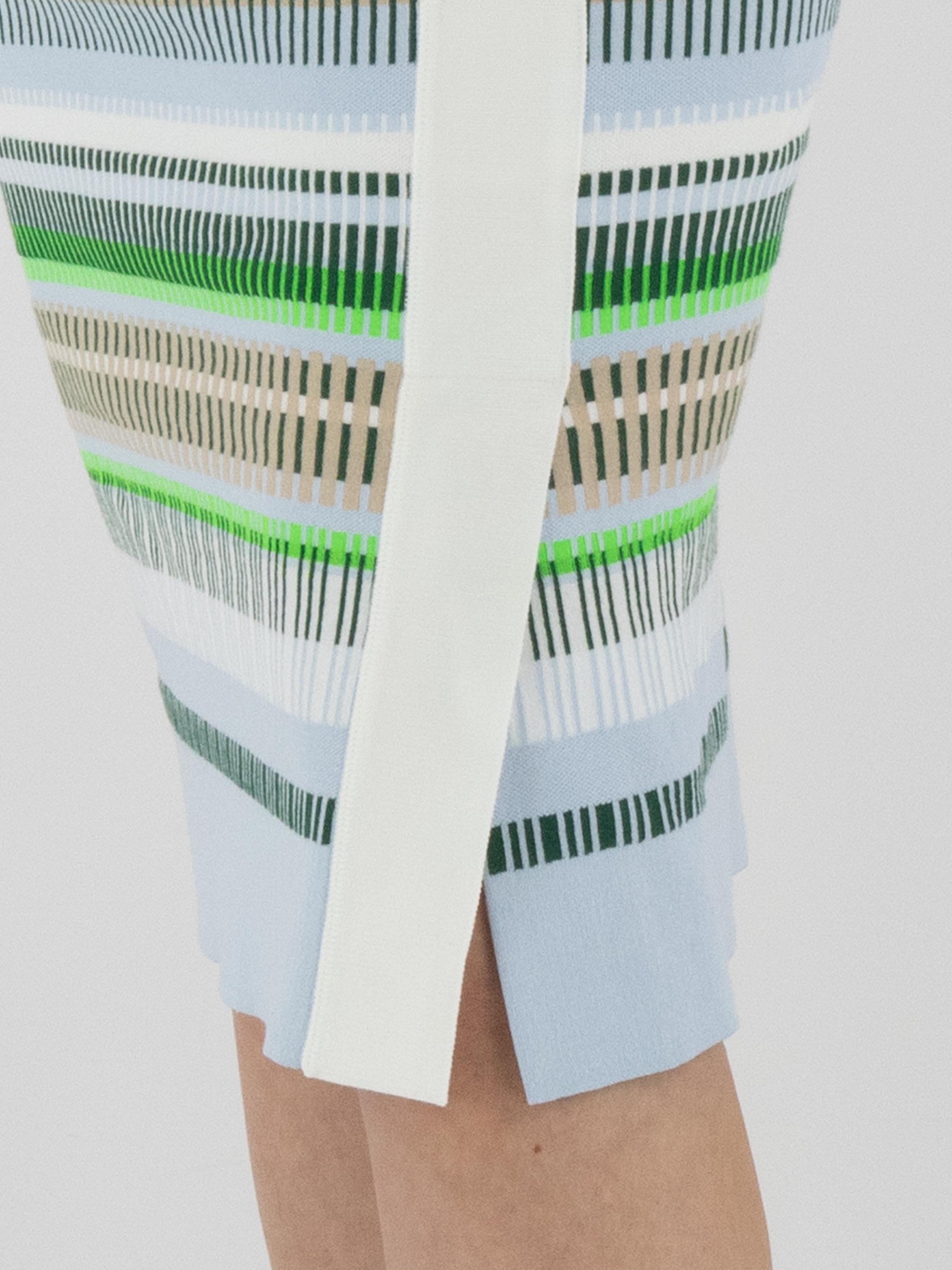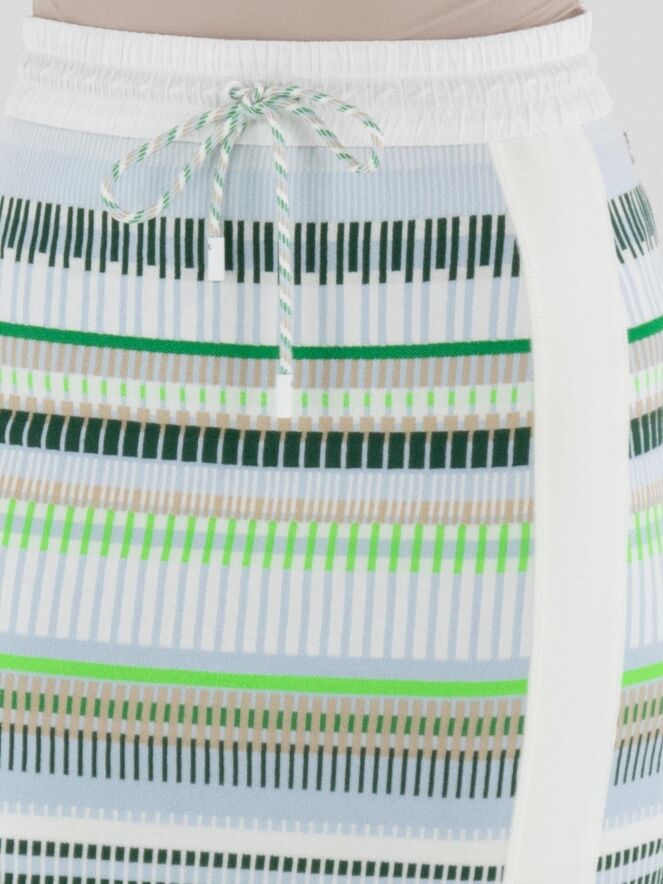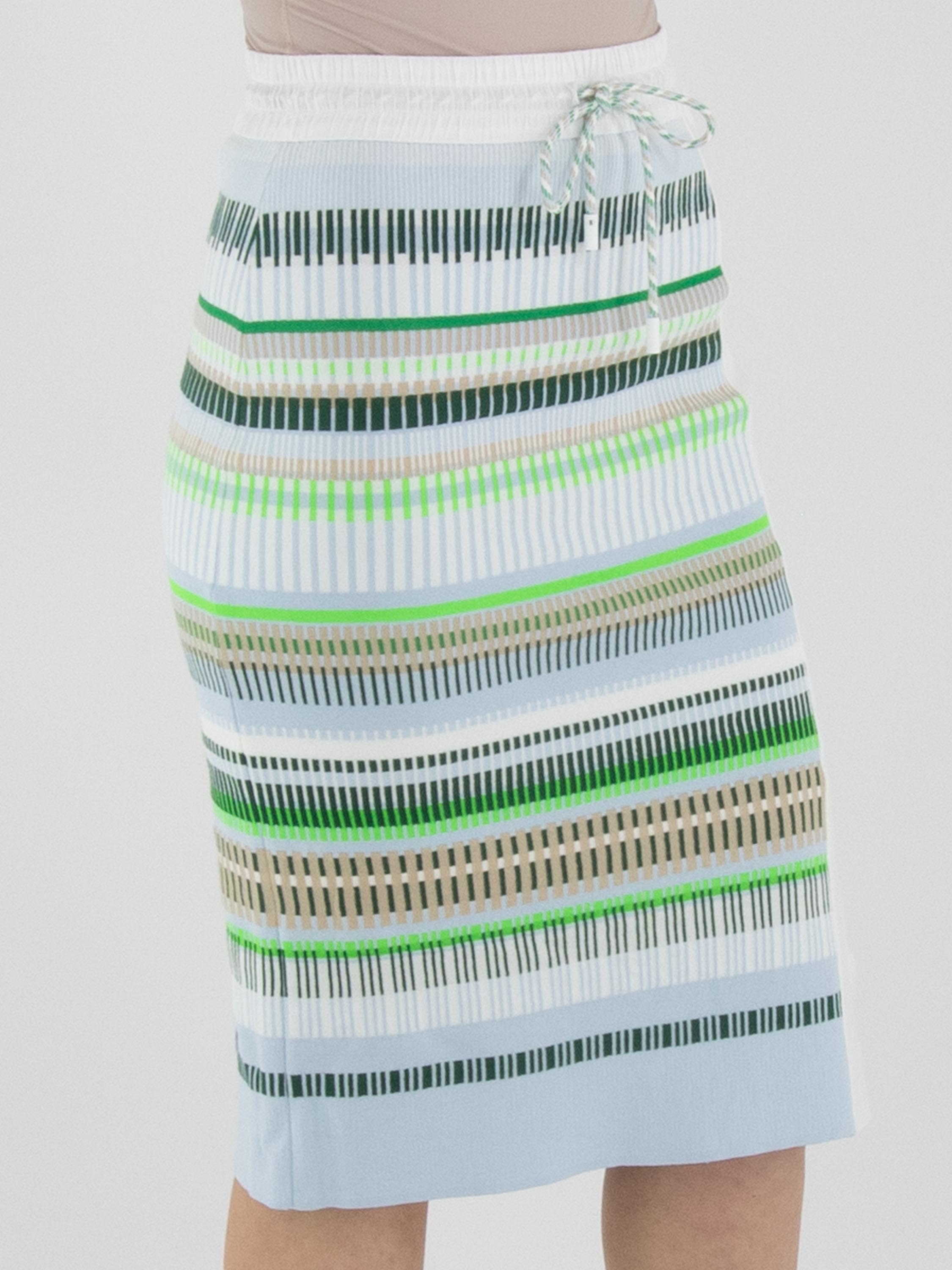 A skirt by Marc Cain featuring a striped pattern in shades of blue, sand, light and dark green, and white. The waistband is made of white elastic parachute fabric with a drawstring in a tunnel design. On the front left side, a wide vertical cream-white trim is applied, with a slit starting from the knee. The skirt is lined and can be washed at 30 degrees.