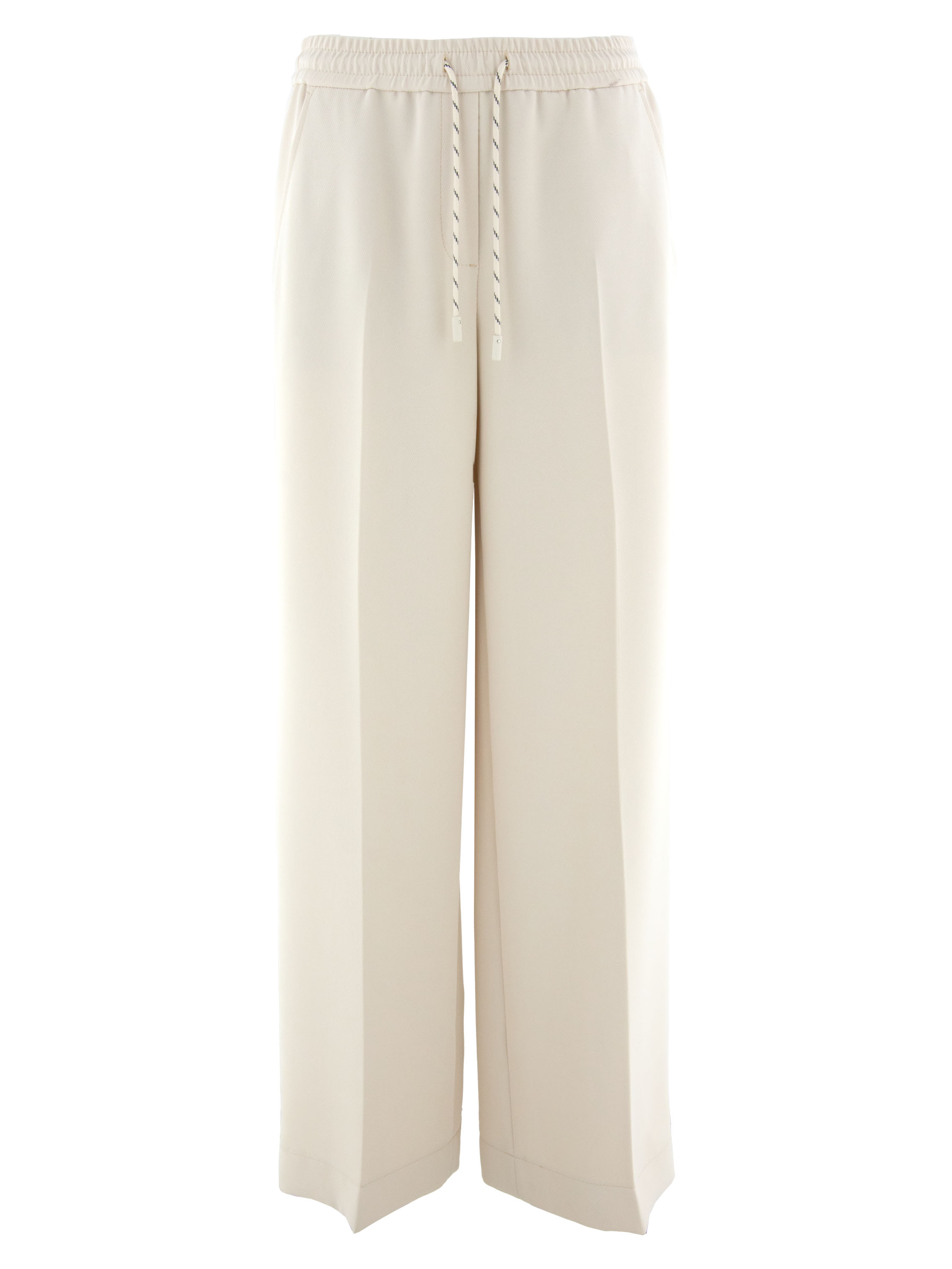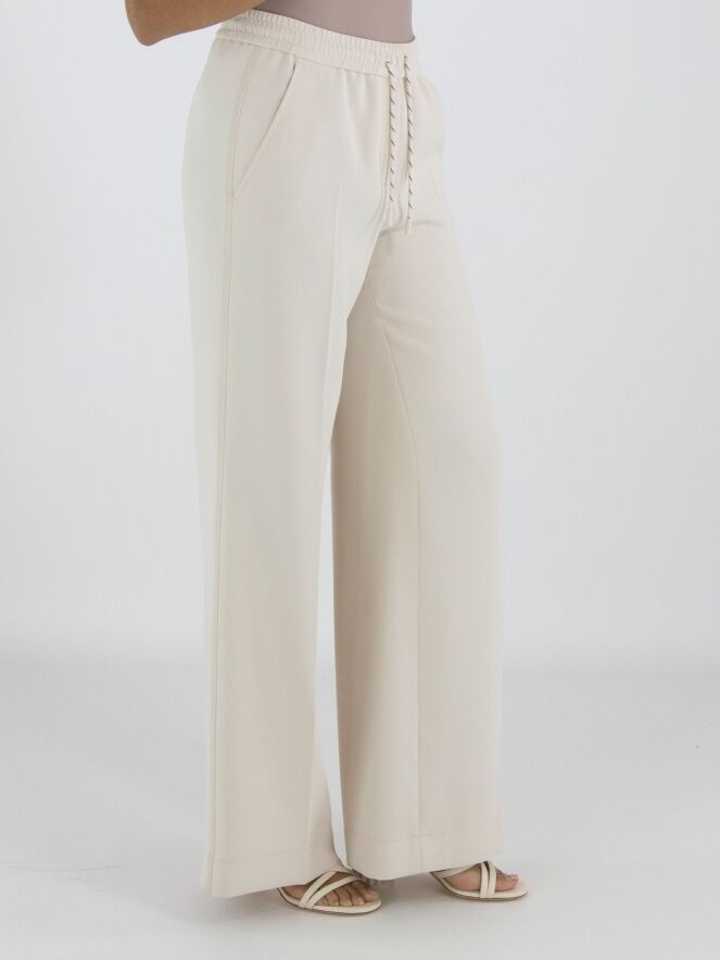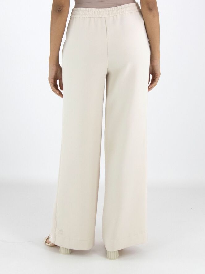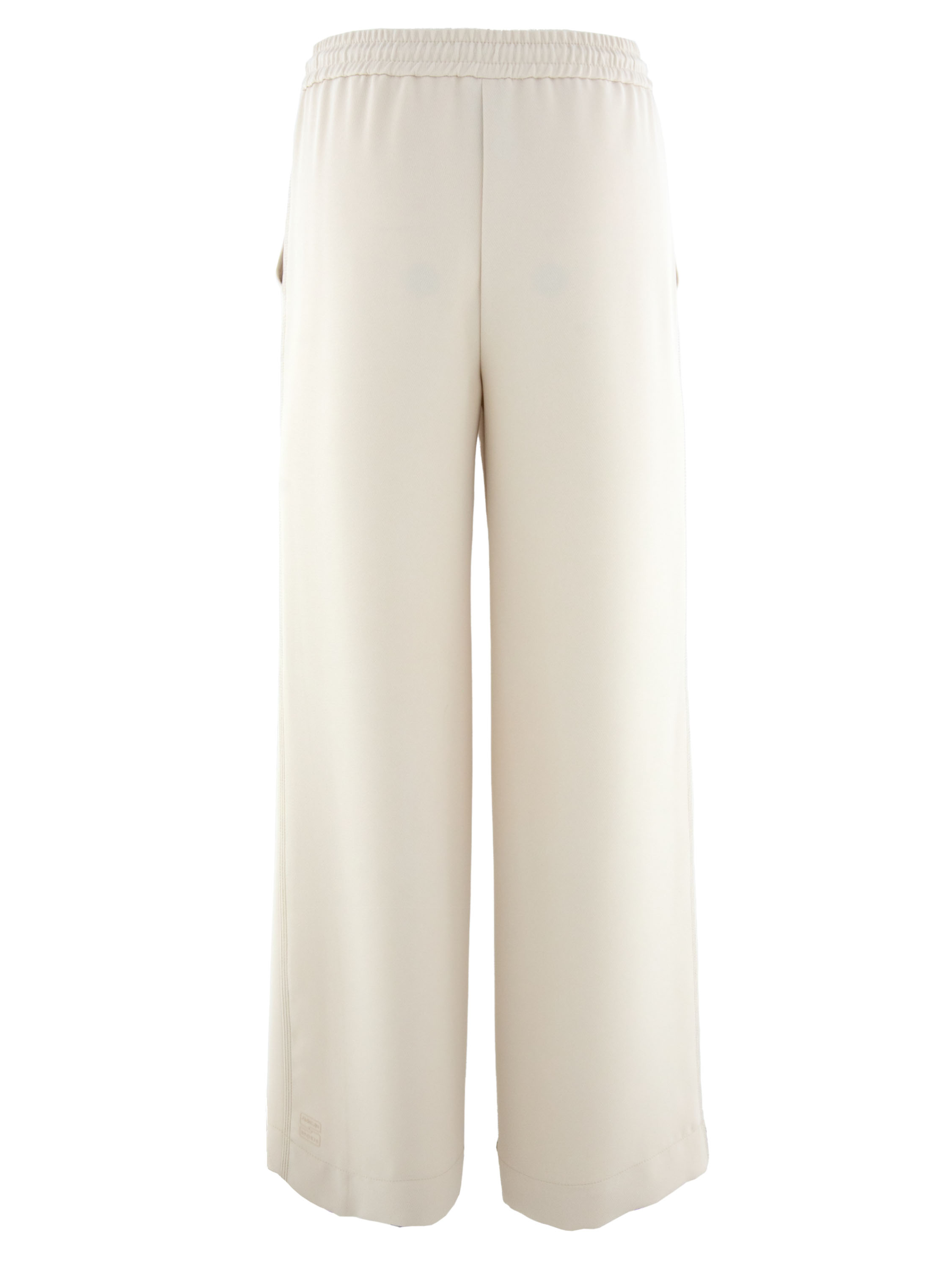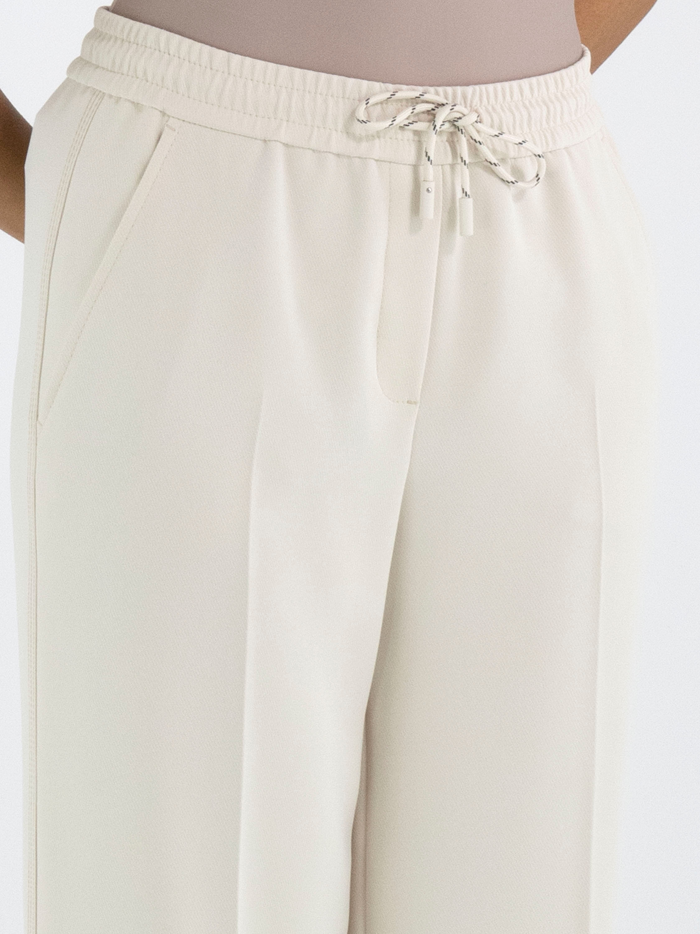 A jogger from Marc Cain in a nude colour. The waistband features a finely gathered elastic band with a drawstring in a tunnel design. A pressed crease runs down the centre of the straight-cut legs. The trousers have slit pockets, and along the sides there is a trim with three sand-coloured stitching lines. These trousers can be washed at 30 degrees.