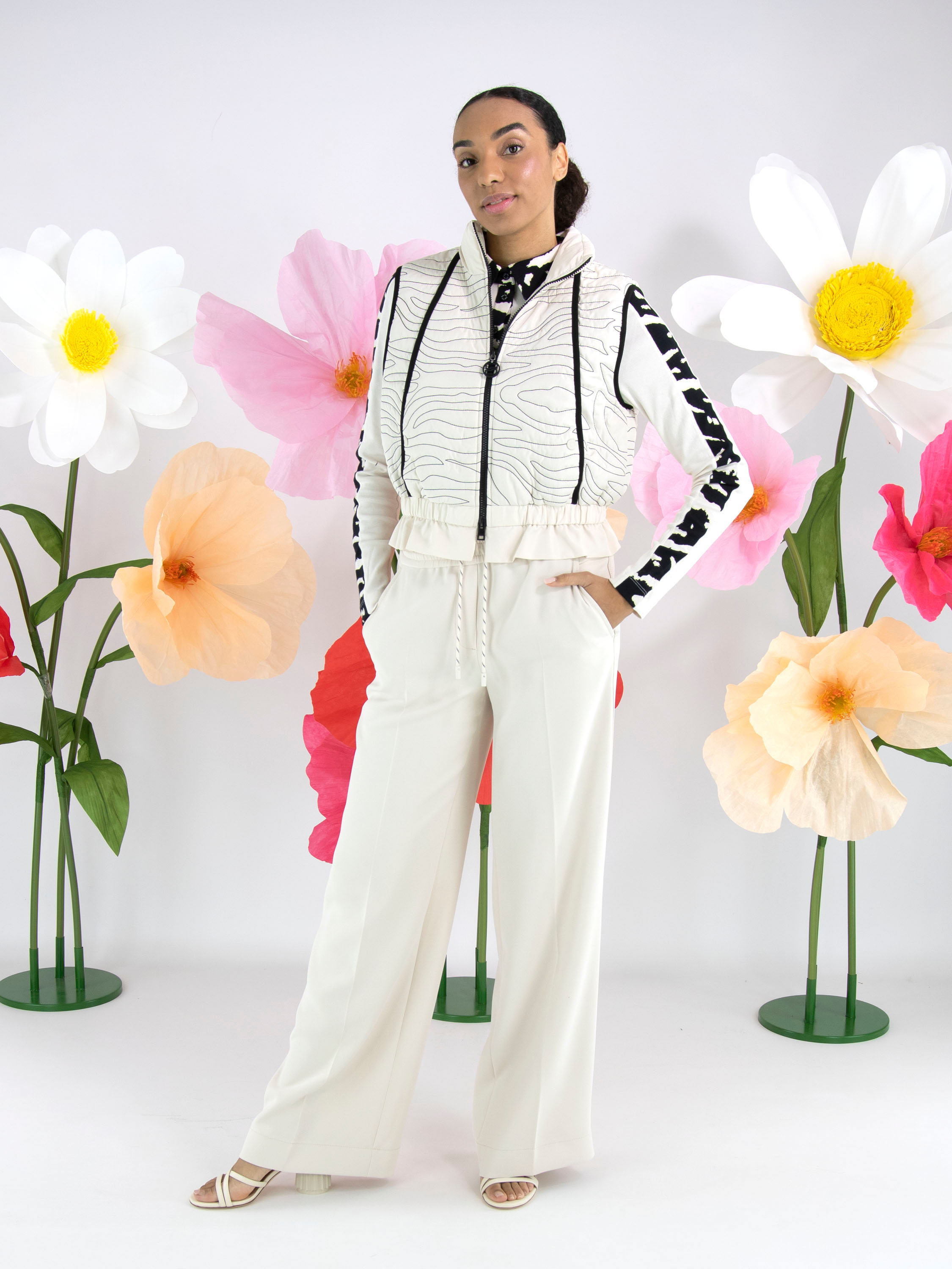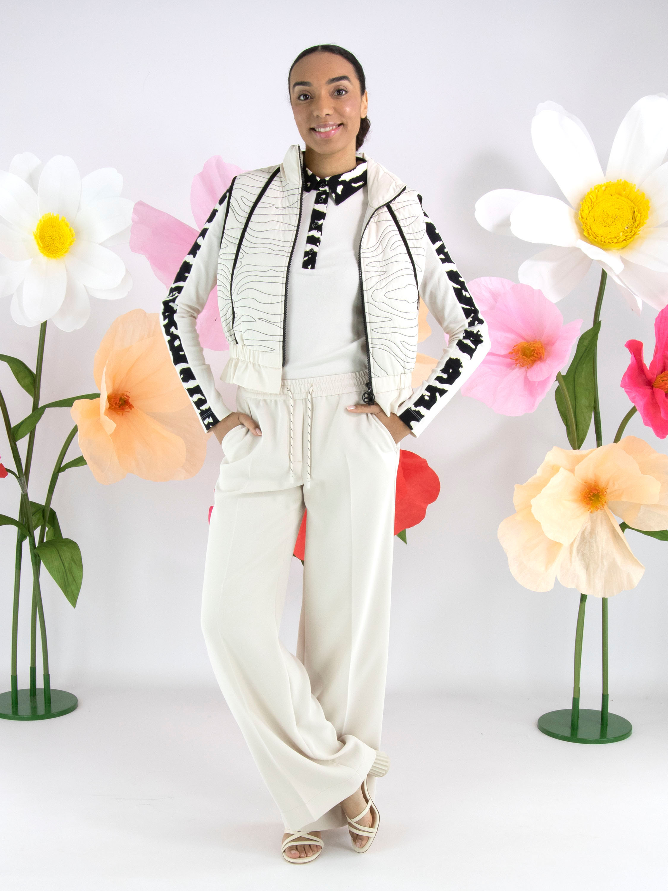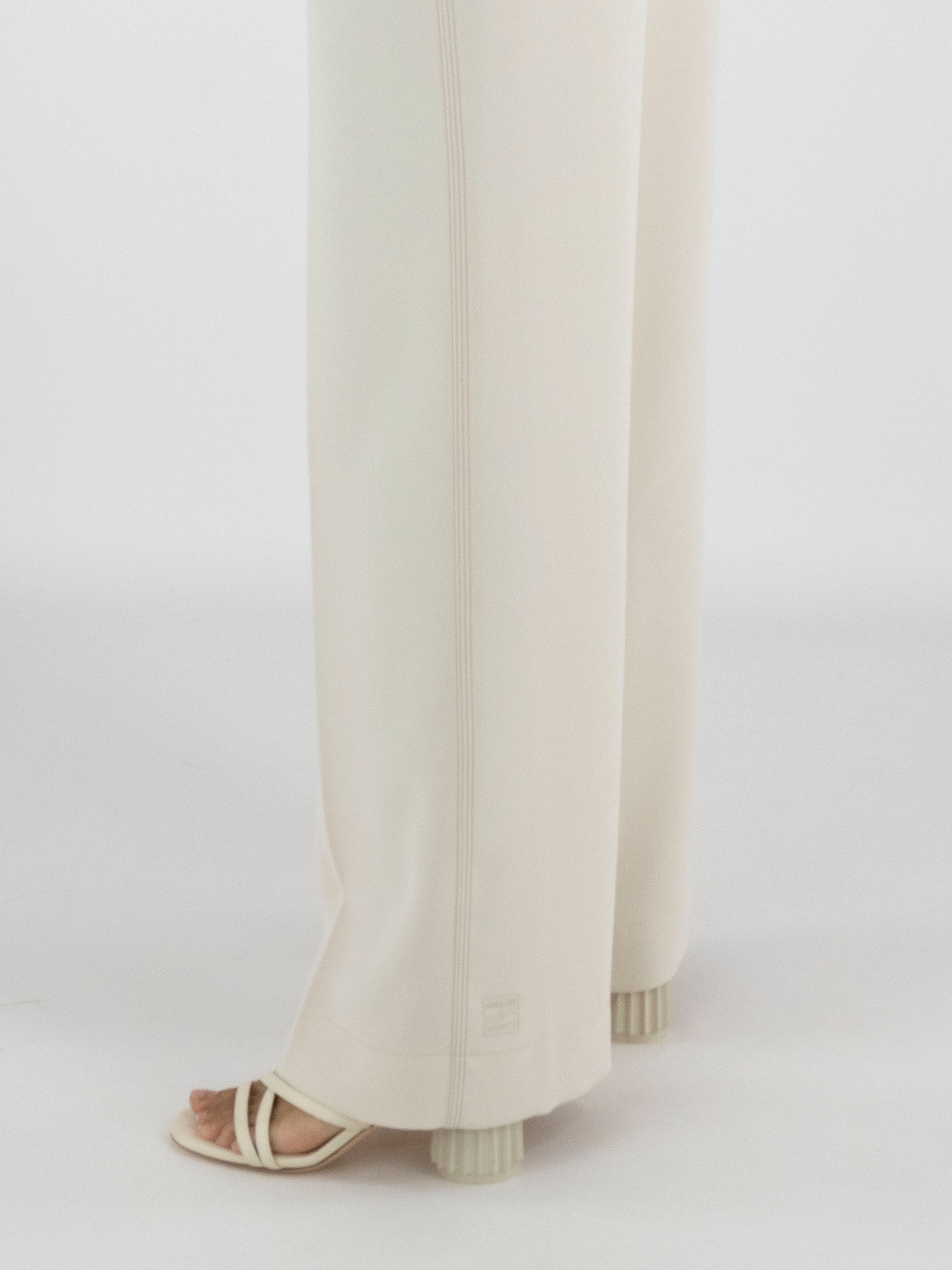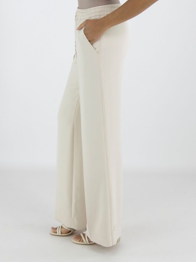 A jogger from Marc Cain in a nude colour. The waistband features a finely gathered elastic band with a drawstring in a tunnel design. A pressed crease runs down the centre of the straight-cut legs. The trousers have slit pockets, and along the sides there is a trim with three sand-coloured stitching lines. These trousers can be washed at 30 degrees.